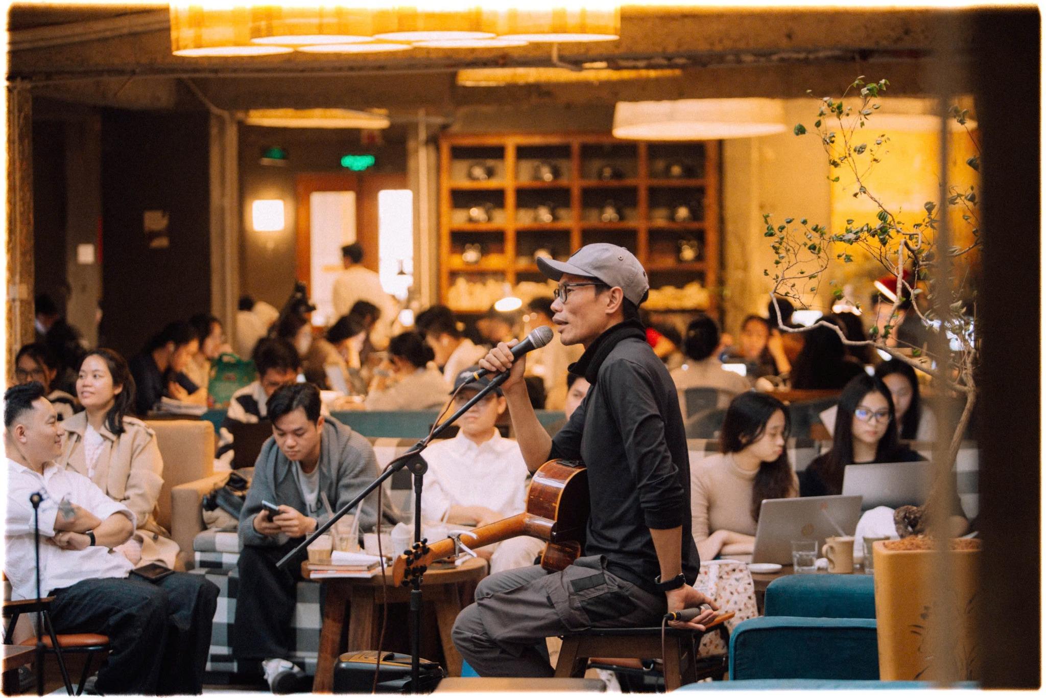 Một buổi giao lưu âm nhạc nhỏ diễn ra trong không gian quán, với khán giả ngồi xen kẽ bàn cà phê và sofa. Hoạt động này cho thấy quán linh hoạt tổ chức sự kiện nhưng vẫn giữ nhịp sinh hoạt chậm rãi.