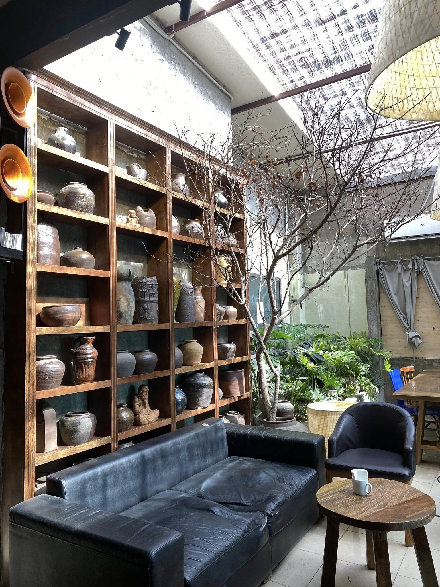 Góc ngồi thư giãn với kệ gốm, cây xanh và ánh sáng từ mái lấy sáng phía trên. Những chi tiết trang trí tạo chiều sâu thị giác nhưng không gây xao nhãng.