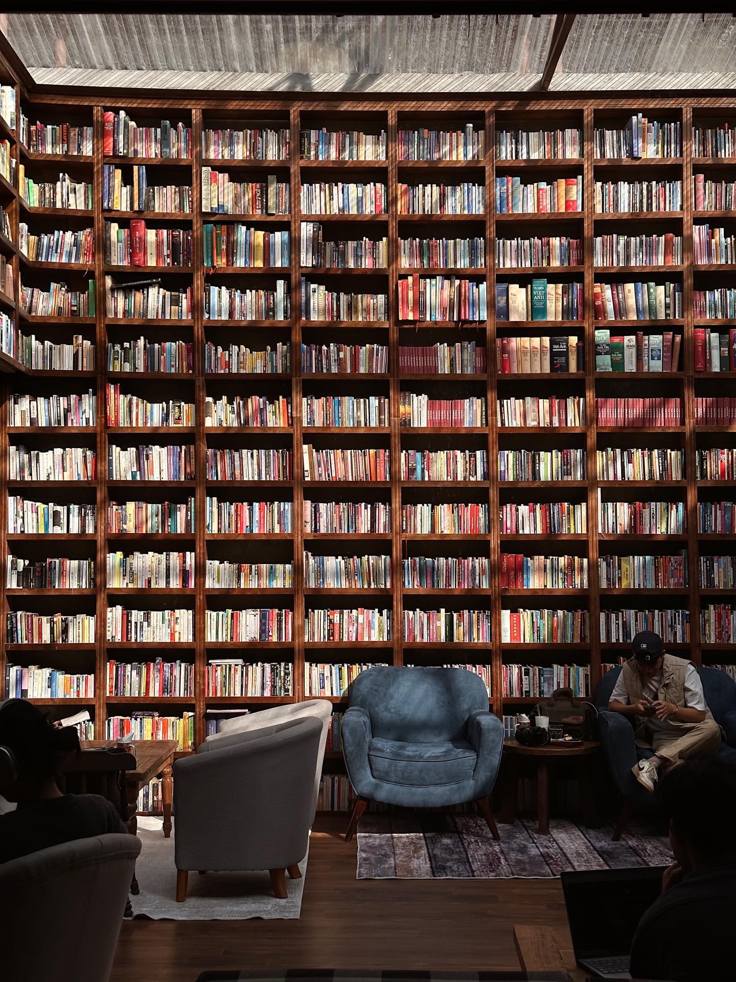 Mảng tường kệ sách cao kịch trần kết hợp ghế bành, tạo góc đọc sách yên tĩnh cho khách ngồi lâu. Bố cục giống thư viện thu nhỏ, nhấn mạnh trải nghiệm đọc hơn tiêu chí chụp ảnh.