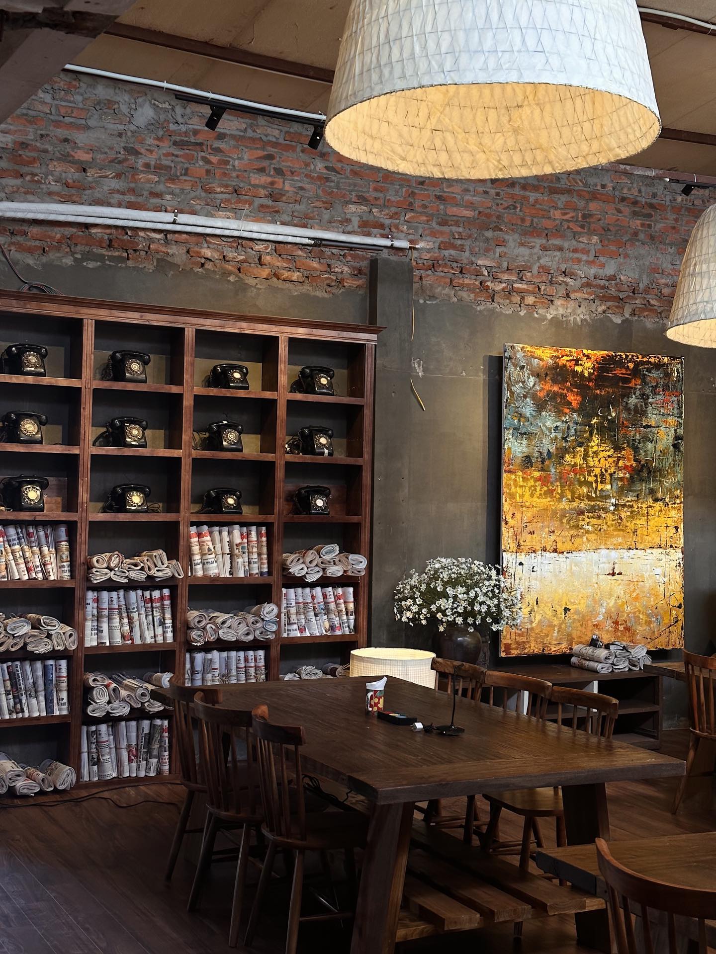 Bên cạnh sách báo, quán còn được điểm xuyết bằng nhiều món đồ cổ do chủ quán sưu tầm như đàn violin, máy ảnh hay điện thoại cũ. Những chi tiết này không quá nổi bật nhưng góp phần tạo chiều sâu thị giác, giúp không gian bớt đơn điệu mà không gây xao nhãng.