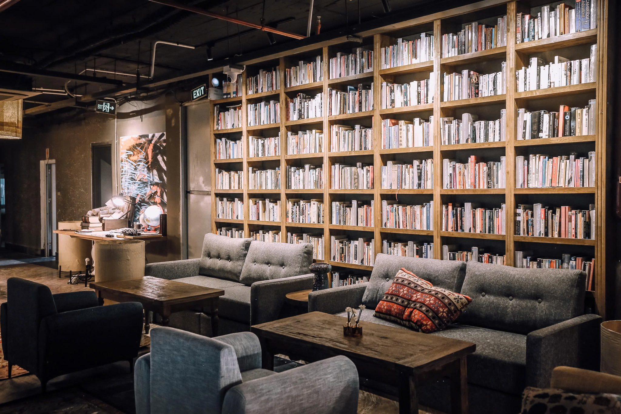 Điểm nổi bật nhất của quán nằm ở khu vực kệ sách rộng khoảng 75 m², bao quanh giếng trời và trải dài theo chiều cao của không gian hai tầng. Hệ kệ này chứa khoảng 3 tấn sách, tương đương 6.000–7.000 cuốn, được chủ quán thu gom từ nhiều nguồn trong gần hai tháng.