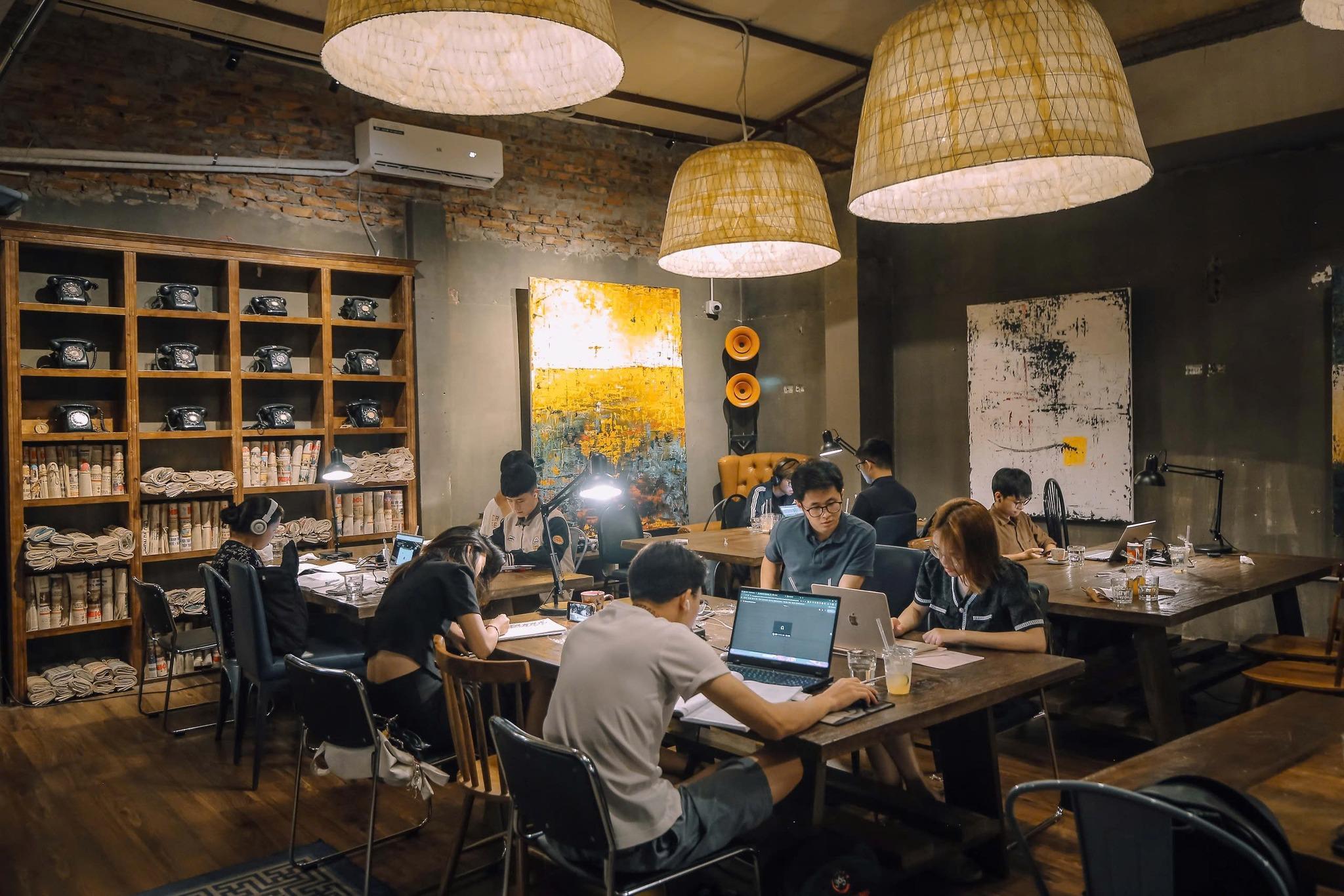 Không gian học tập chung với bàn dài, ánh đèn vàng dịu và nhiều người đang làm việc tập trung. Bố cục mở, yên tĩnh đúng tinh thần quán cà phê sách ưu tiên học tập hơn check-in.