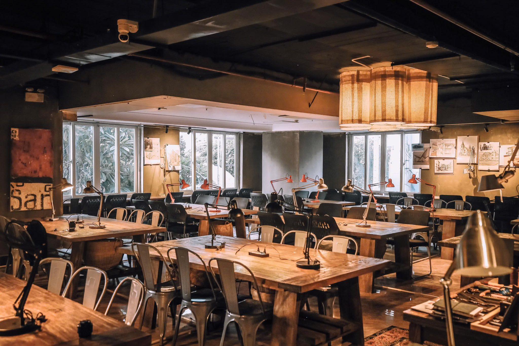 Khu ngồi học và làm việc với nhiều bàn nhỏ, đèn bàn riêng và khách tập trung sử dụng laptop, tài liệu. Ánh sáng vàng dịu kết hợp kệ sách phía sau tạo bầu không khí học tập nghiêm túc.