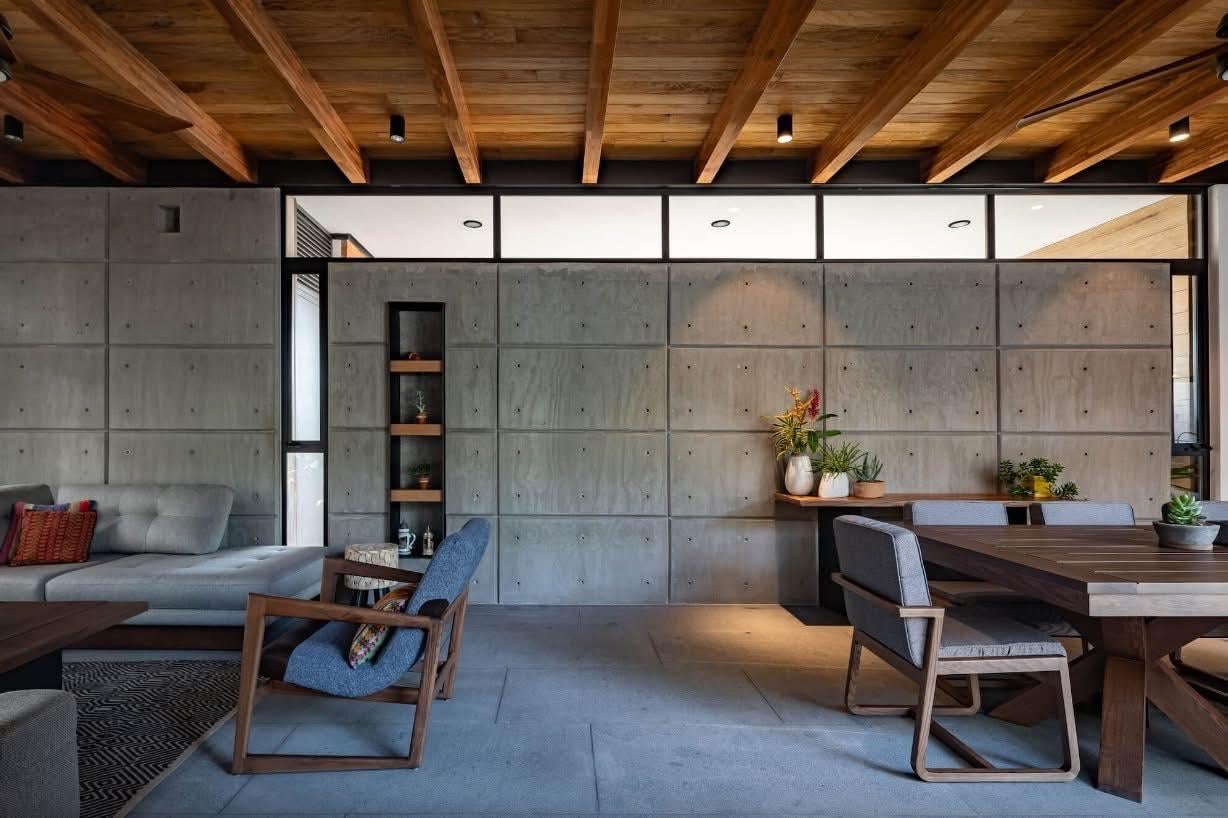 Khu sinh hoạt chung sử dụng bê tông trần và trần gỗ, tạo cảm giác ấm áp nhưng vẫn hiện đại. Việc hạn chế trang trí giúp không gian tập trung vào ánh sáng, vật liệu và trải nghiệm sử dụng hằng ngày