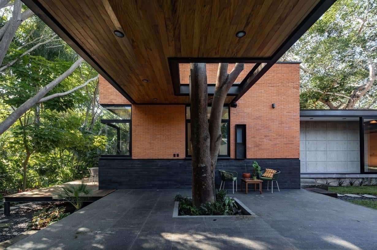 Mặt tiền biệt thự được xử lý bằng các khối gạch và mái phẳng thấp, ẩn mình dưới tán cây lớn. Thiết kế này giúp công trình hòa vào cảnh quan, hạn chế cảm giác phô trương từ bên ngoài