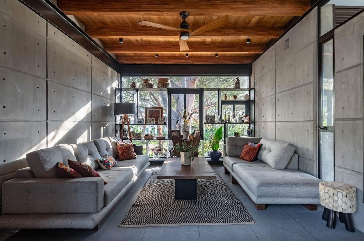 Không gian phòng khách với trần gỗ, tường bê tông trần và cửa kính mở ra khu vườn phía sau. Sự kết hợp này giúp không gian vừa ấm áp, vừa thông thoáng, tận dụng tối đa ánh sáng và cảnh quan tự nhiên