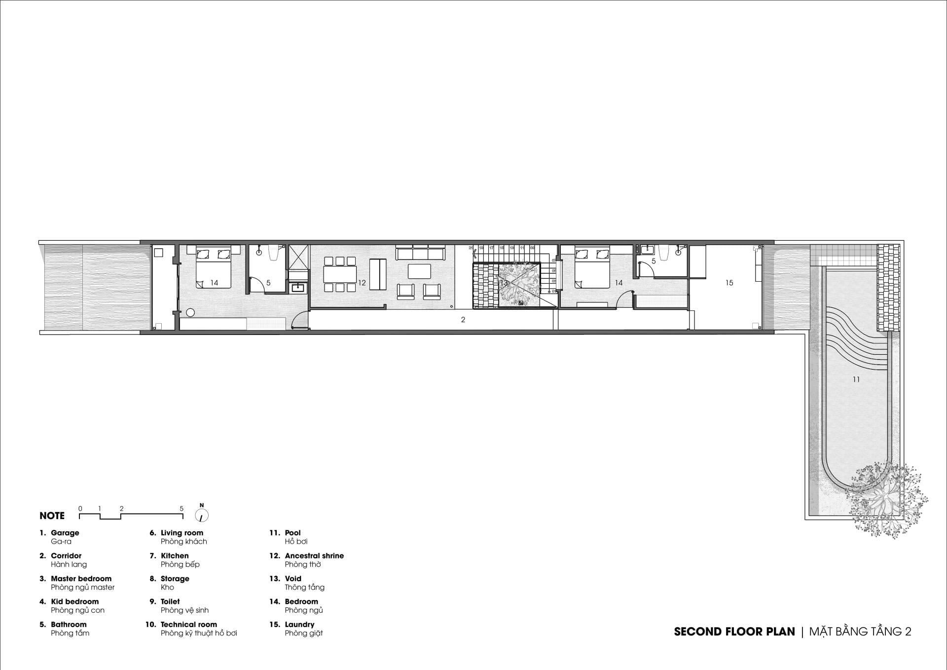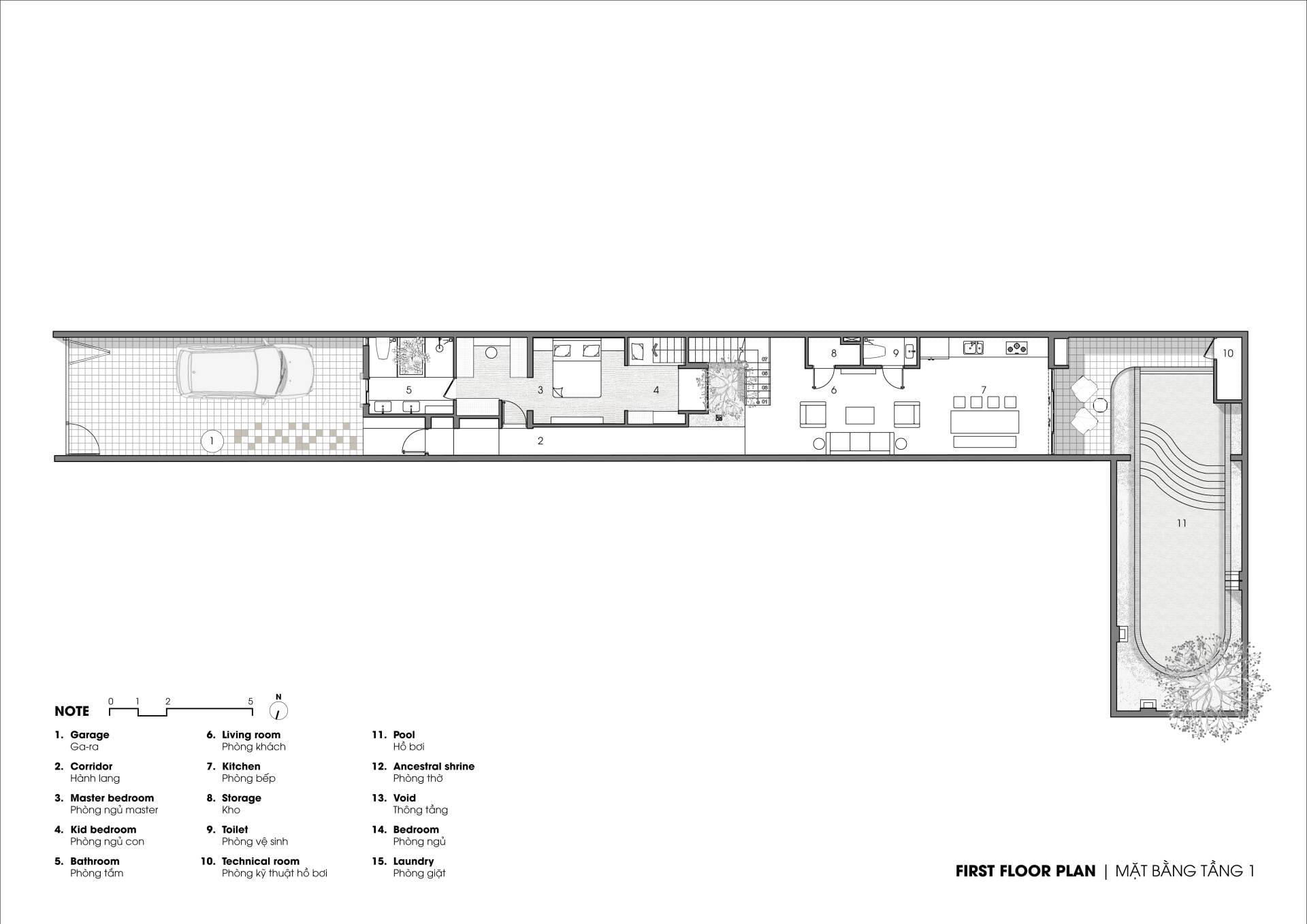Tại tầng trệt, các khối chức năng được sắp xếp theo trình tự hợp lý: bắt đầu từ khoảng sân kết hợp gara để xe, tiếp đến là khối phòng ngủ chính đảm bảo sự riêng tư, dẫn qua trục hành lang và lõi cầu thang rồi mới mở ra không gian phòng khách và bếp, điểm kết thúc là khu vực hồ bơi nằm ở cuối nhà. Trong khi đó, tầng một là nơi bố trí các phòng ngủ ở hai đầu trước sau, cùng với khu vực phòng thờ và không gian giặt phơi được đặt kín đáo ở phía cuối.