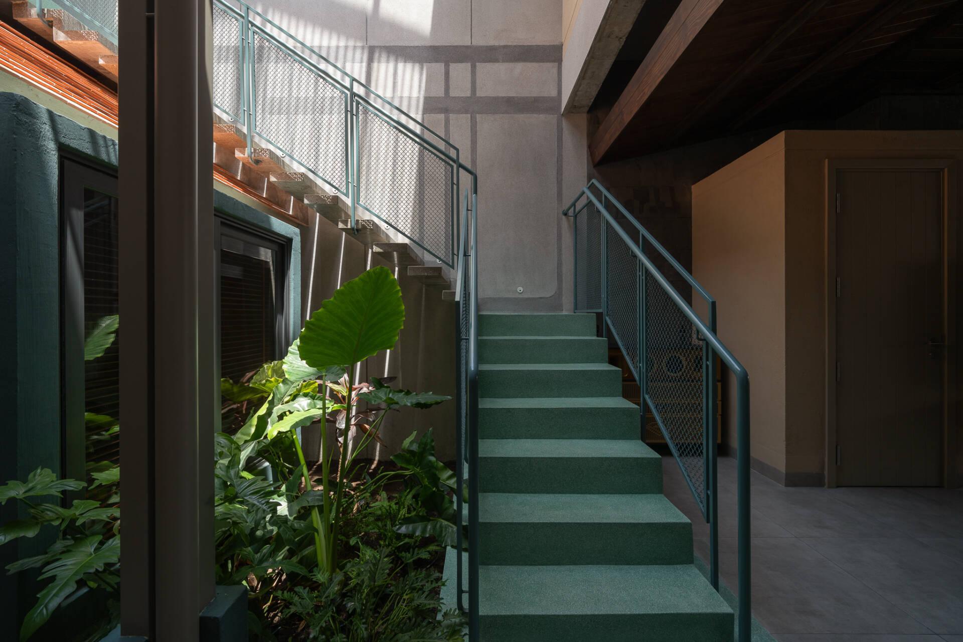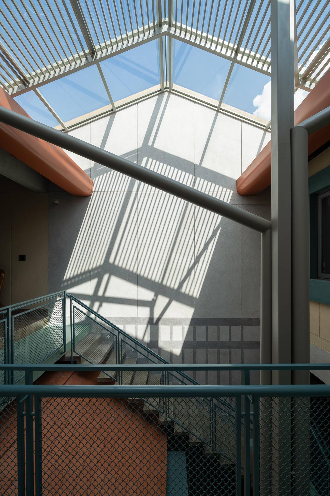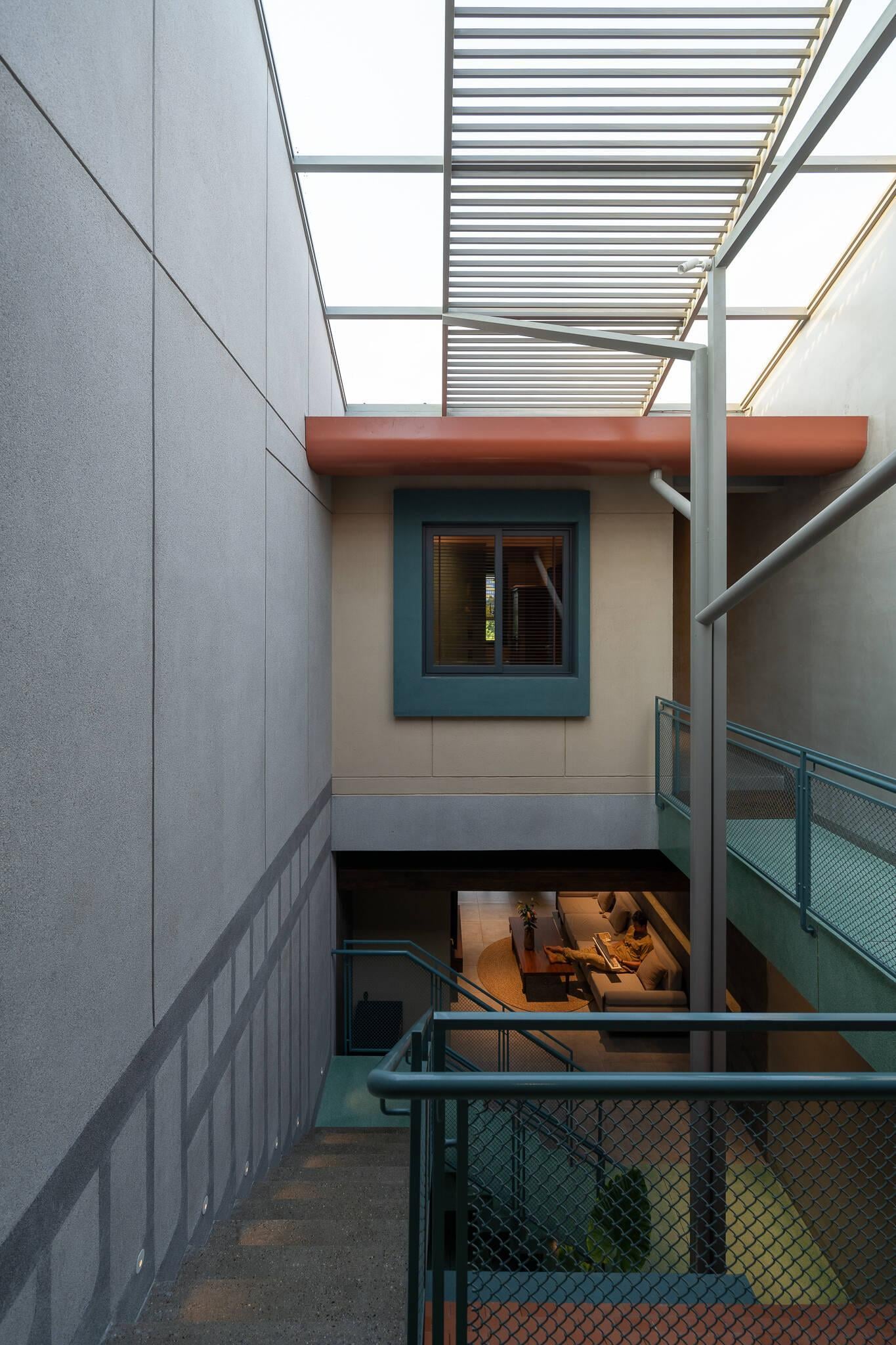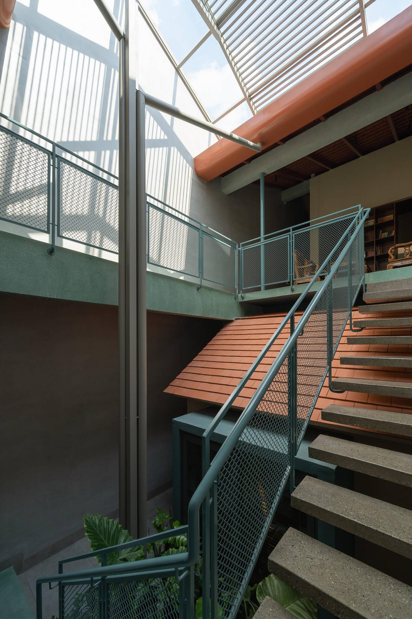 Giếng trời ở cầu thang đóng vai trò như một khoảng đệm, đưa ánh sáng len lỏi vào từng ngóc ngách
