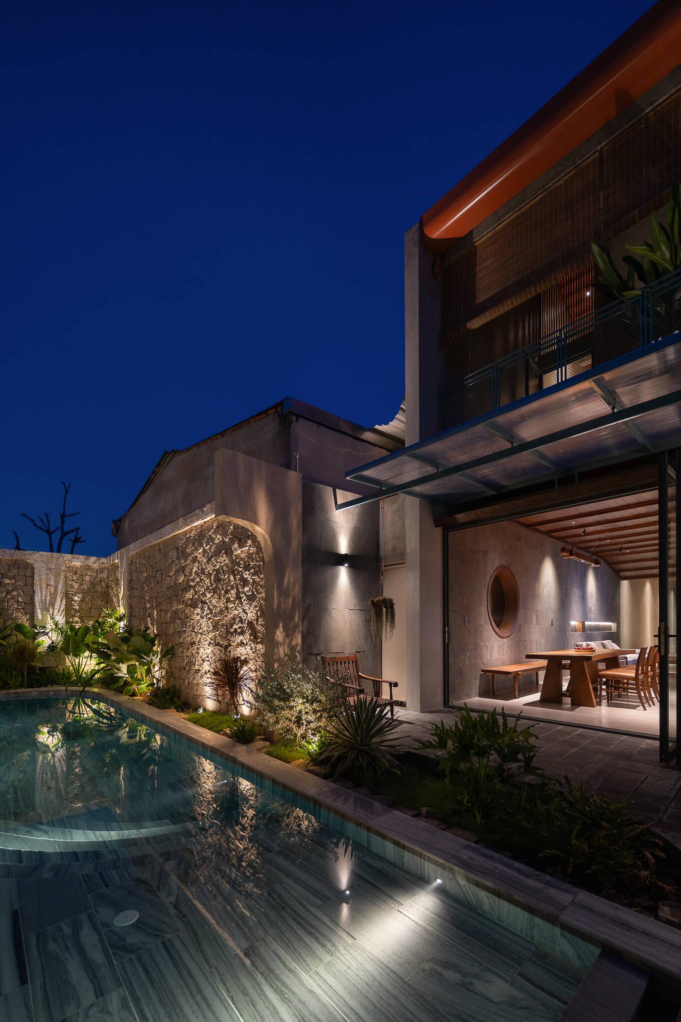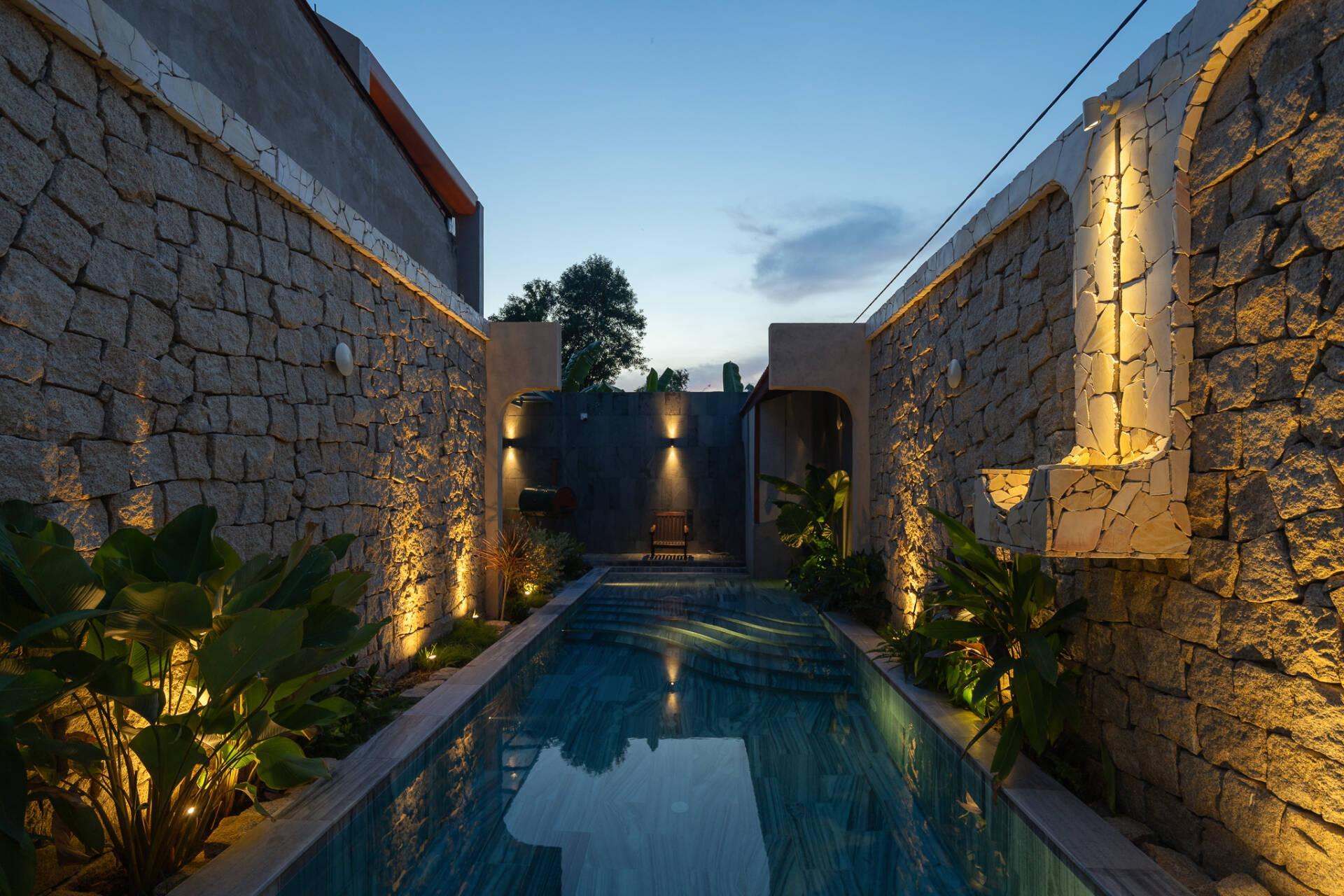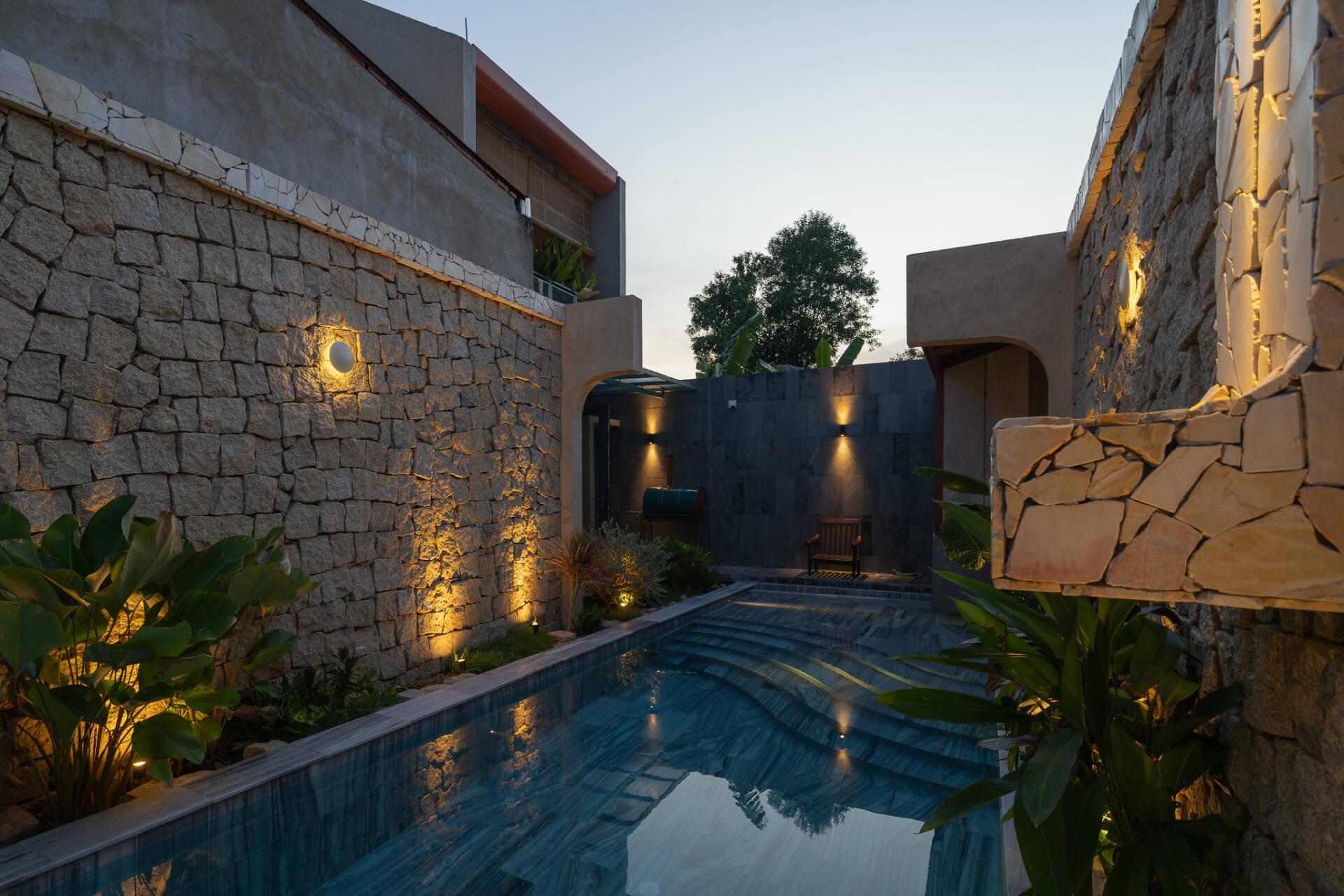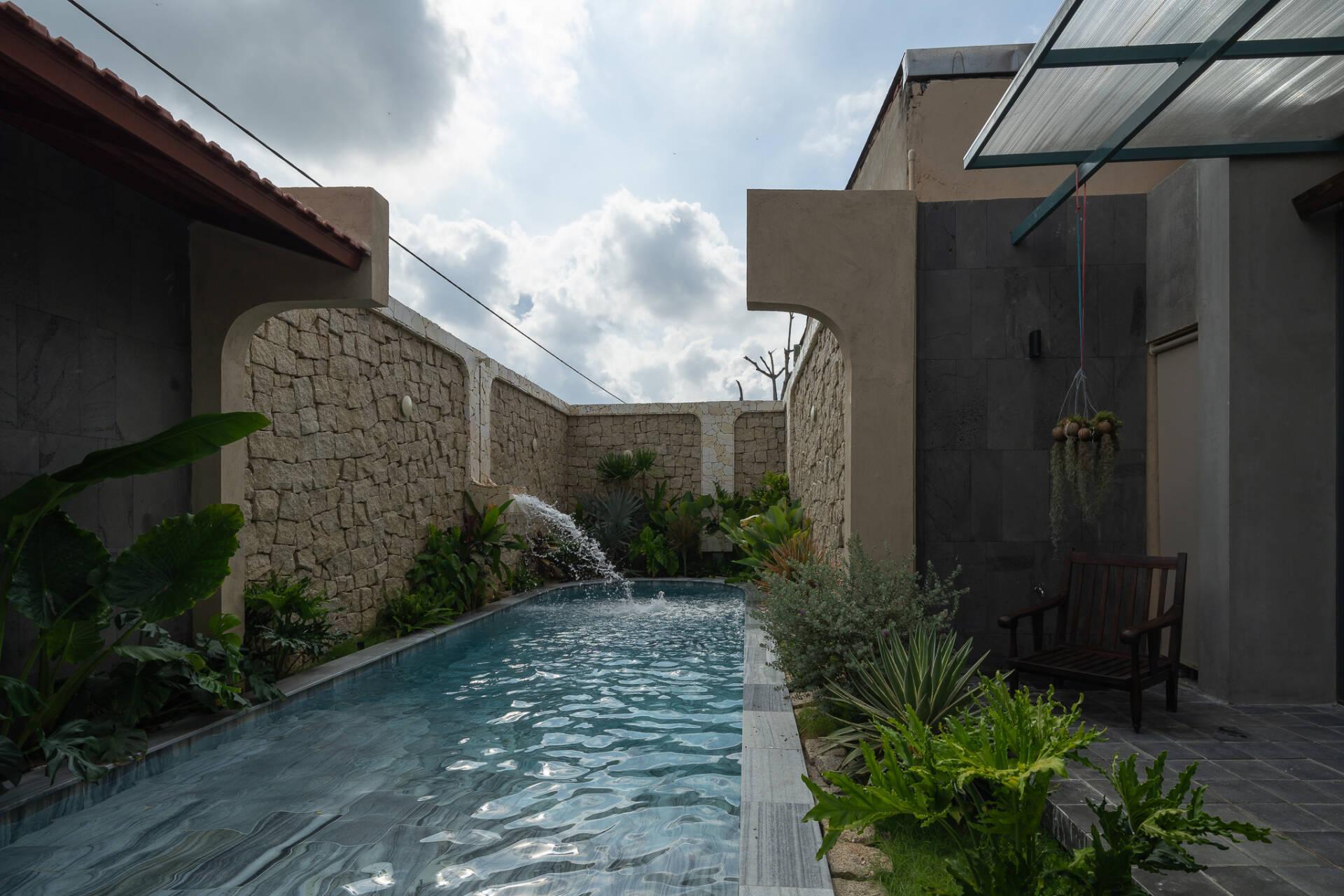 Việc bố trí hồ bơi ở vị trí sau cùng không chỉ đáp ứng nhu cầu thư giãn mà còn đóng vai trò quan trọng trong việc điều hòa vi khí hậu. Hơi nước từ mặt hồ kết hợp với luồng gió đối lưu xuyên suốt từ trục hành lang tầng trệt lên tầng một giúp giảm thiểu đáng kể lượng nhiệt, mang lại bầu không khí mát mẻ, dễ chịu cho toàn bộ công trình.