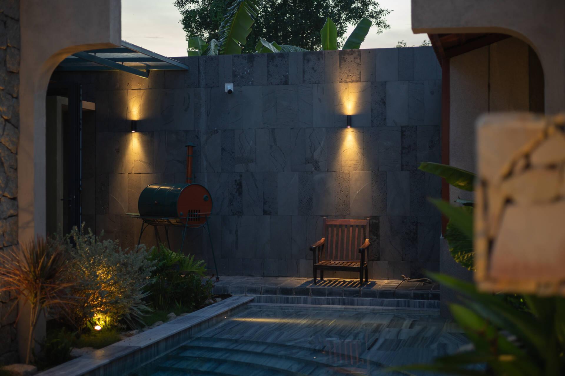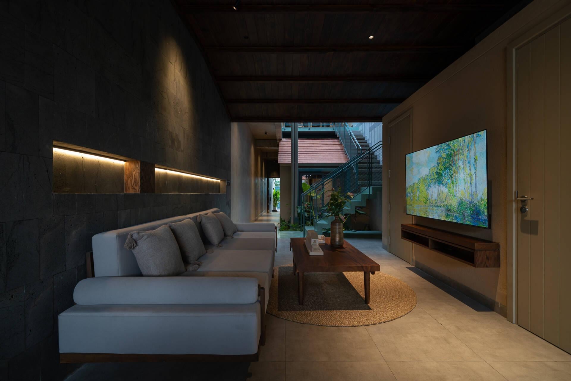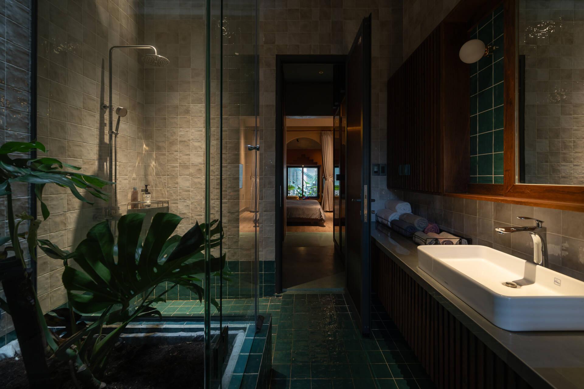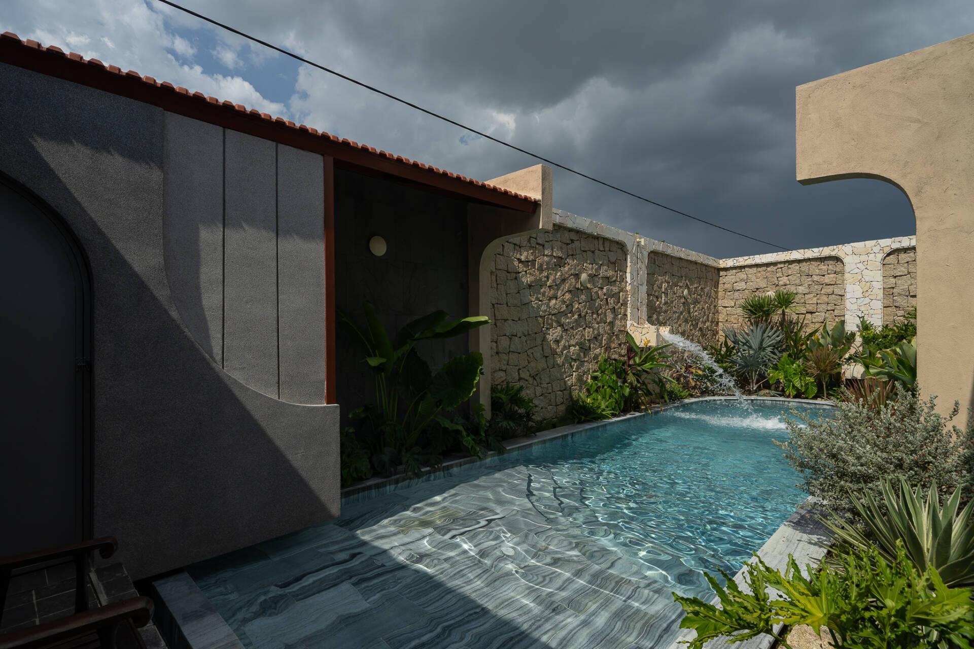 Việc bố trí hồ bơi ở vị trí sau cùng không chỉ đáp ứng nhu cầu thư giãn mà còn đóng vai trò quan trọng trong việc điều hòa vi khí hậu. Hơi nước từ mặt hồ kết hợp với luồng gió đối lưu xuyên suốt từ trục hành lang tầng trệt lên tầng một giúp giảm thiểu đáng kể lượng nhiệt, mang lại bầu không khí mát mẻ, dễ chịu cho toàn bộ công trình.