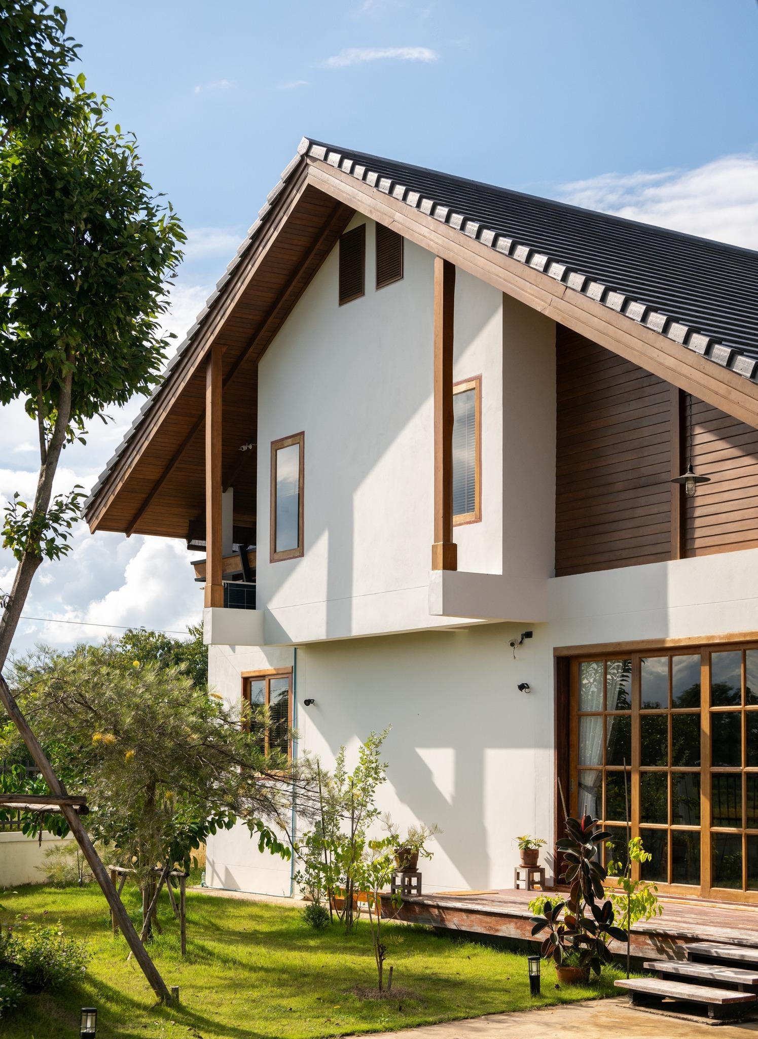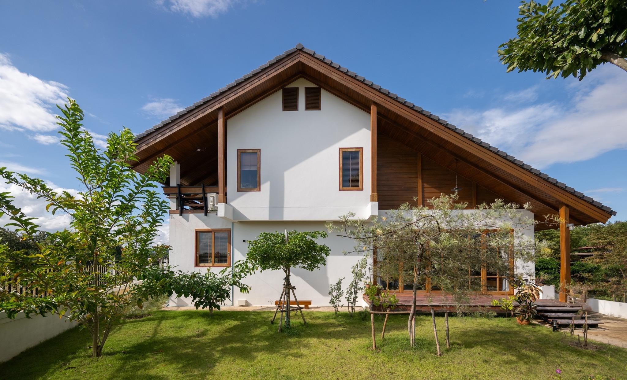 BAAN THAM MA DA xuất hiện gọn gàng giữa khu vườn xanh, nổi bật với hệ mái dốc lớn vươn rộng. Kiến trúc không áp đảo cảnh quan mà hòa vào thiên nhiên một cách tự nhiên