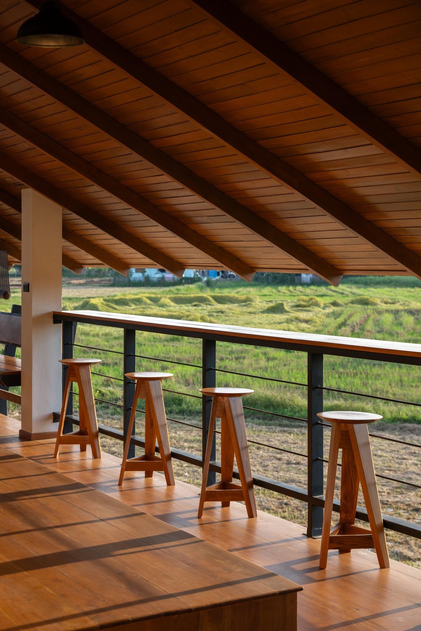 Không gian hiên dưới mái dốc bố trí đơn giản với ghế gỗ nhìn thẳng ra cánh đồng. Đây là nơi mọi người dừng lại để quan sát cảnh quan và cảm nhận nhịp sống bên ngoài