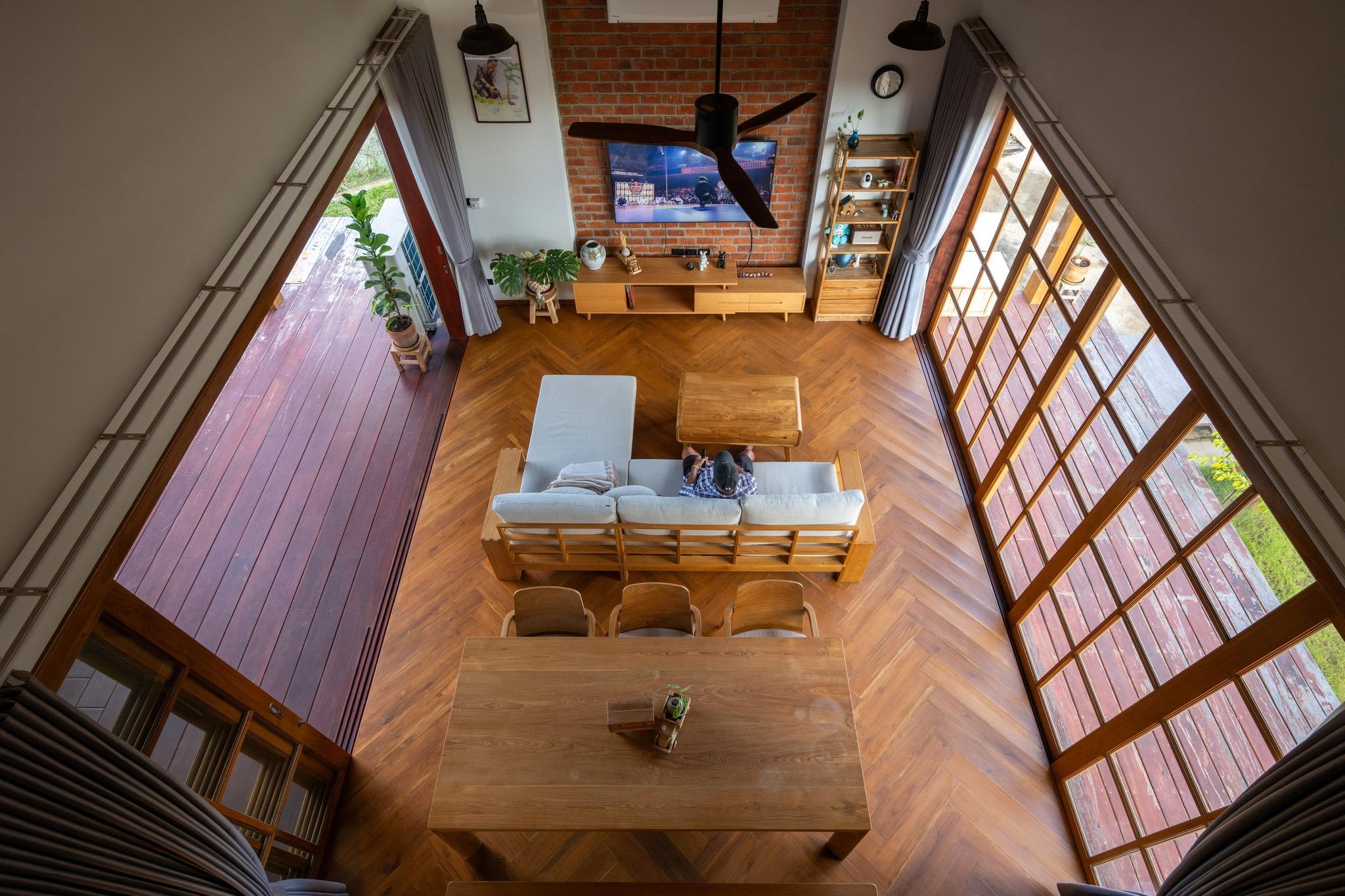 Góc nhìn từ trên cao cho thấy bố cục nội thất gọn gàng và rõ ràng. Ánh sáng tự nhiên đi sâu vào không gian qua hệ cửa lớn, làm nổi bật bề mặt gỗ ấm áp