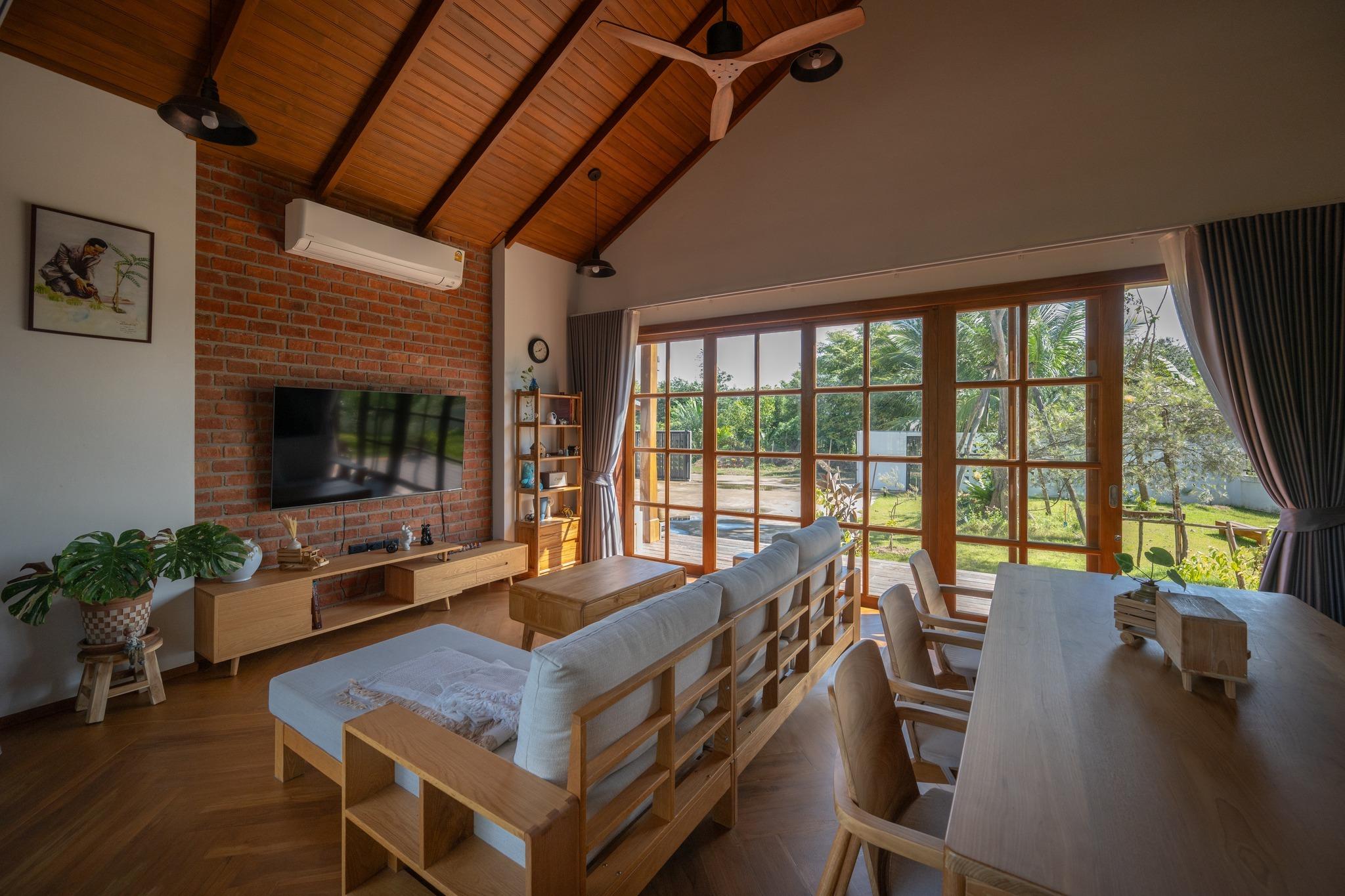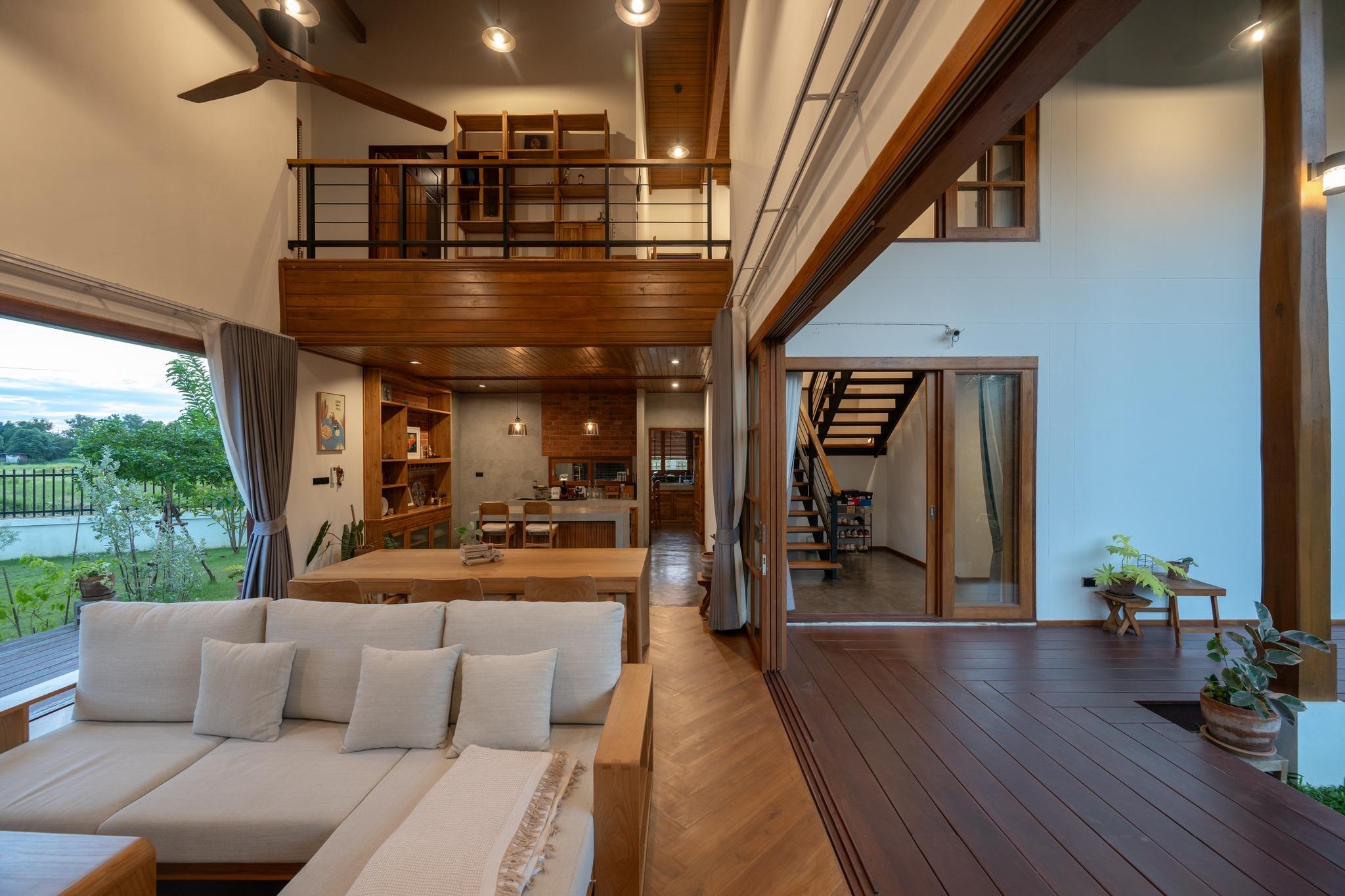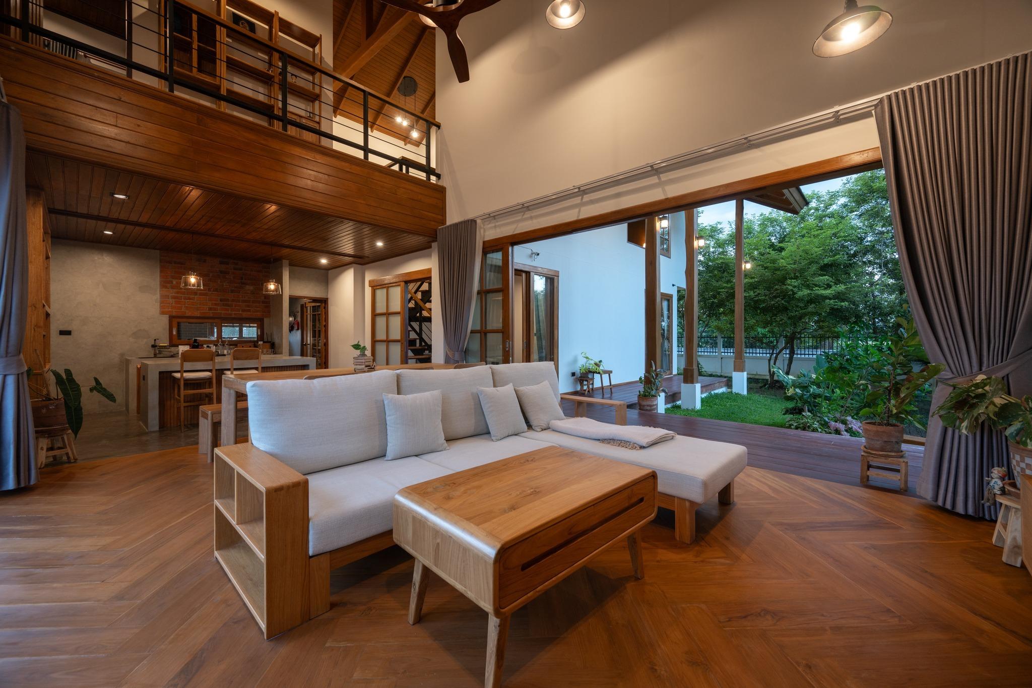 Bước vào bên trong BAAN THAM MA DA, cảm giác dễ nhận thấy nhất là sự thoáng đãng và ấm áp được tạo nên từ cách tổ chức không gian và lựa chọn vật liệu. Không gian sinh hoạt chung thiết kế mở với trần cao theo mái dốc để lộ kết cấu gỗ. Cách xử lý này không nhằm gây ấn tượng thị giác mạnh, mà hướng đến cảm giác dễ chịu, phù hợp với sinh hoạt lâu dài.