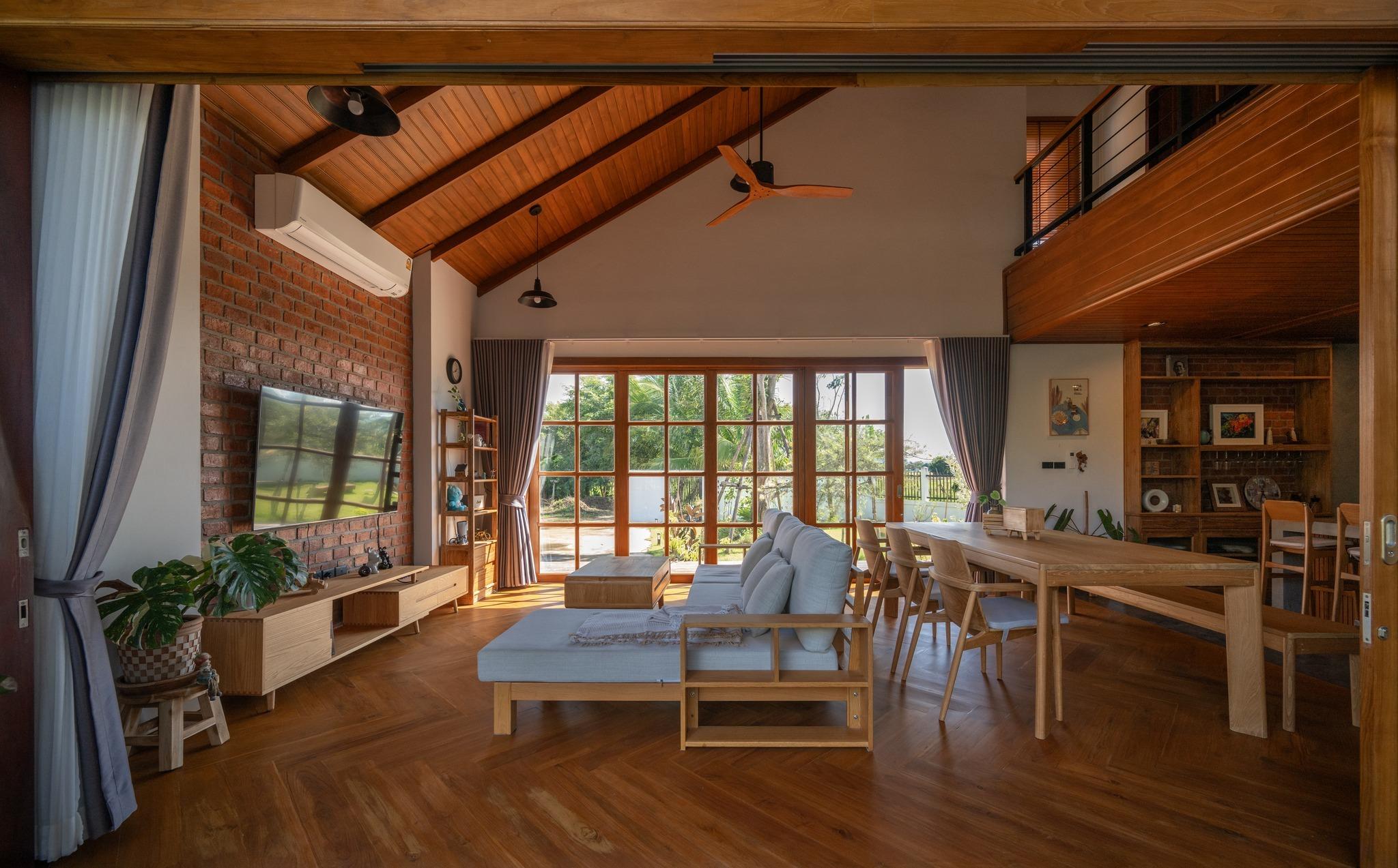 Không gian sinh hoạt chung thiết kế trần cao theo mái dốc, tăng độ thoáng và chiều sâu thị giác.