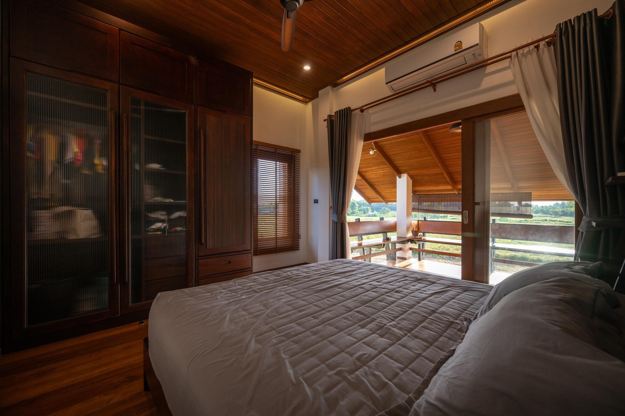 Phòng ngủ thiết kế yên tĩnh với giường gỗ, sàn gỗ và trần ốp gỗ đồng bộ. Cửa kính mở ra ban công giúp không gian luôn thoáng và gần gũi với thiên nhiên