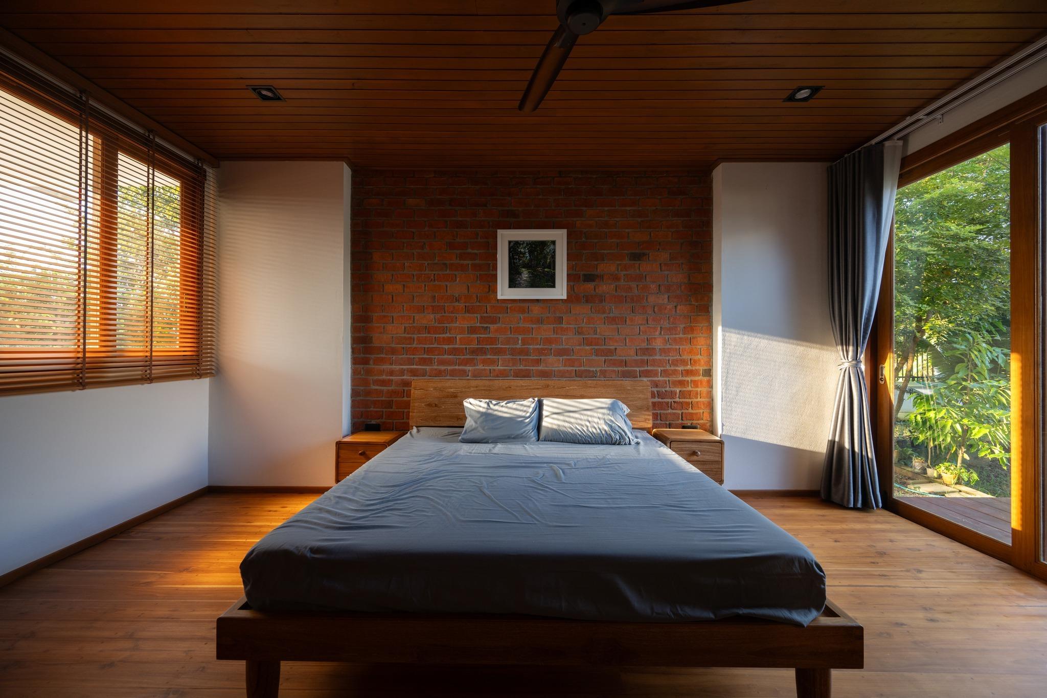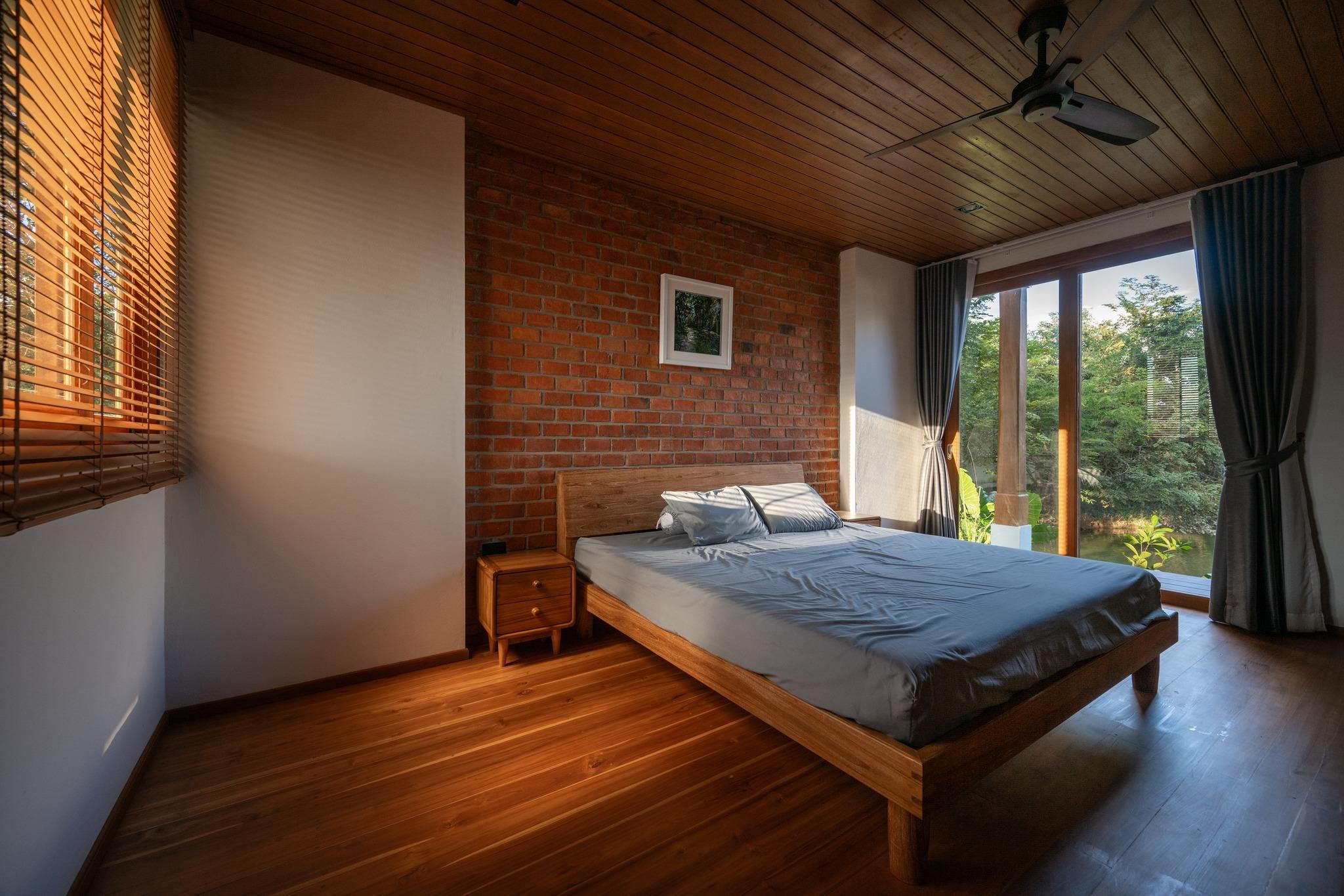 Phòng ngủ giữ bố cục cân đối, tập trung vào giường ngủ như trung tâm không gian. Vật liệu gỗ và tường gạch trần mang lại cảm giác ấm áp và ổn định