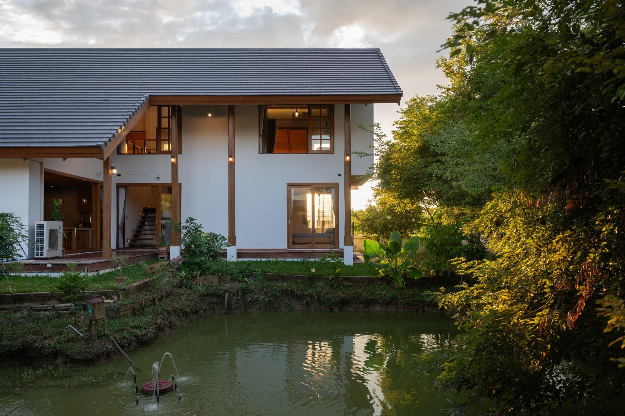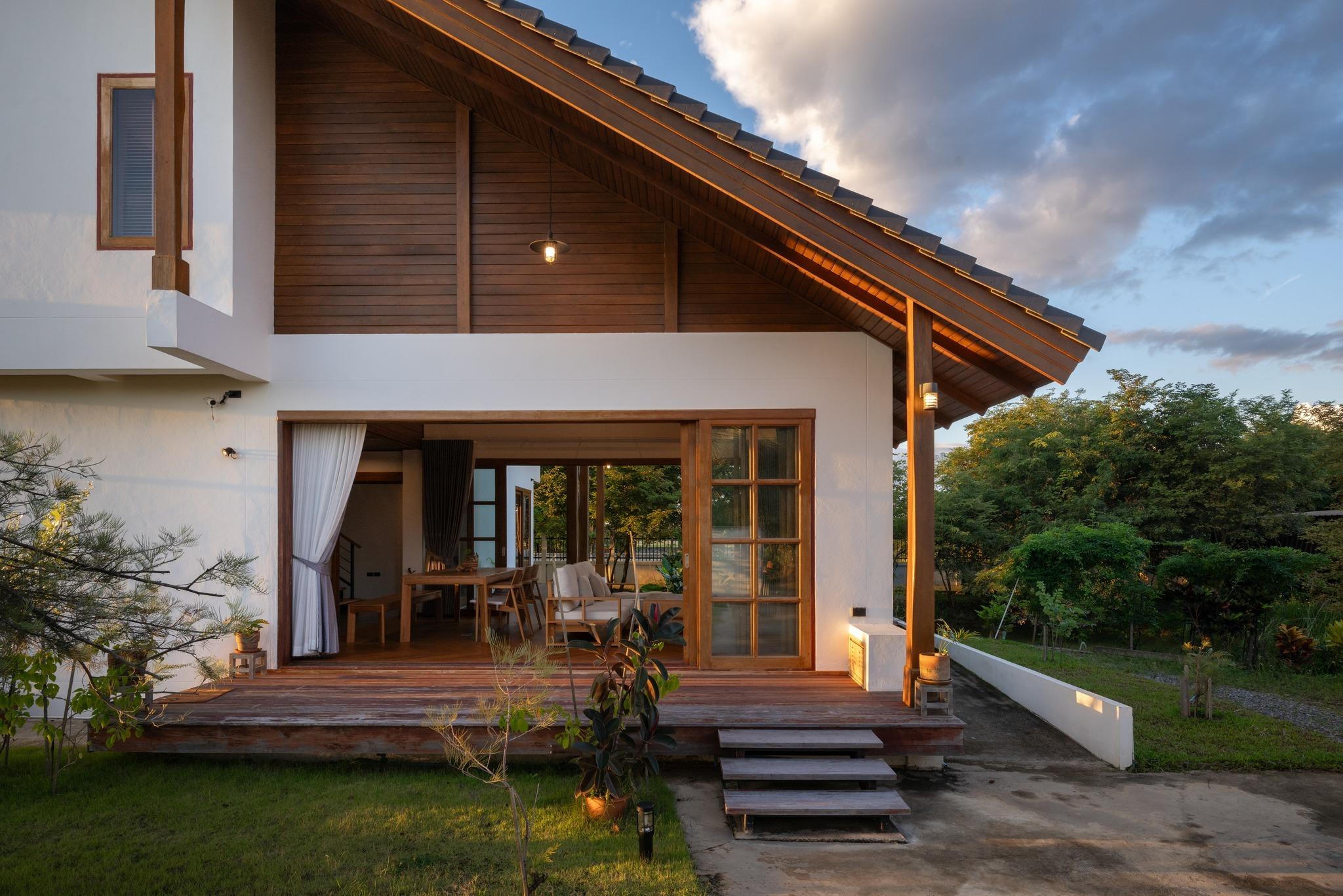 Mặt tiền công trình tổ chức theo tinh thần mở nhưng tiết chế. Các mảng tường trắng phẳng kết hợp hệ cột gỗ, trần hiên ốp gỗ và cửa kính khung gỗ lớn tạo nên tổng thể hài hòa giữa kiến trúc và thiên nhiên. Những khoảng hiên sâu đóng vai trò như vùng đệm chuyển tiếp, giúp giảm tác động trực tiếp của nắng mưa, mở ra không gian sinh hoạt bán ngoài trời.