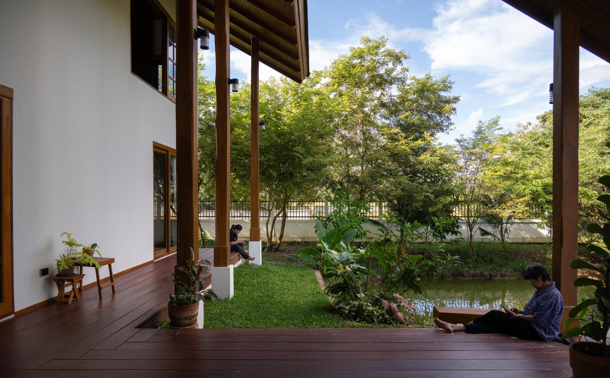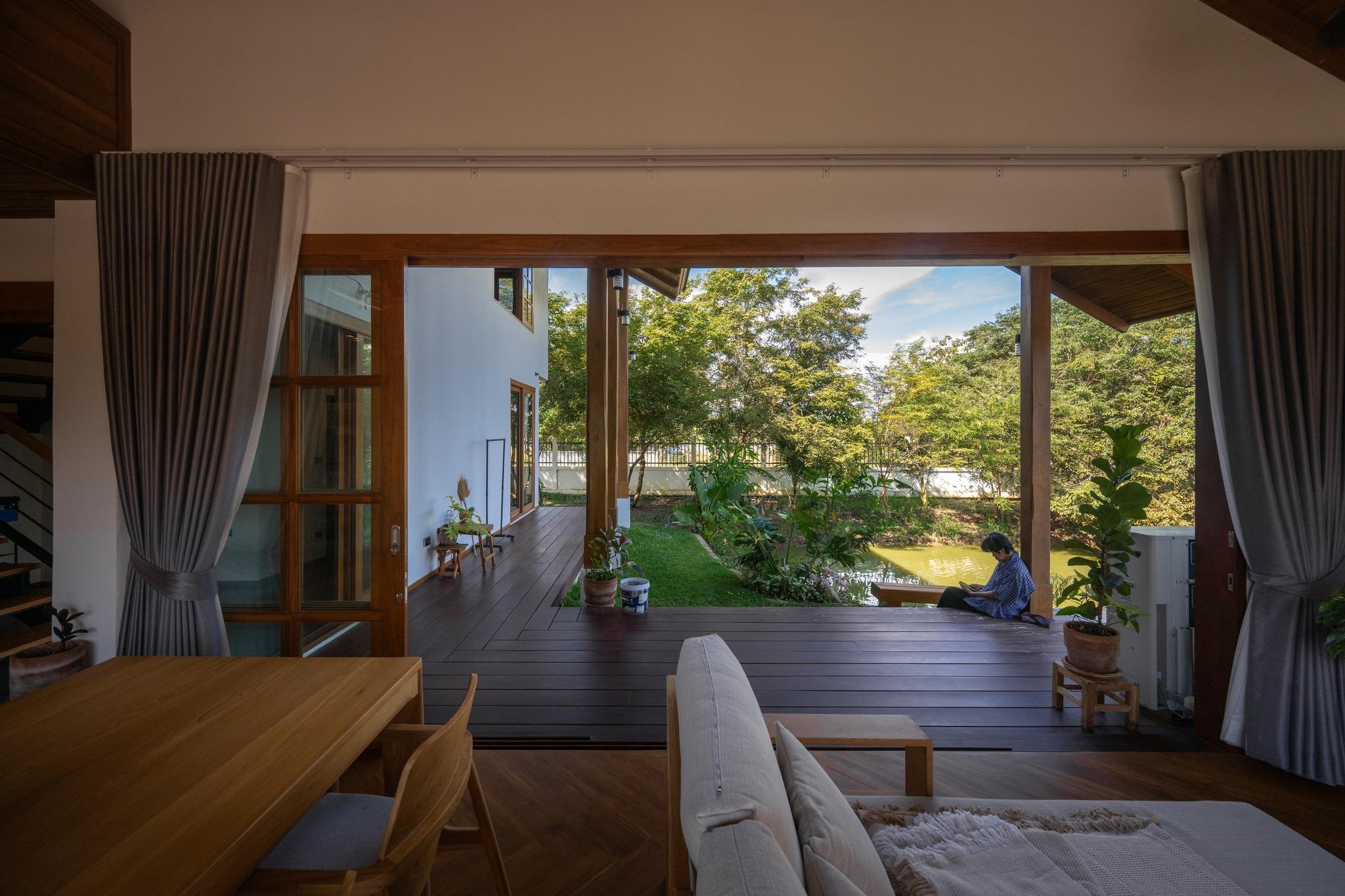 Thay vì đóng kín để tạo sự riêng tư tuyệt đối, BAAN THAM MA DA chọn cách mở có kiểm soát. Các hệ cửa lớn cho phép không gian bên trong kết nối trực tiếp với sân vườn, hồ nước và thảm cây xanh, nhưng vẫn giữ sự yên tĩnh cần thiết. Nhờ đó, mặt tiền không chỉ là lớp vỏ bao bọc, mà trở thành ranh giới mềm - nơi kiến trúc, cảnh quan và đời sống giao thoa một cách tự nhiên.