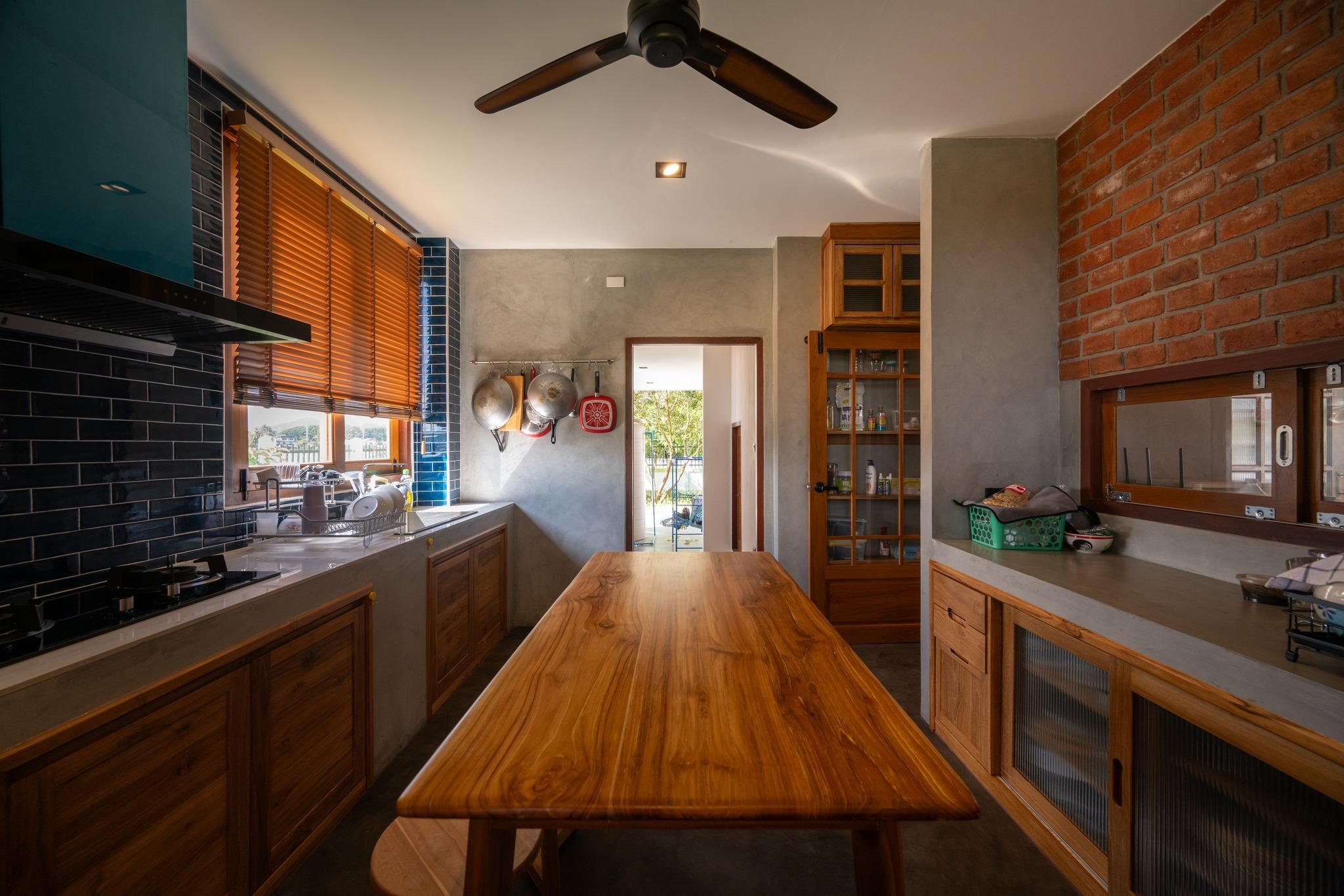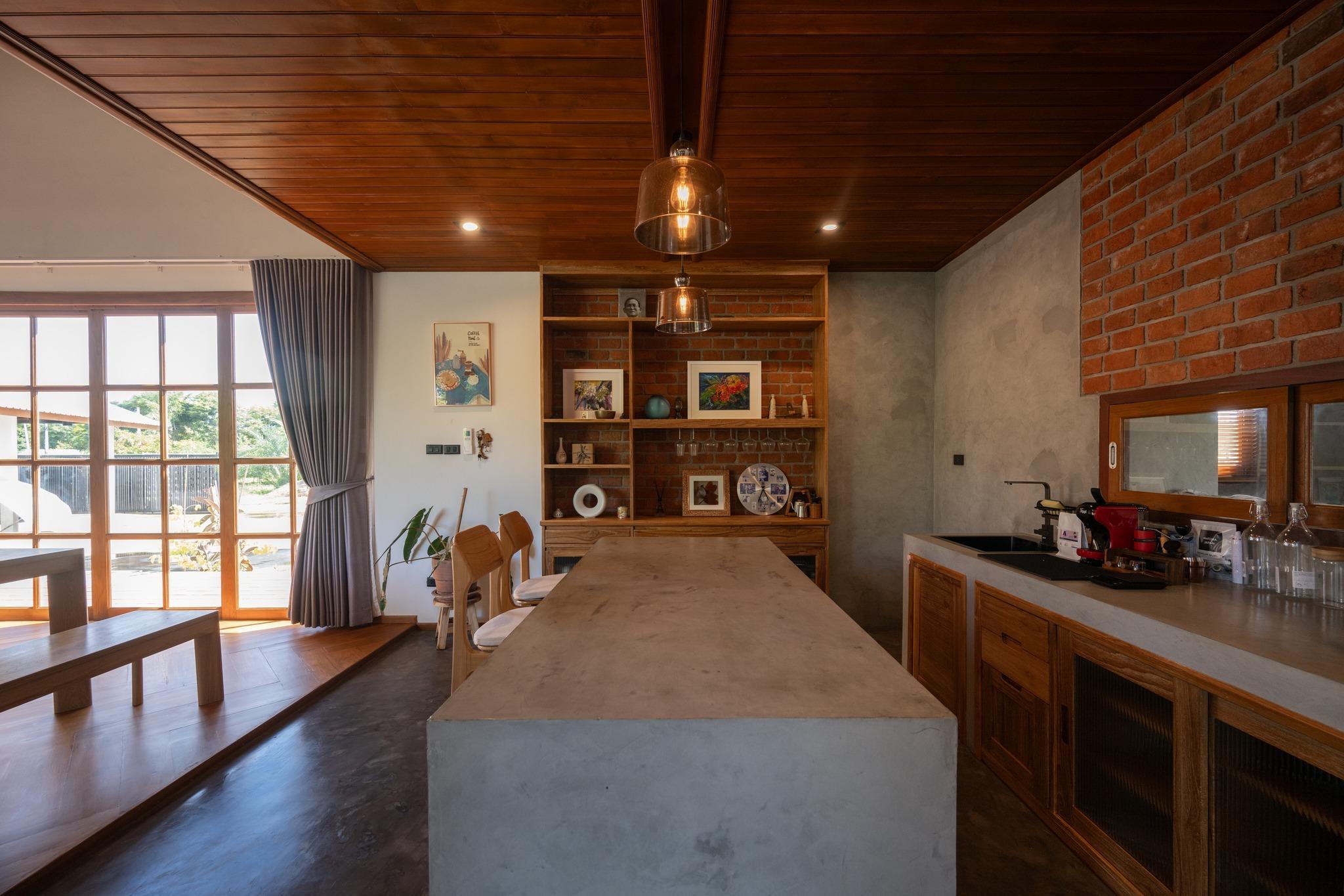 Khu vực bếp - ăn ưu tiên sử dụng gỗ tự nhiên, gạch và bê tông thô. Bảng vật liệu giản dị nhưng đủ để tạo chiều sâu và cảm giác chắc chắn khi sử dụng