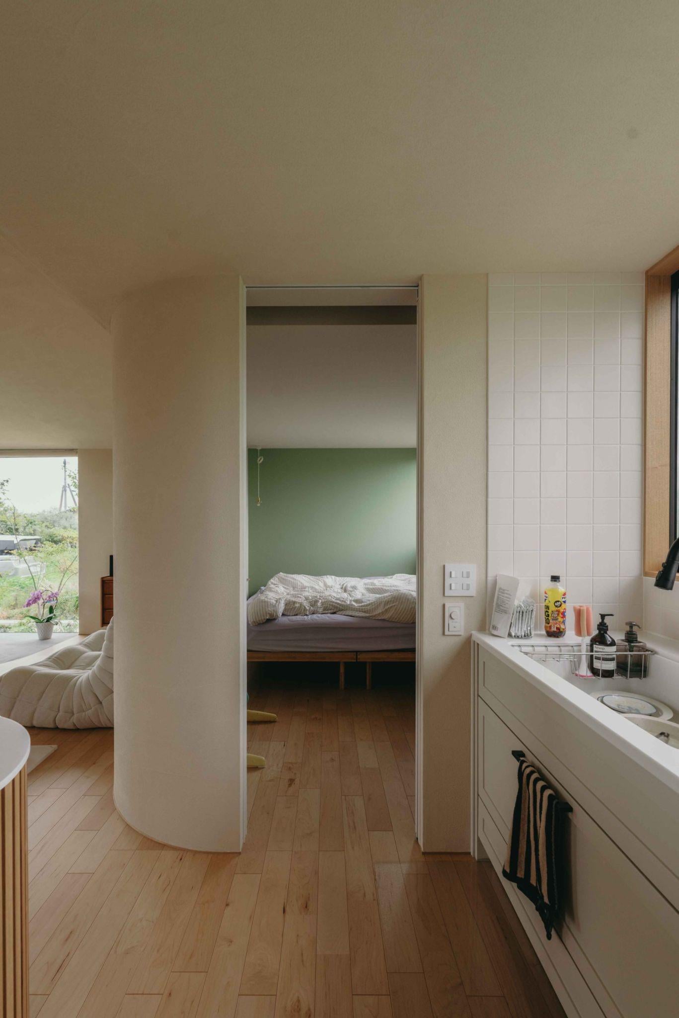 Từ khu bếp có thể nhìn xuyên sang phòng ngủ, cho thấy cách bố trí các không gian sinh hoạt ở gần nhau trong một ngôi nhà một tầng. Thiết kế này giúp việc chăm sóc con nhỏ và di chuyển trong nhà trở nên dễ dàng hơn