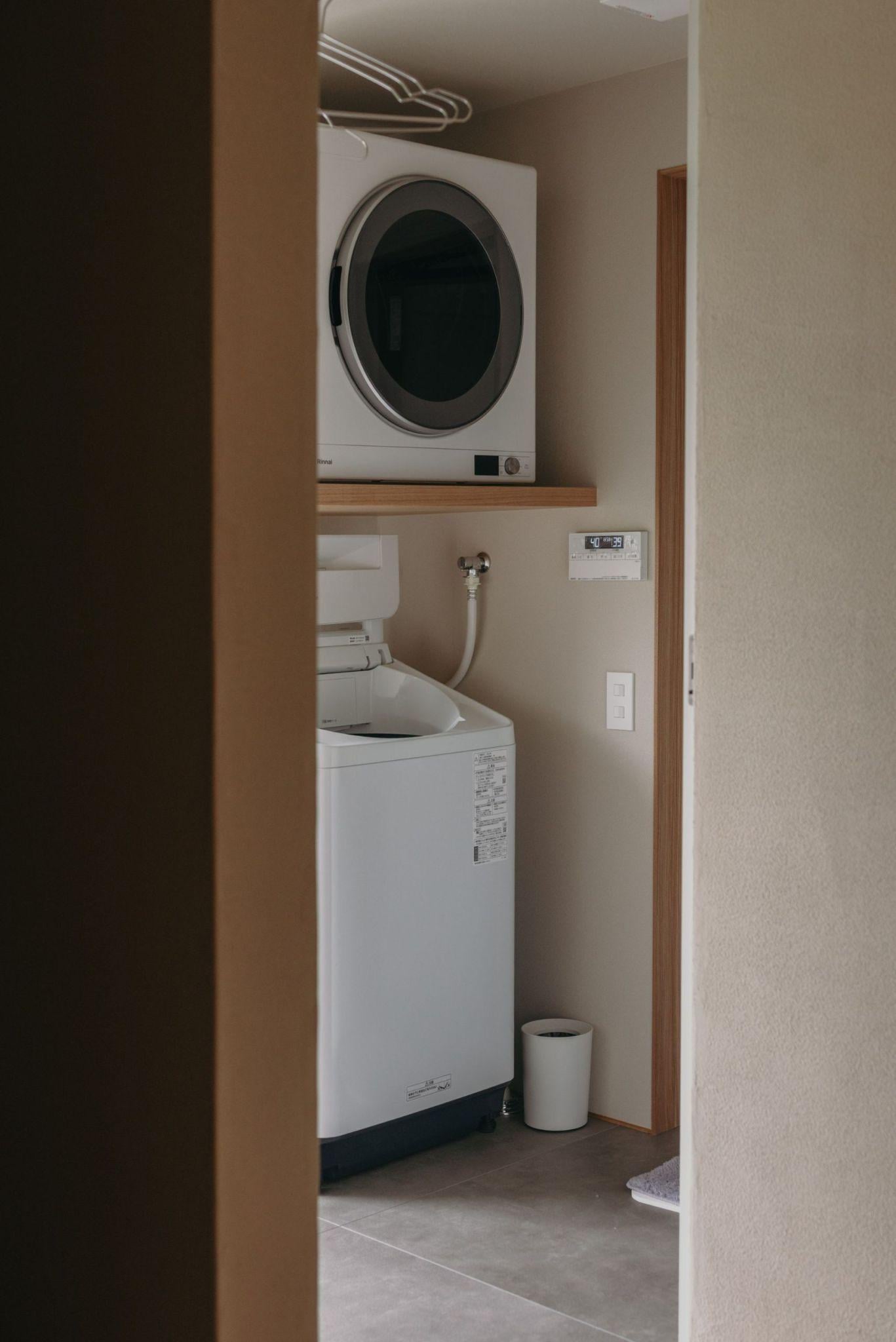 Khu giặt sấy được bố trí gọn trong một phòng riêng, máy giặt và máy sấy xếp chồng giúp tiết kiệm diện tích. Cách sắp xếp này phù hợp với nhịp sinh hoạt hằng ngày của gia đình trẻ