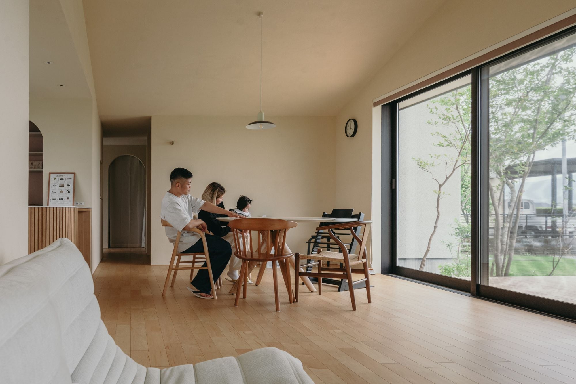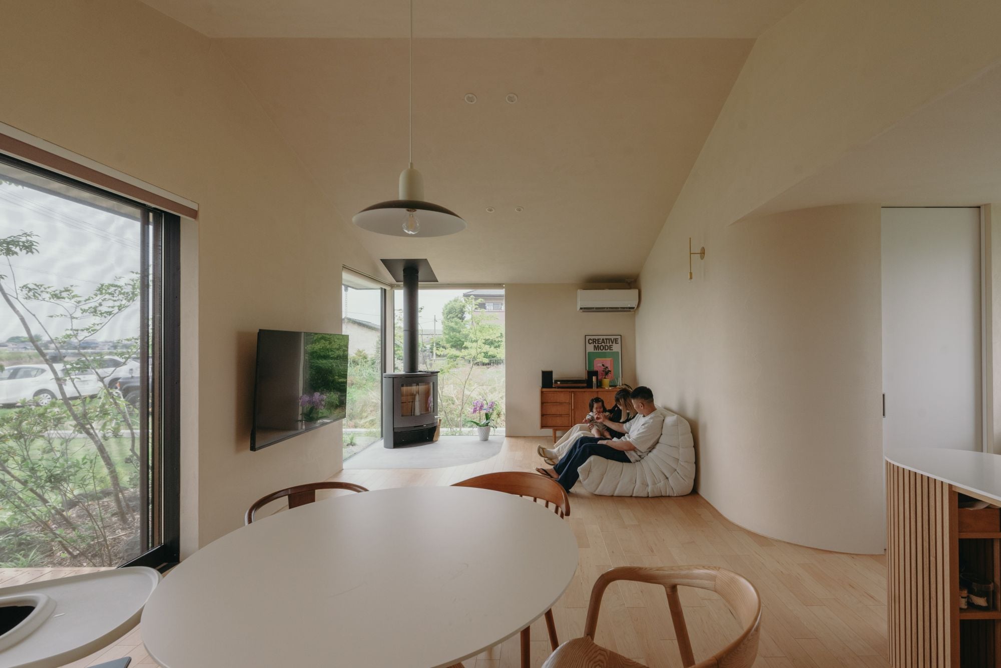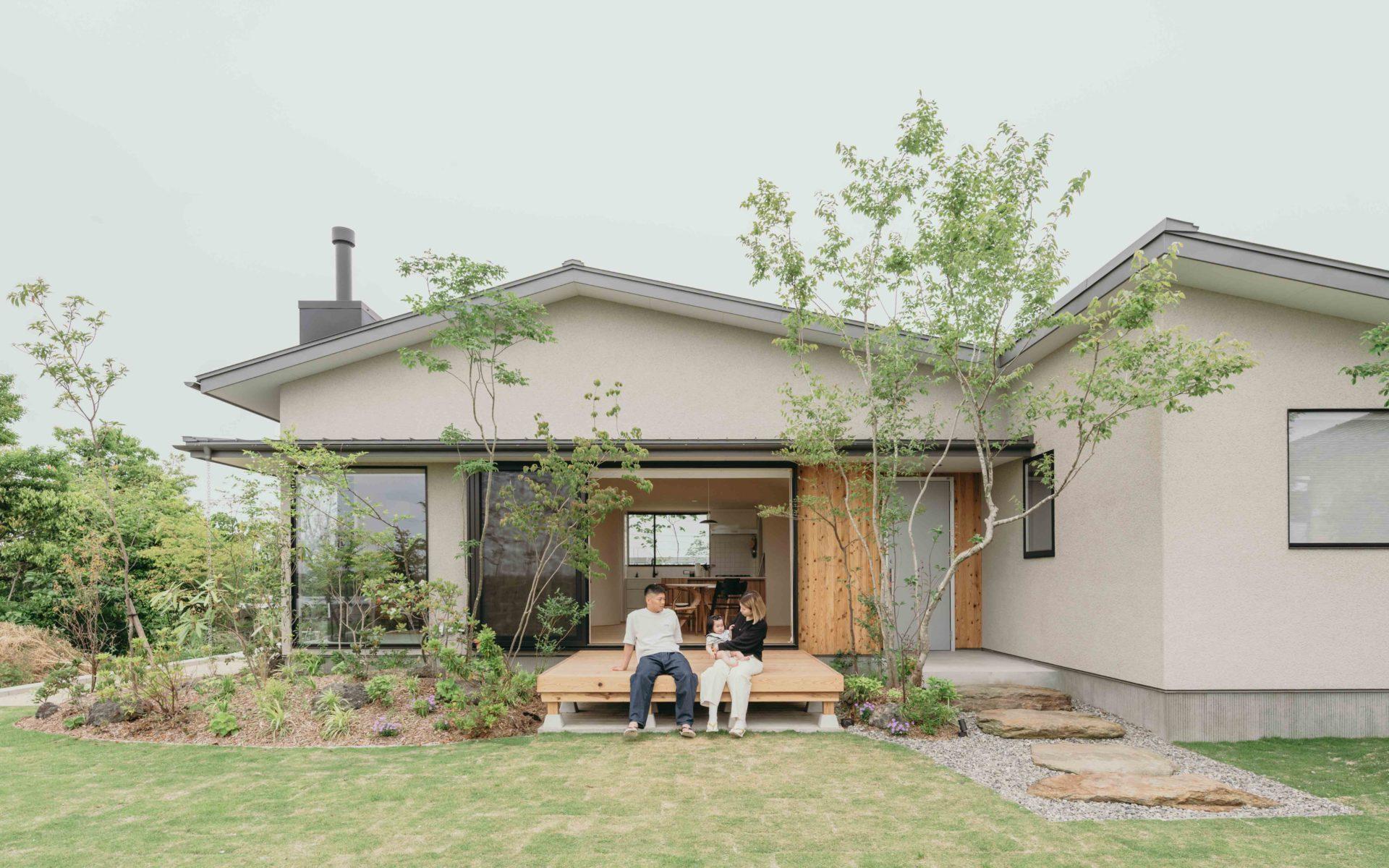 Ngôi nhà 1 tầng tại Kumamoto nổi bật với hình khối thấp, mái dốc nhẹ và khoảng hiên gỗ mở ra sân vườn xanh mát. Thiết kế tạo cảm giác gần gũi, yên tĩnh và phù hợp với nhịp sống gia đình trẻ
