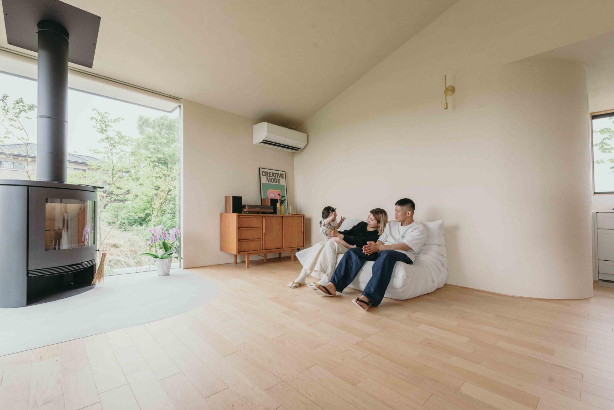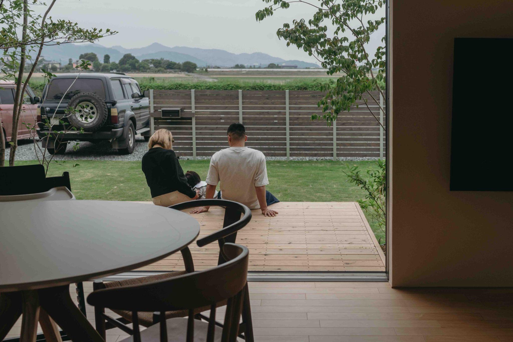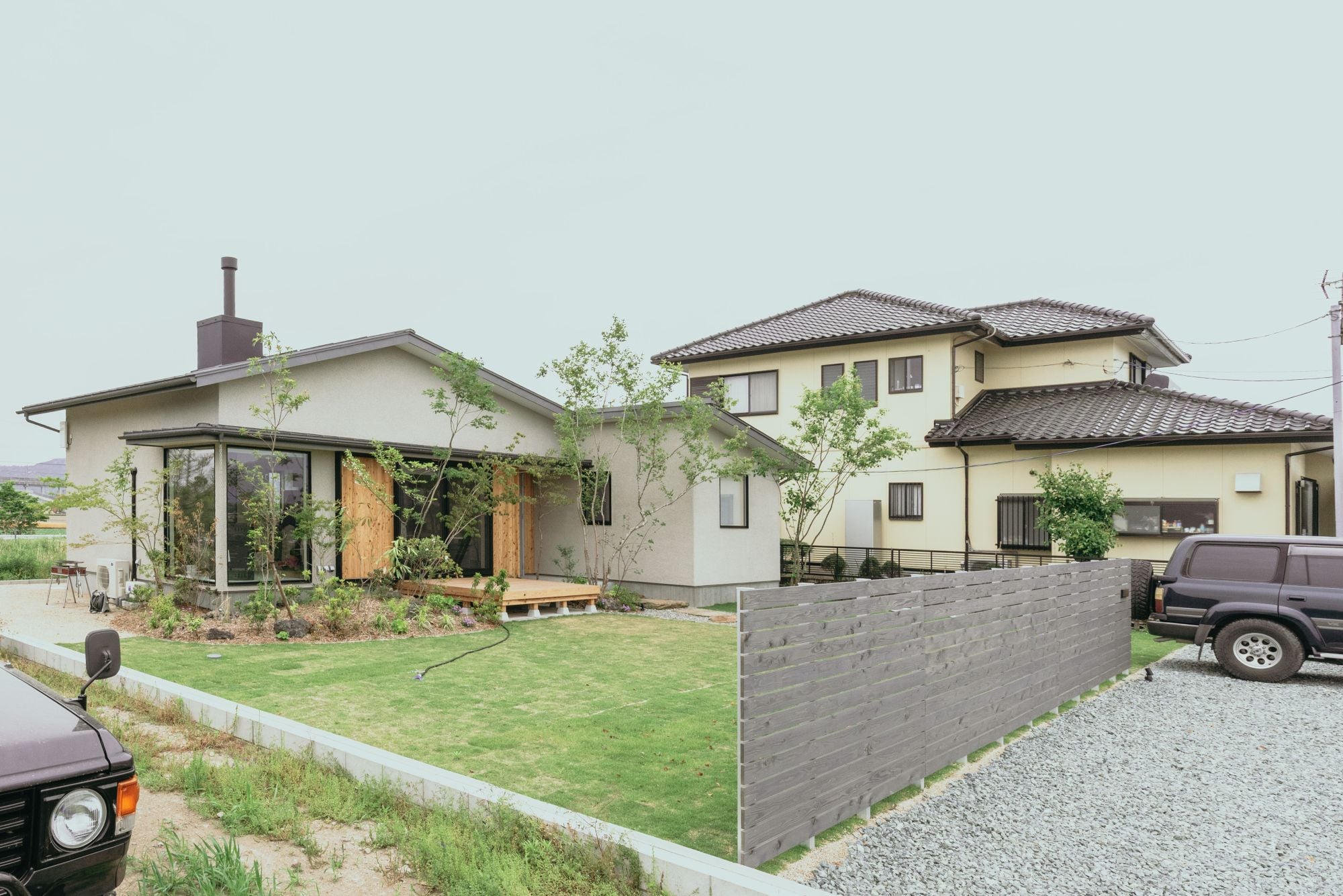 Ngôi nhà 1 tầng tại Kumamoto nổi bật với hình khối thấp, mái dốc nhẹ và khoảng hiên gỗ mở ra sân vườn xanh mát. Thiết kế tạo cảm giác gần gũi, yên tĩnh và phù hợp với nhịp sống gia đình trẻ