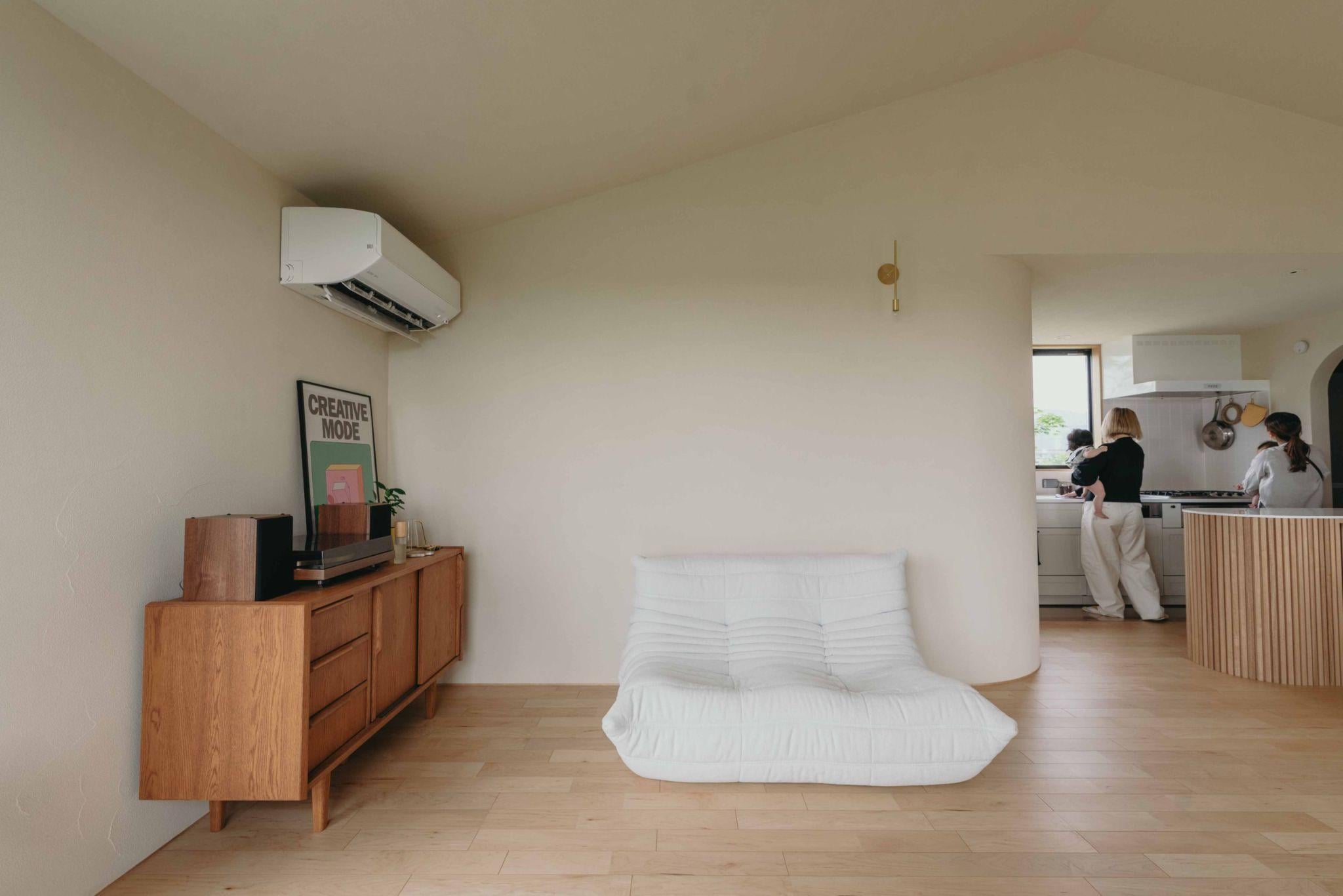 Phòng khách nhìn về phía bếp cho thấy sự kết nối liền mạch giữa các khu vực sinh hoạt chung. Nội thất tối giản, màu sắc trung tính giúp không gian luôn nhẹ nhàng và dễ chịu
