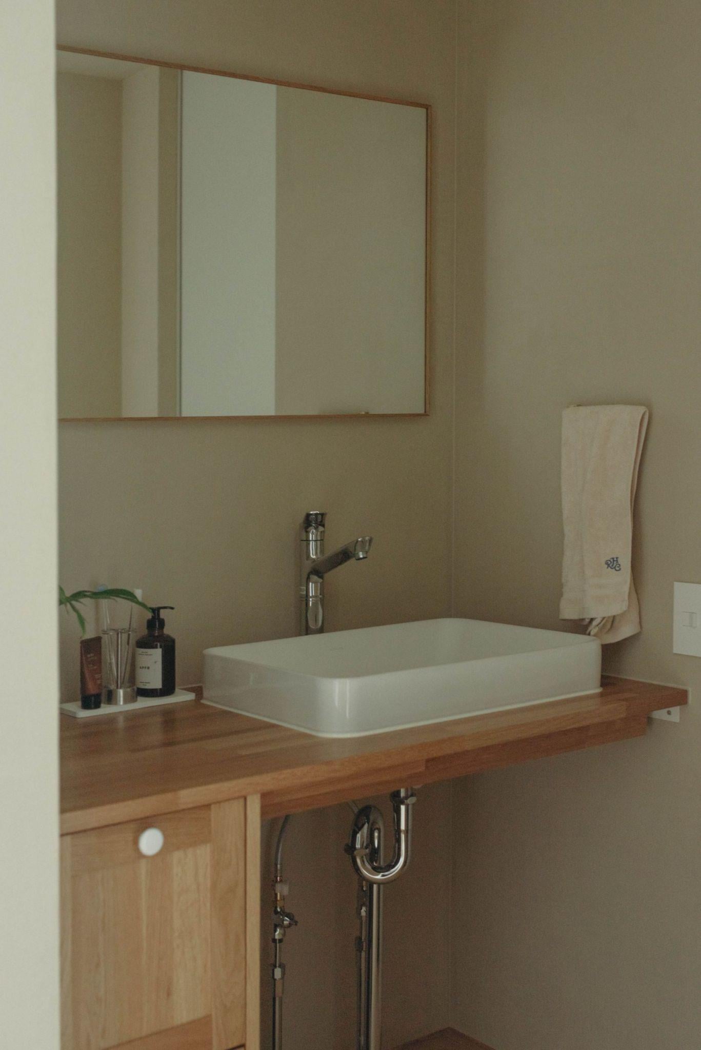 Góc lavabo nhỏ được hoàn thiện đơn giản với bồn rửa đặt trên mặt gỗ và gương treo viền mảnh. Không gian tối giản nhưng vẫn ấm cúng nhờ chất liệu tự nhiên và ánh sáng dịu