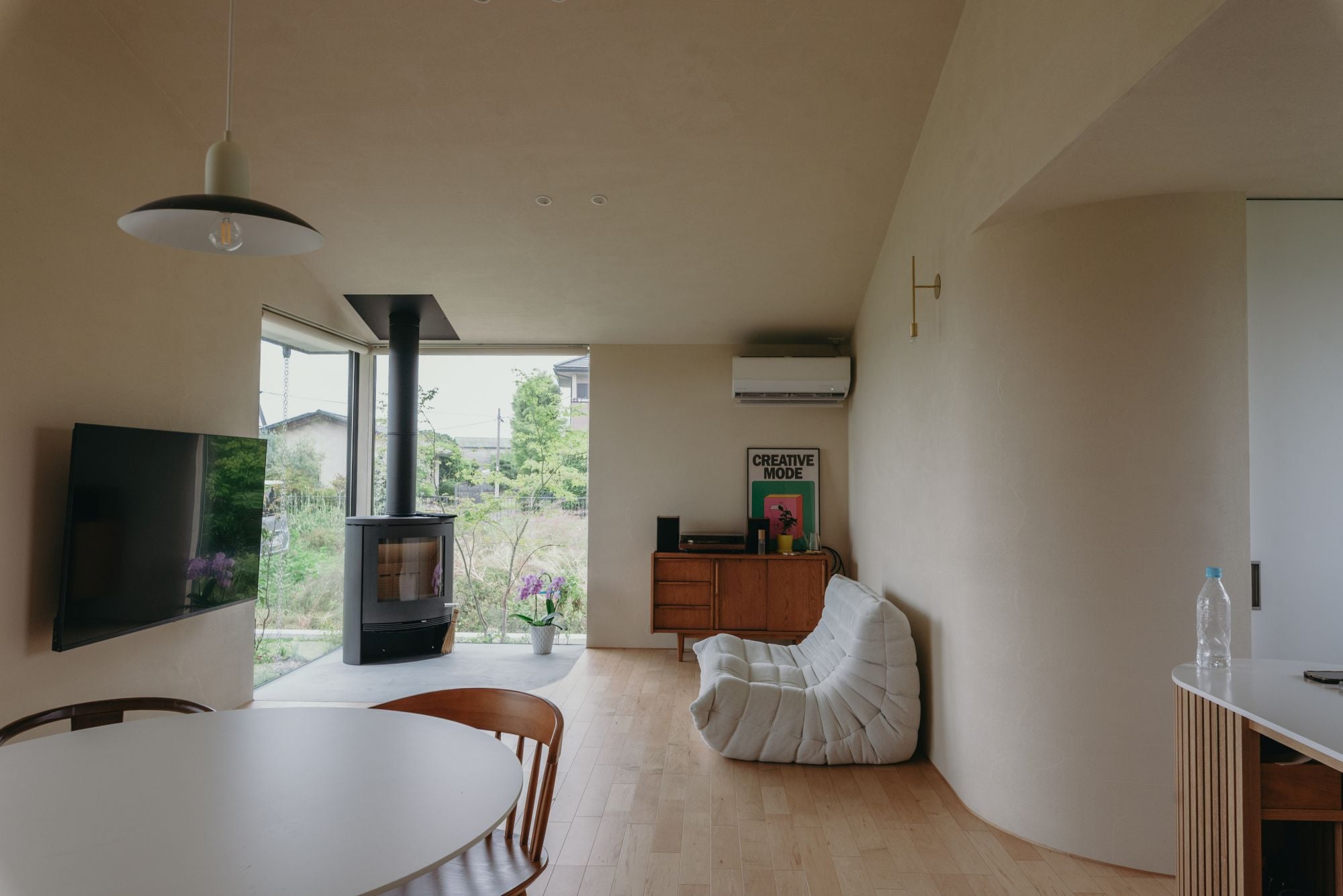 Không gian phòng khách ấm áp với lò sưởi wood stove (lò sưởi đốt củi) đặt gần cửa kính lớn nhìn ra vườn. Ánh sáng tự nhiên và vật liệu gỗ nhạt giúp căn phòng luôn dịu mắt, dễ thư giãn