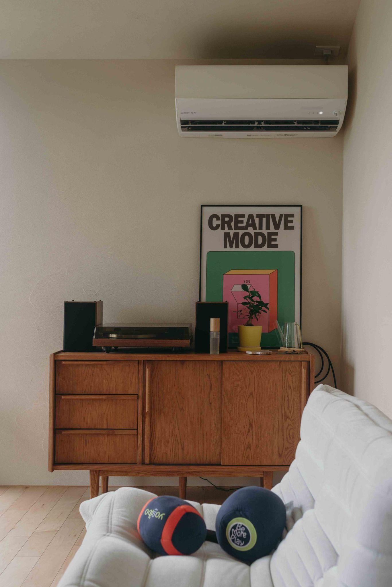 Chi tiết tủ gỗ thấp kết hợp máy nghe đĩa than tạo nên một góc sinh hoạt mang dấu ấn cá nhân của gia chủ. Nội thất đơn giản nhưng đủ để phản ánh lối sống chậm và trân trọng những thú vui thường ngày