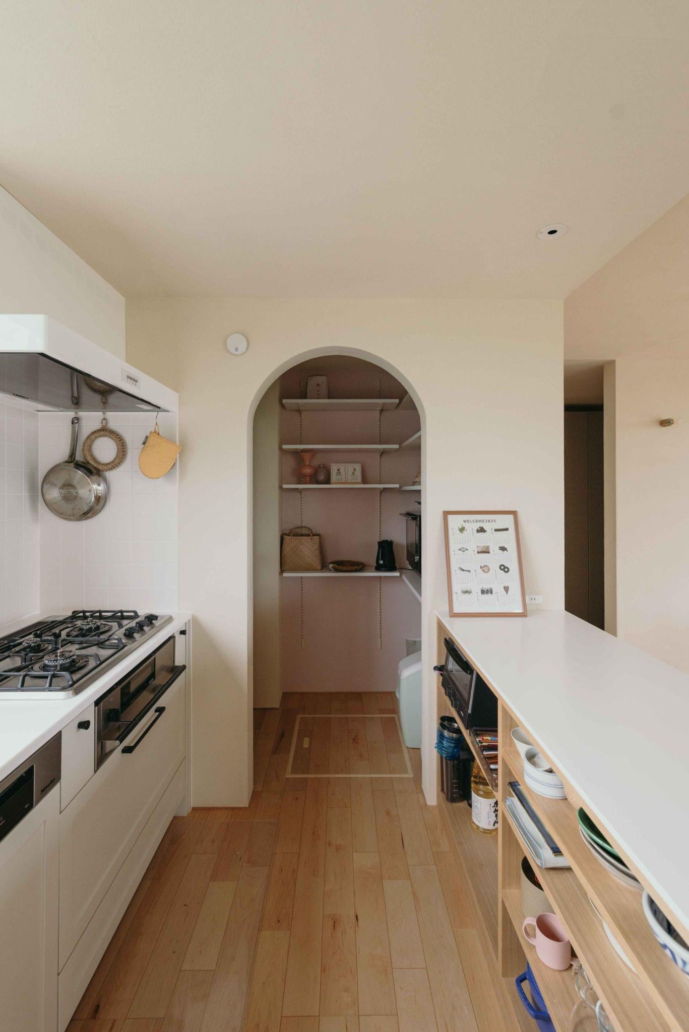 Khu bếp áp tường được tổ chức gọn gàng với lối đi thẳng và hệ kệ mở phía đối diện giúp thao tác nấu nướng thuận tiện. Vòm cửa dẫn vào kho nhỏ phía sau tạo điểm nhấn mềm mại cho không gian bếp