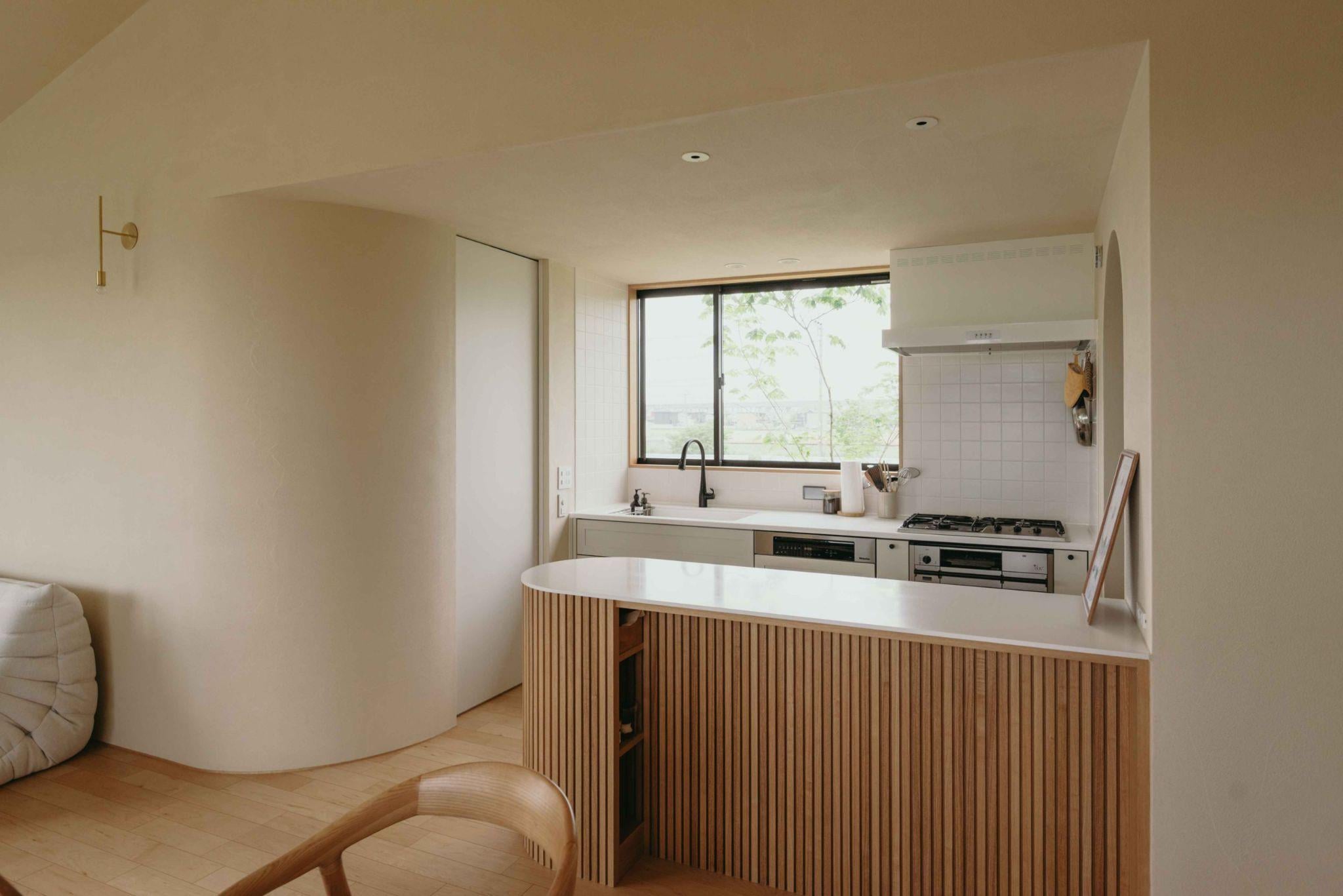 Góc nhìn từ phòng khách vào bếp cho thấy đường cong mềm mại của vách tường, giúp không gian bớt cứng và tăng cảm giác thân thiện. Thiết kế này góp phần làm ngôi nhà trở nên gần gũi và dễ sống hơn mỗi ngày