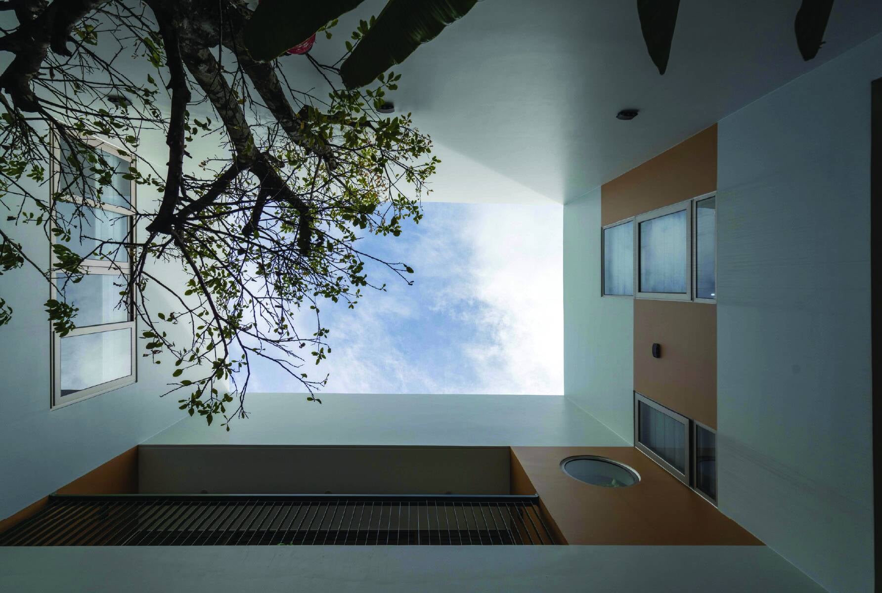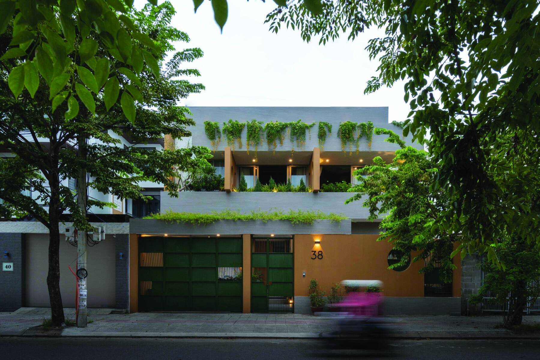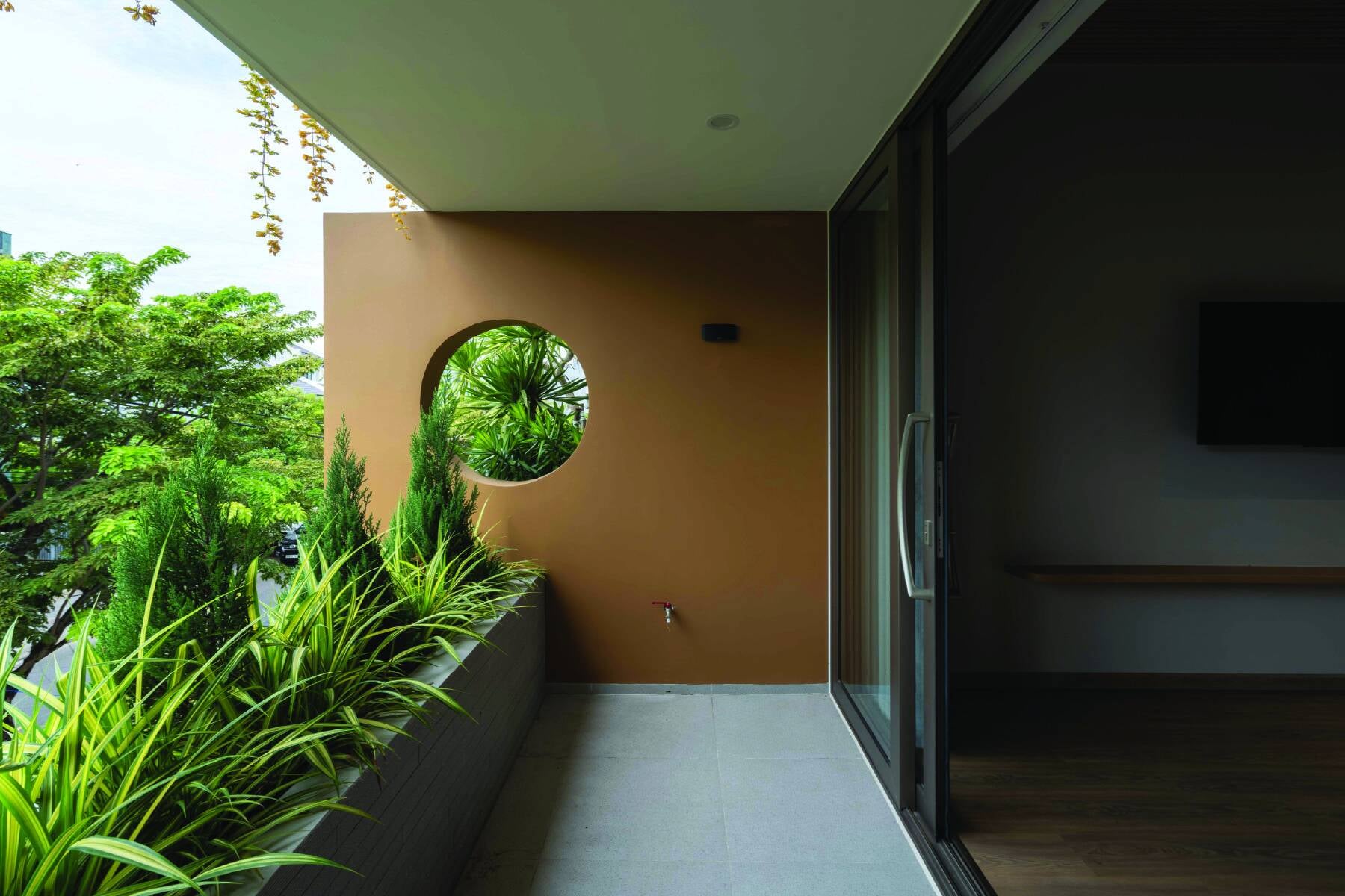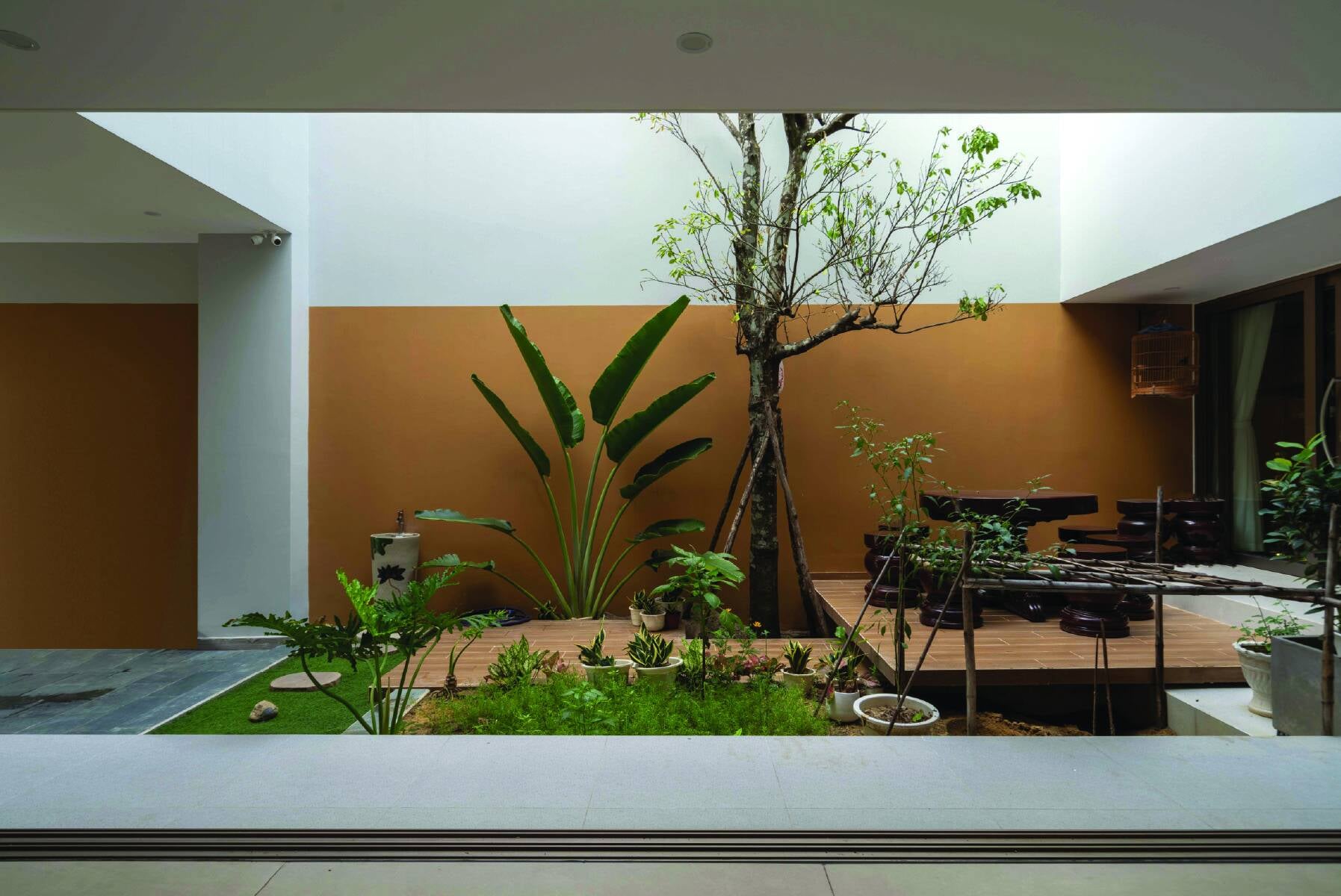 Từ giếng trời trung tâm, hệ thống cây xanh tiếp tục được mở rộng ra các ban công, vườn treo và khu vực mái. Các bồn cây được bố trí xuyên suốt từ cổng vào đến không gian sinh hoạt, tạo nên một lớp màng lọc tự nhiên giúp giảm bụi, tiếng ồn và bức xạ nhiệt – đặc biệt phù hợp với điều kiện khí hậu miền Trung.