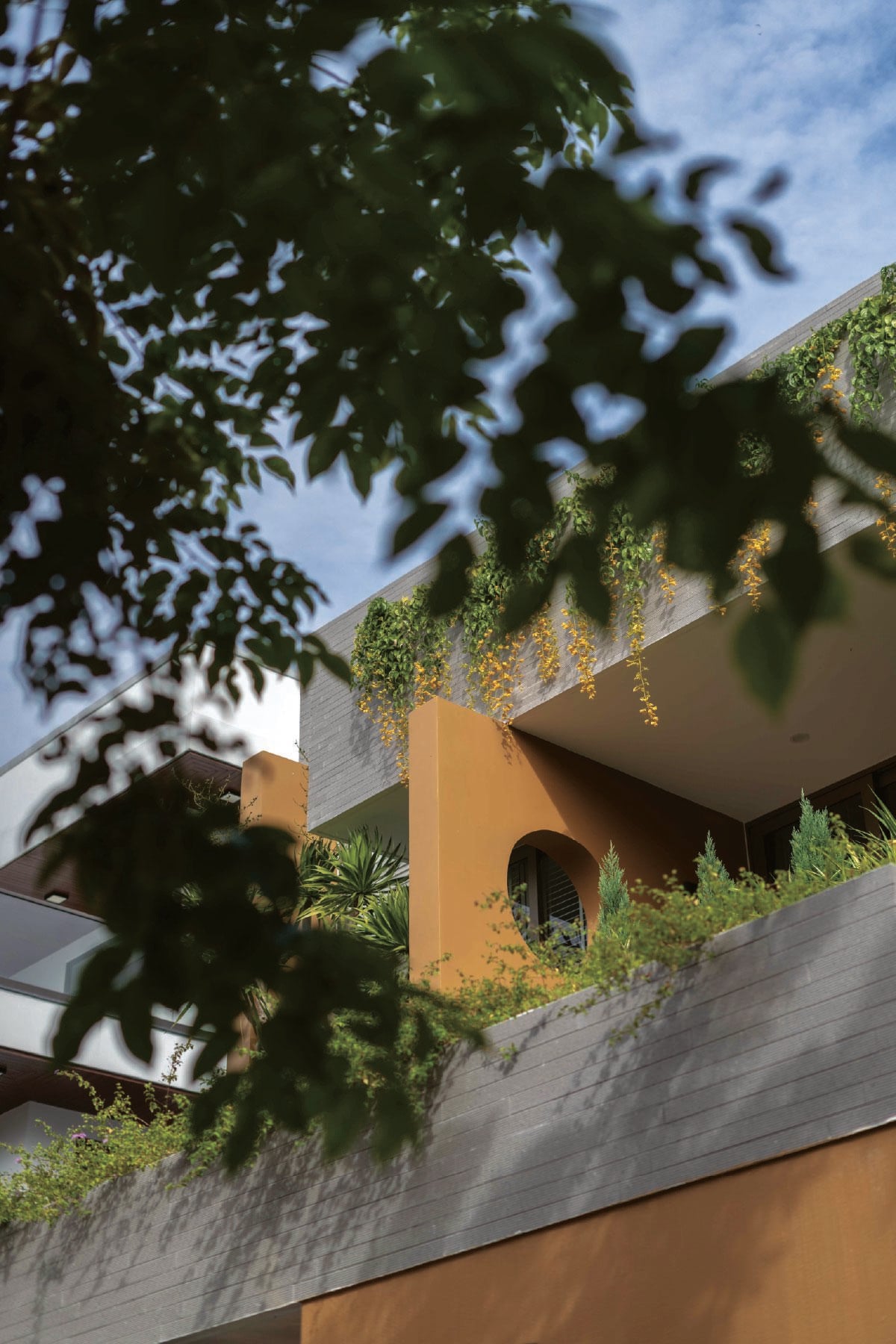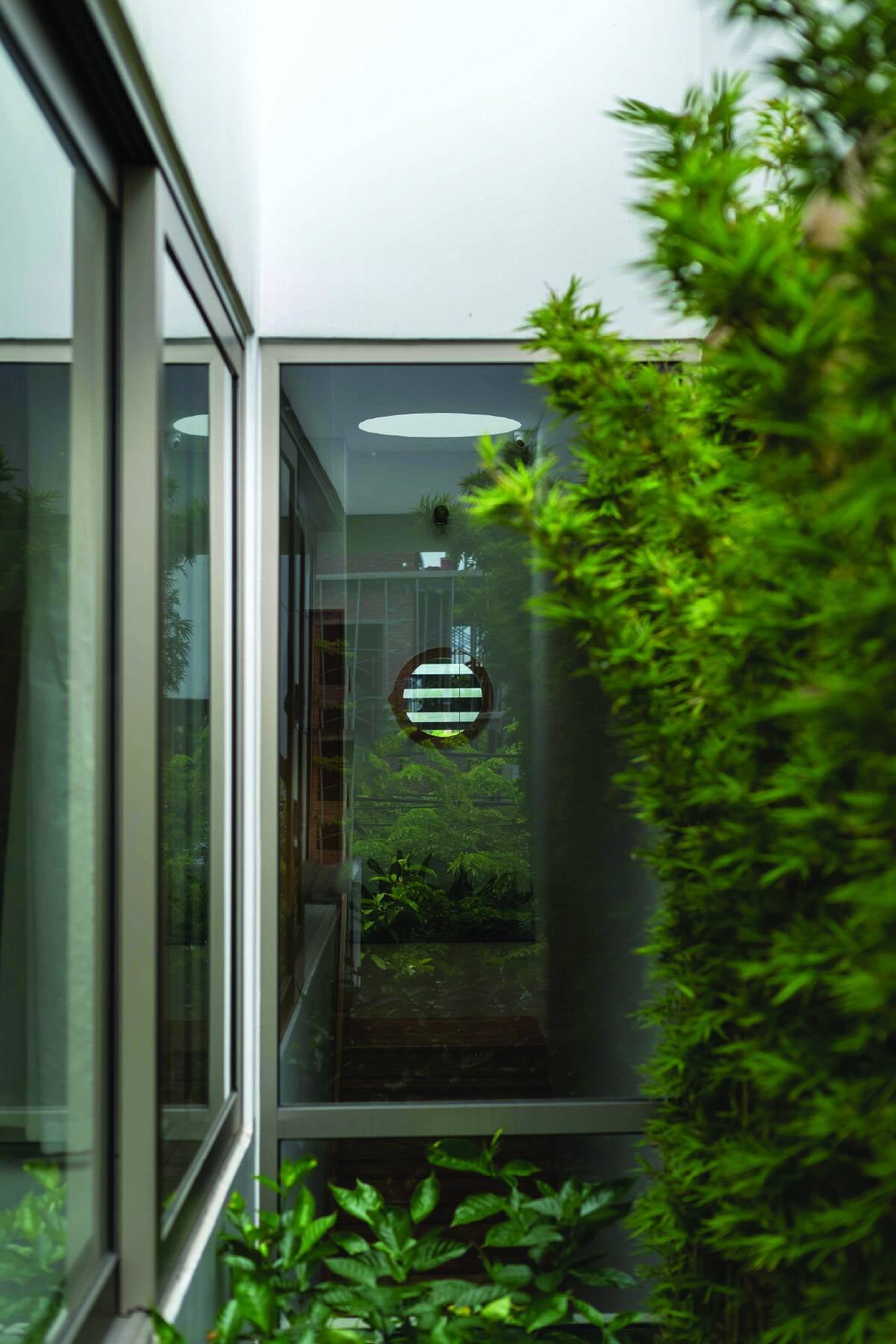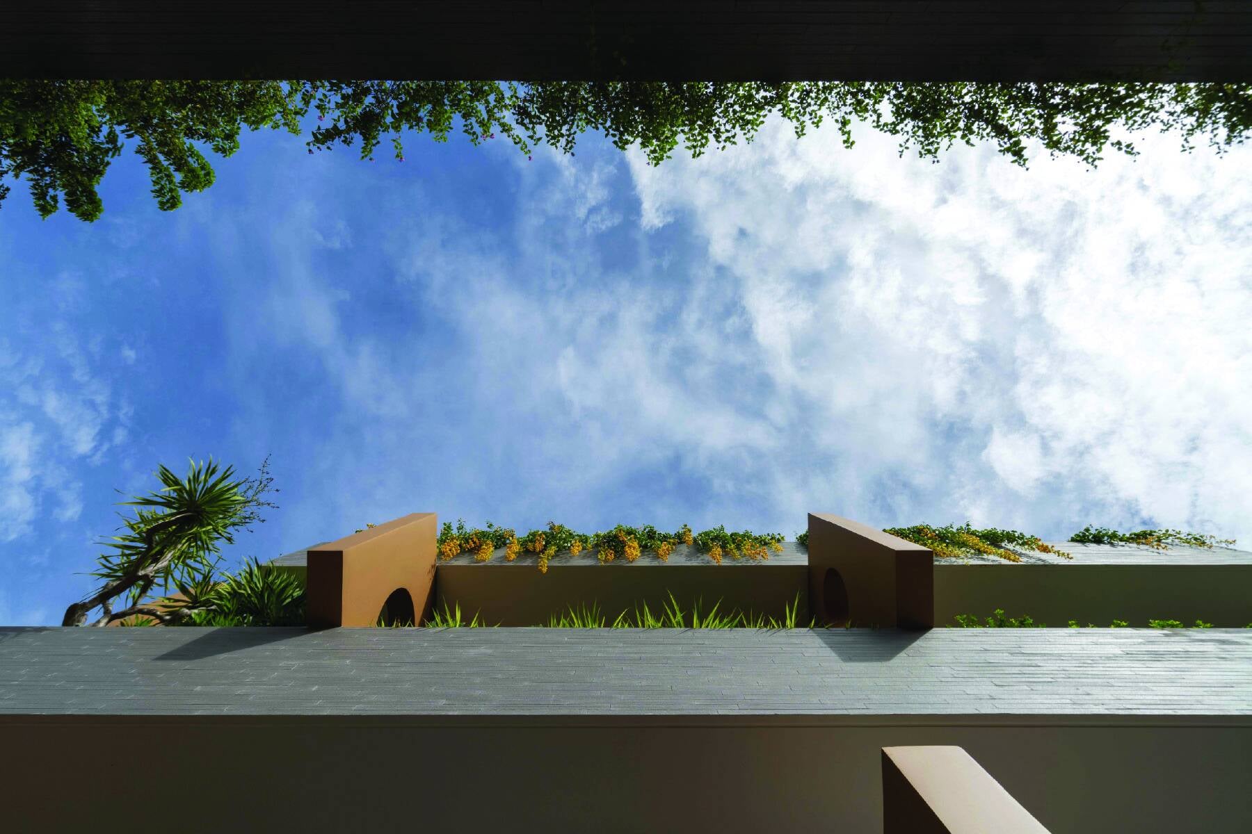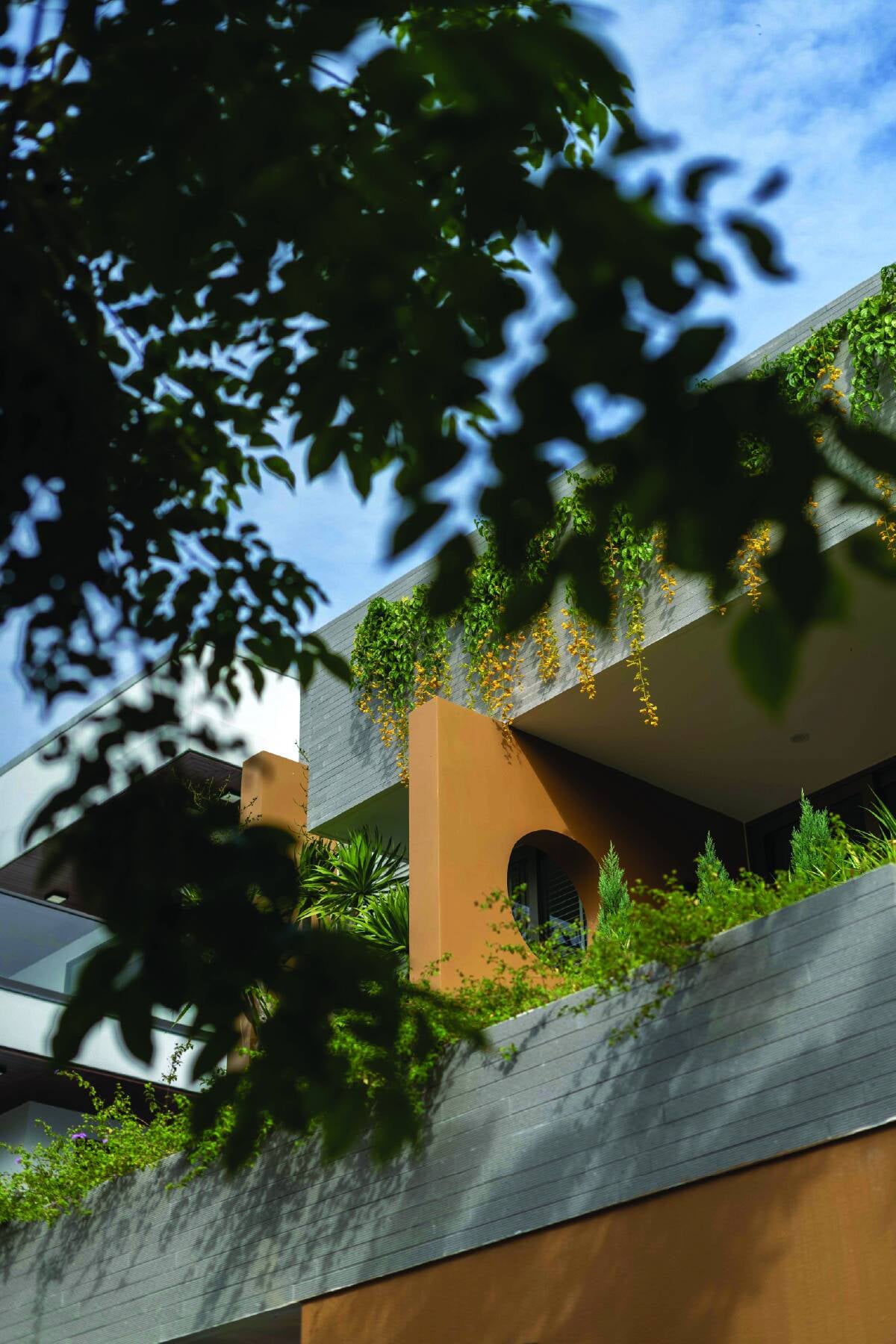 Từ giếng trời trung tâm, hệ thống cây xanh tiếp tục được mở rộng ra các ban công, vườn treo và khu vực mái. Các bồn cây được bố trí xuyên suốt từ cổng vào đến không gian sinh hoạt, tạo nên một lớp màng lọc tự nhiên giúp giảm bụi, tiếng ồn và bức xạ nhiệt – đặc biệt phù hợp với điều kiện khí hậu miền Trung.