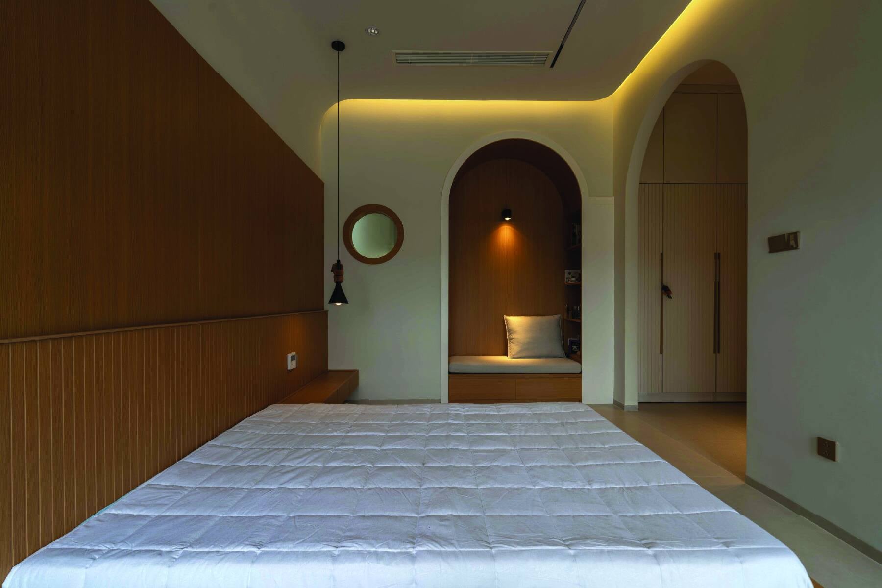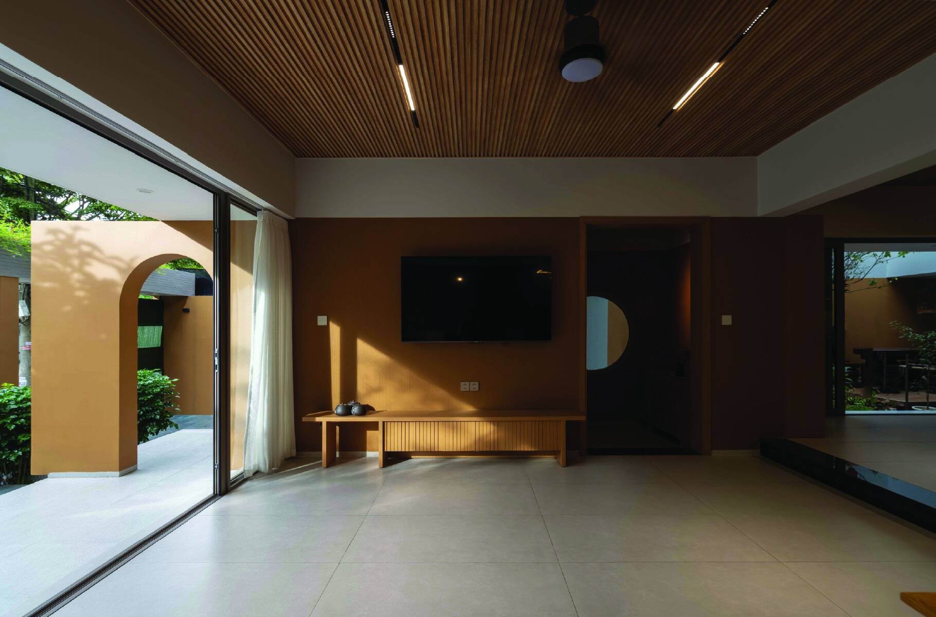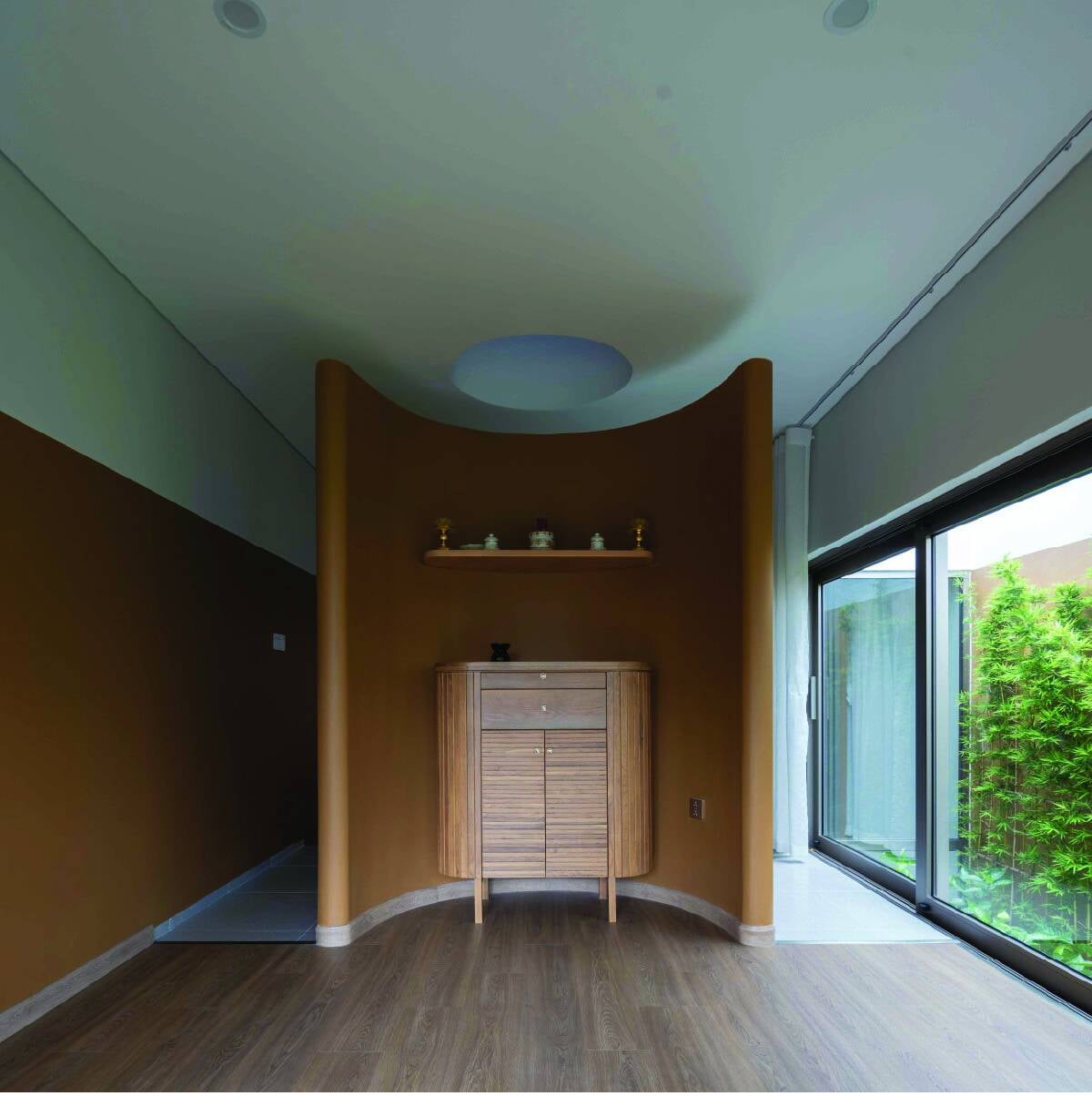 Bên trong, ngôn ngữ hình khối mạnh mẽ được cân bằng bằng các đường cong và chi tiết vòm tại phòng ngủ, khu thờ và trần nhà. Những yếu tố này giúp làm mềm không gian, mang lại cảm giác ôm trọn và yên tĩnh. Việc sử dụng vật liệu gỗ kết hợp ánh sáng gián tiếp tiếp tục củng cố tinh thần sống chậm, nơi kiến trúc không áp đặt hình thức mà âm thầm phục vụ trải nghiệm sống hàng ngày.