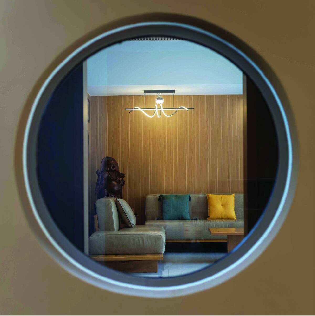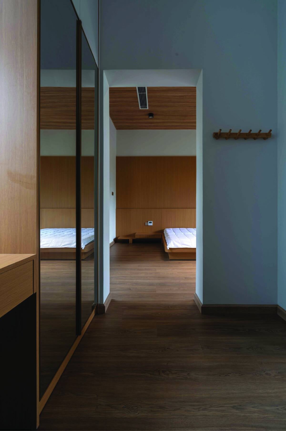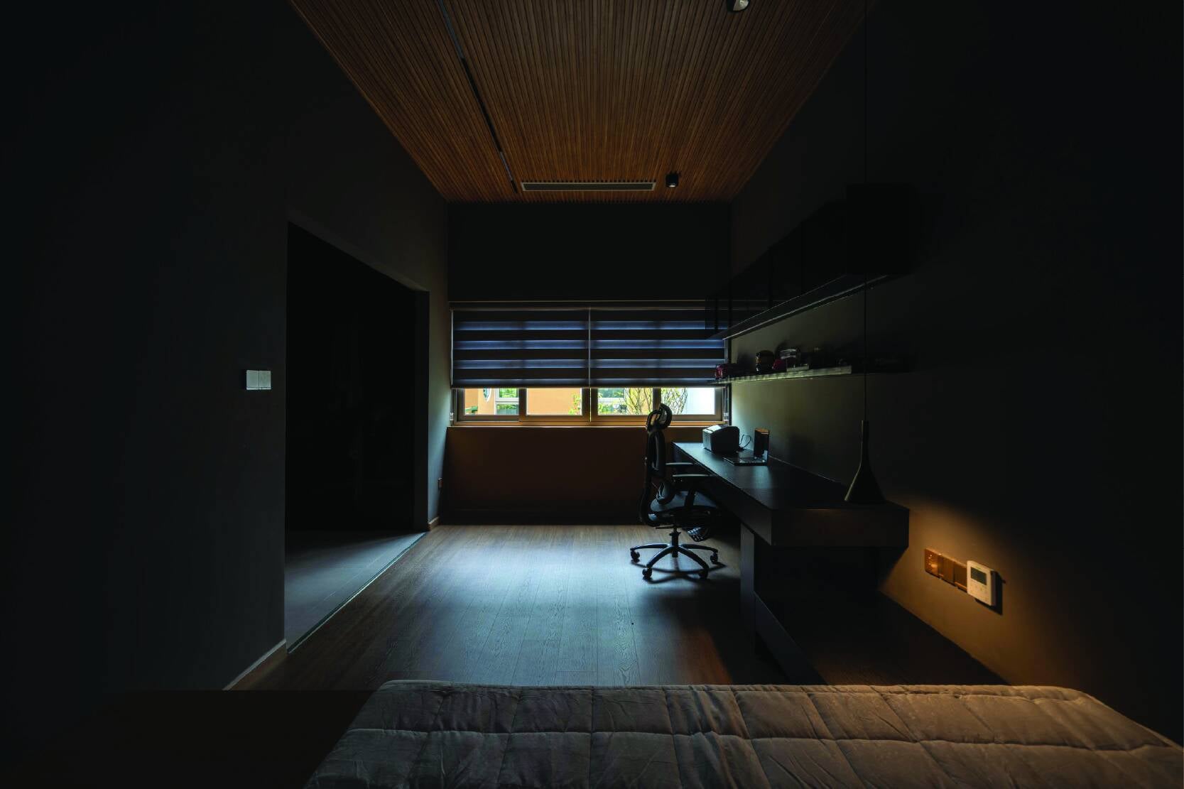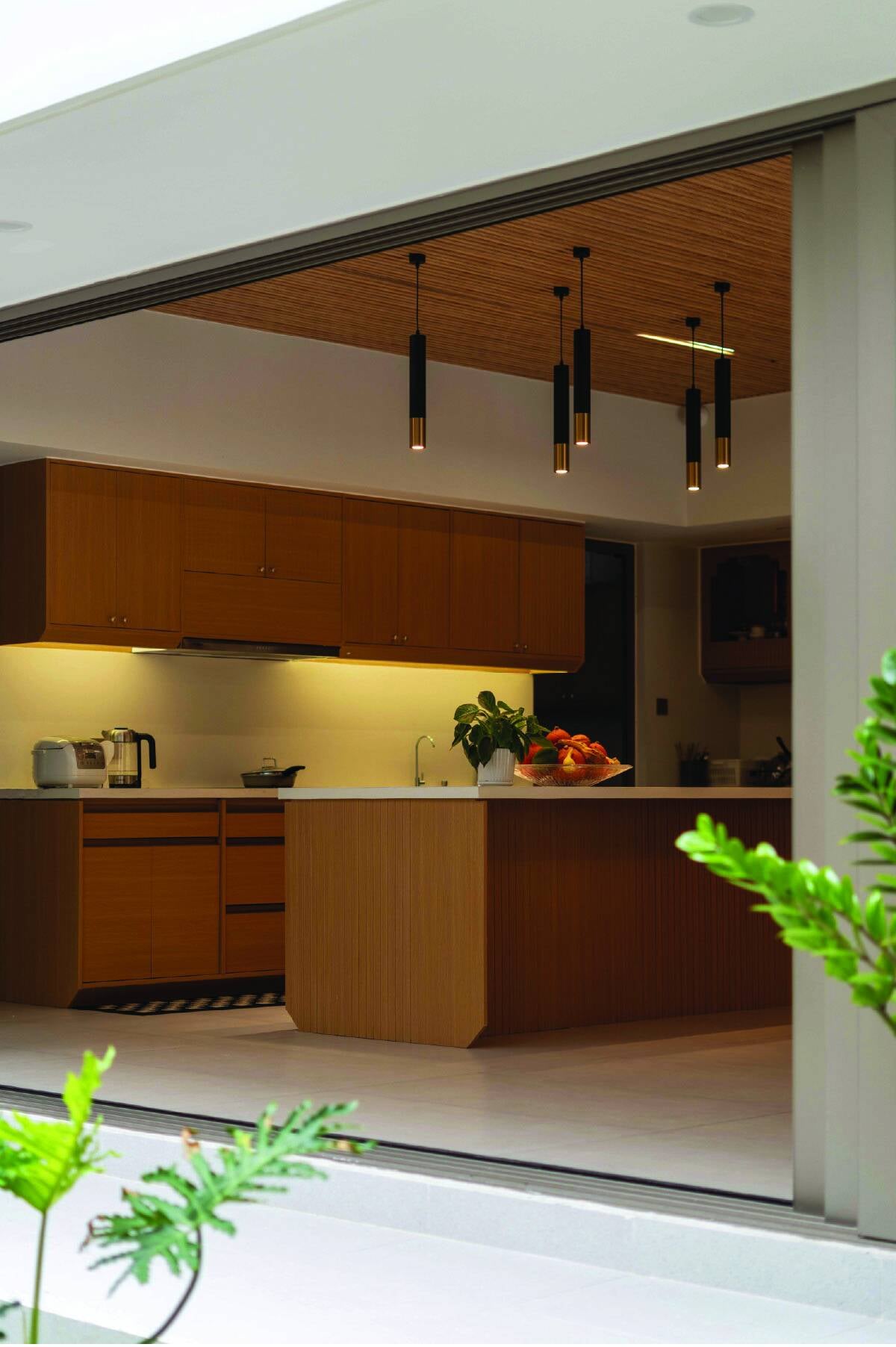 Bên trong, ngôn ngữ hình khối mạnh mẽ được cân bằng bằng các đường cong và chi tiết vòm tại phòng ngủ, khu thờ và trần nhà. Những yếu tố này giúp làm mềm không gian, mang lại cảm giác ôm trọn và yên tĩnh. Việc sử dụng vật liệu gỗ kết hợp ánh sáng gián tiếp tiếp tục củng cố tinh thần sống chậm, nơi kiến trúc không áp đặt hình thức mà âm thầm phục vụ trải nghiệm sống hàng ngày.