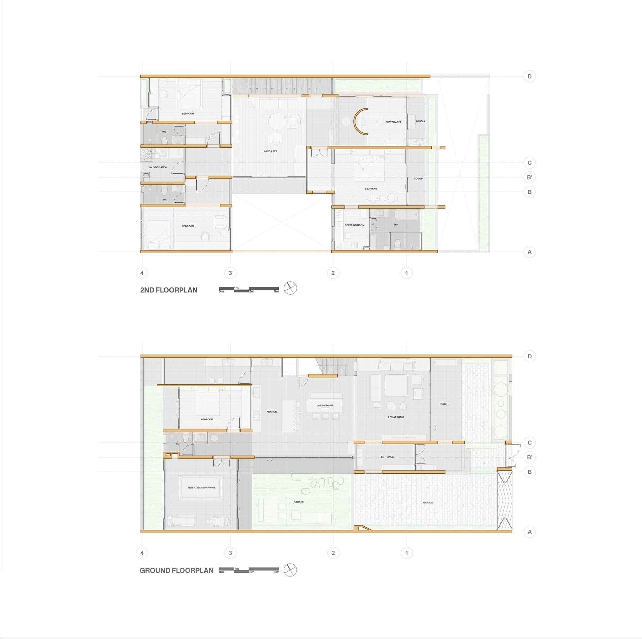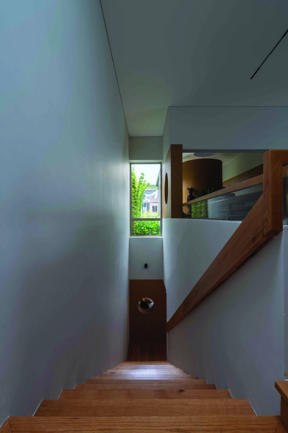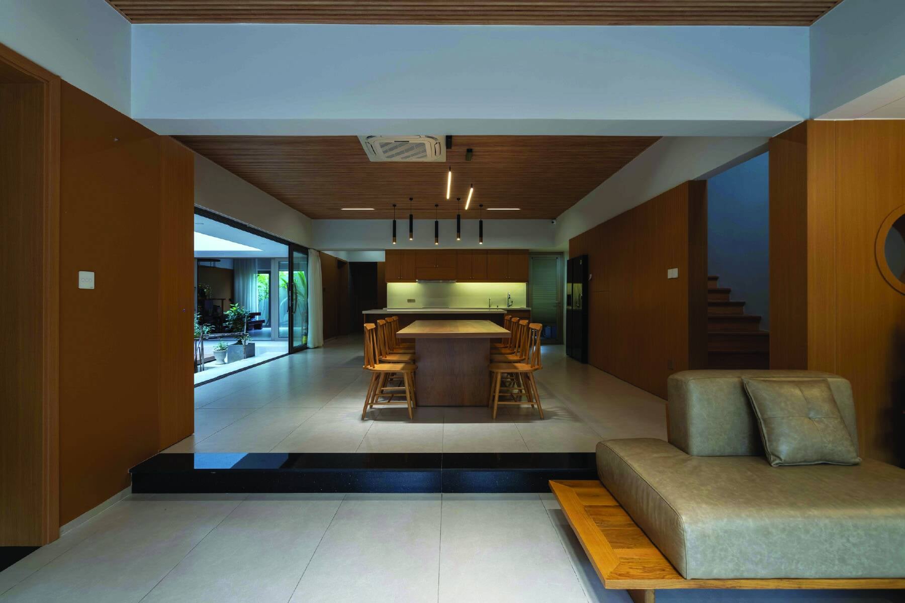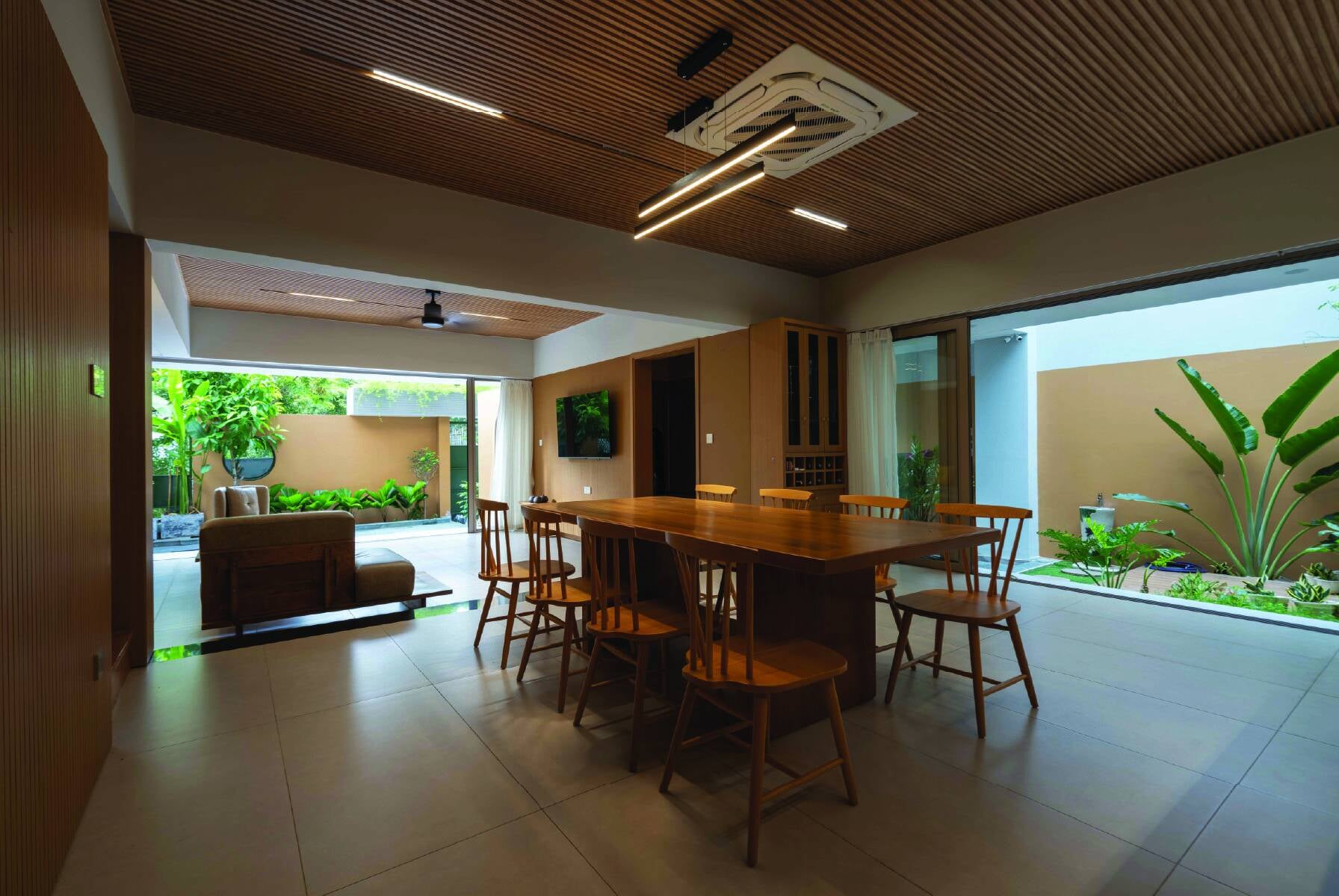 Sự đan xen giữa khối đặc và các khoảng lùi không chỉ mang tính tạo hình, mà còn đóng vai trò quan trọng trong việc tổ chức thông gió, giúp ngôi nhà kín đáo với bên ngoài nhưng vẫn duy trì dòng chảy không khí xuyên suốt bên trong.