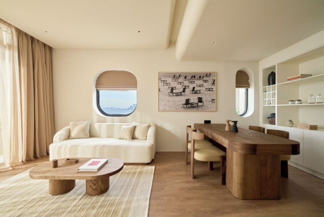 Hòa chung ngôn ngữ thân thiện với bảng màu, đường nét không toát lên sự sắc cạnh của đô thị mà mang dáng vẻ hữu cơ uyển chuyển. Những vòm cửa duyên dáng, những góc tường uốn lượn, những món đồ nội thất bo tròn tạo nên nhịp điệu chảy trôi nhẹ nhàng về thị giác. Những đường nét chuyển tiếp mượt mà vô thức dẫn dắt cảm giác an toàn và dễ chịu len lỏi trong tâm trí.