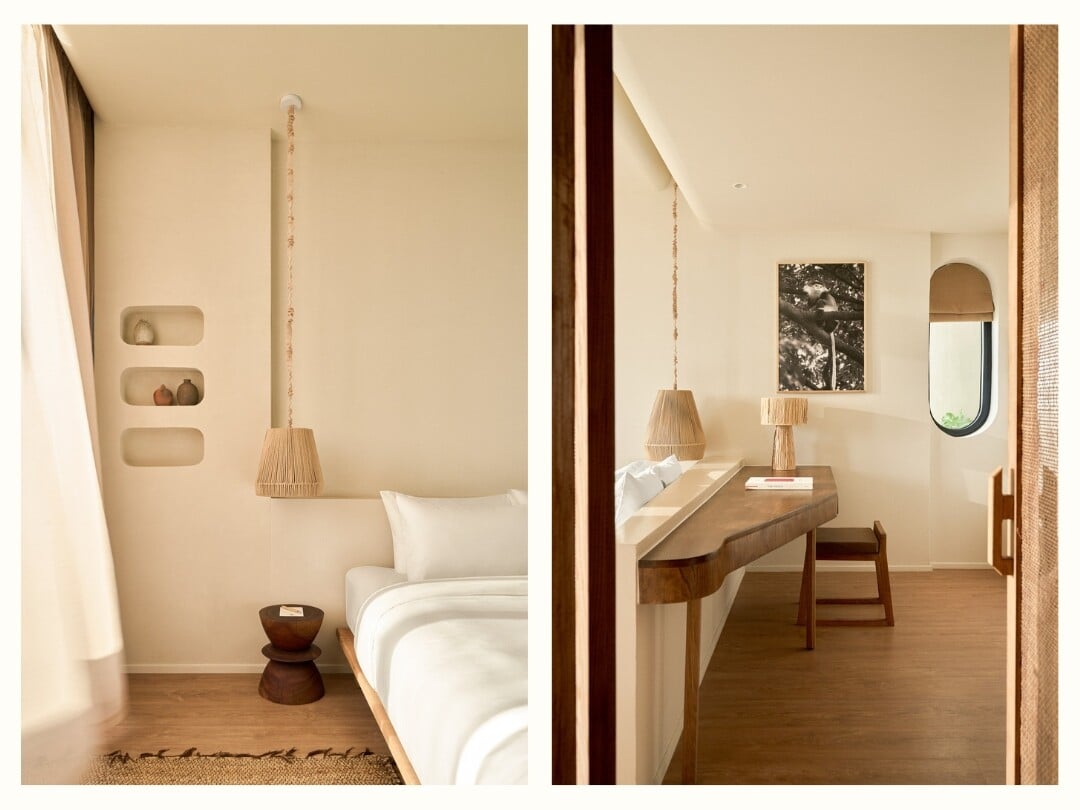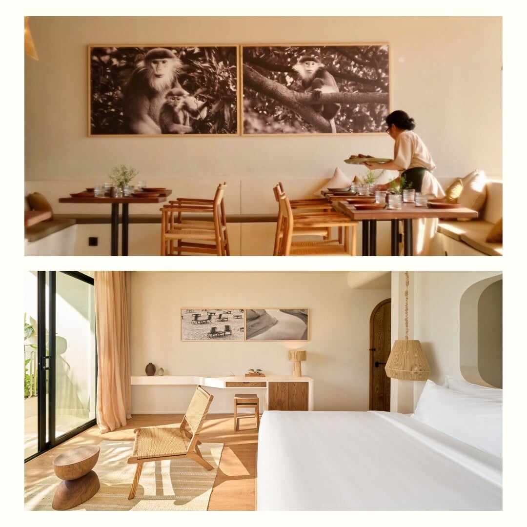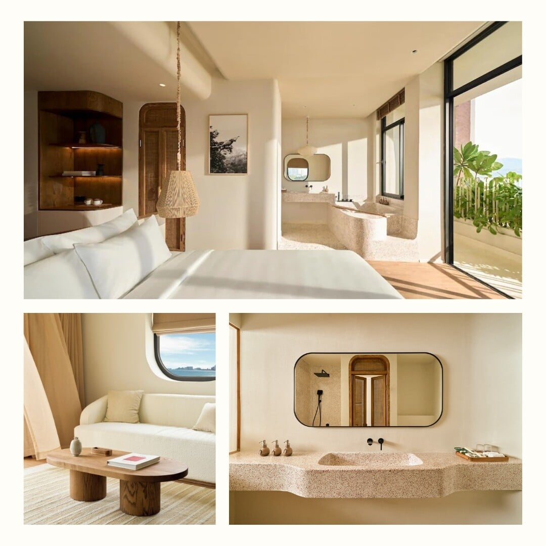 Sau đó, những rung động ban đầu tiếp tục được bồi đắp bằng chất cảm của vật liệu: gỗ ấm áp, vải êm mềm, mây tre mộc mạc, đất nung phảng phất vẻ xưa cũ, kim loại và kính mang hơi hướng hiện đại. Tất cả đã được sắp đặt tỉ mỉ để tạo nên một không gian bao bọc con người trong sự gần gũi và ấm cúng. Mà nếu ở đủ lâu trong đó, lữ khách có thể còn “nghe thấy” kí ức đại ngàn lưu giữ hơi thở của gỗ, lời thì thầm của đất mẹ ẩn trong vân đá mài, những câu chuyện về tình yêu lao động và óc sáng tạo của những người thợ lành nghề phía sau từng chi tiết. Và để đáp ứng đặc thù vận hành của khách sạn trong khí hậu ven biển, mỗi loại vật liệu đều được chọn lựa và xử lý cẩn thận, đảm bảo độ bền bỉ theo thời gian.