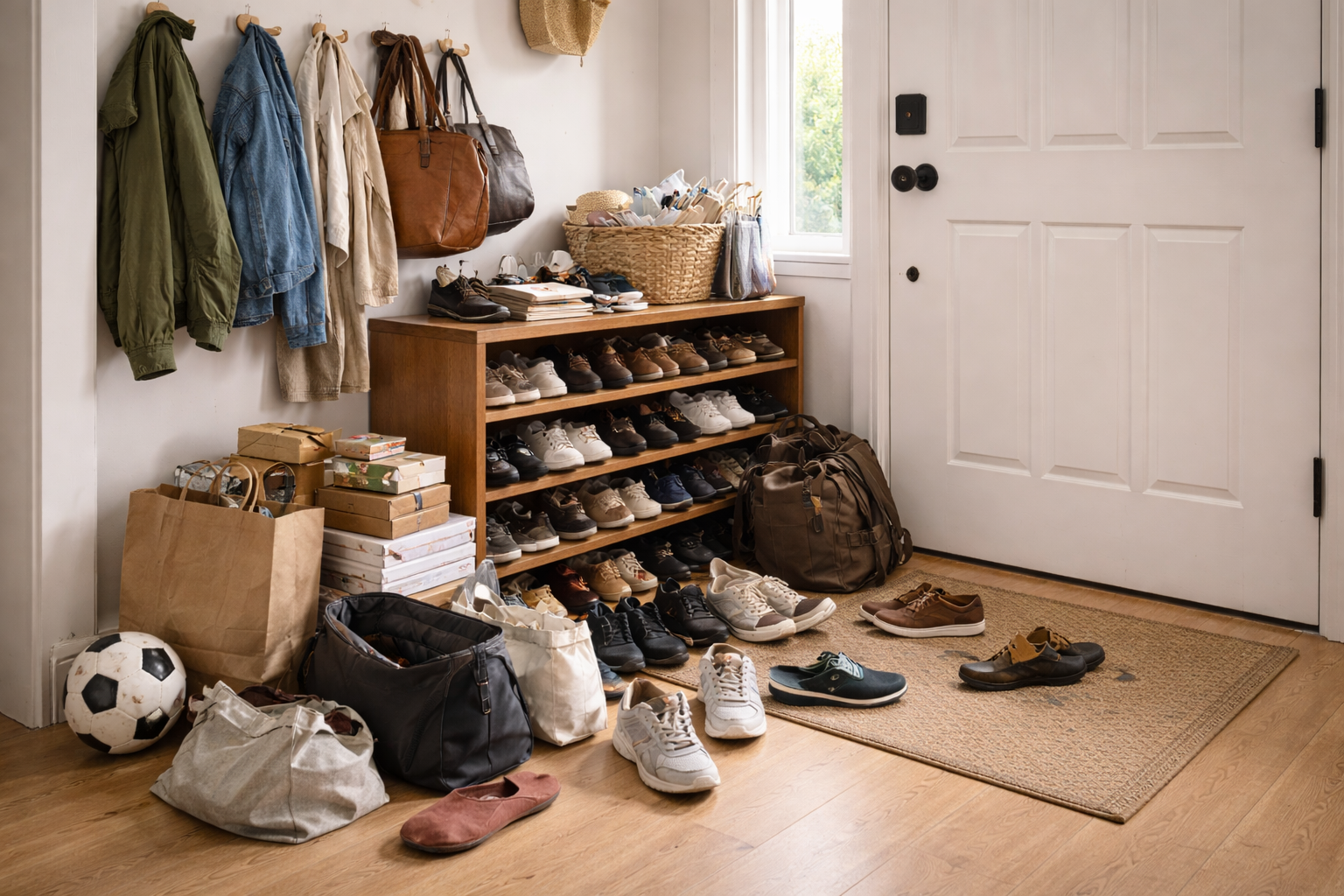 Thực tế, nhiều gia đình có thói quen đặt kệ giày dép, móc treo đồ, hộp chứa đồ ngay sát cửa ra vào nhưng lại không sắp xếp gọn gàng. Giày dép bừa bộn, túi xách chất đống khiến lối đi từ cửa chính vào phòng khách bị vướng víu, vừa bất tiện trong sinh hoạt vừa không tốt về phong thủy.