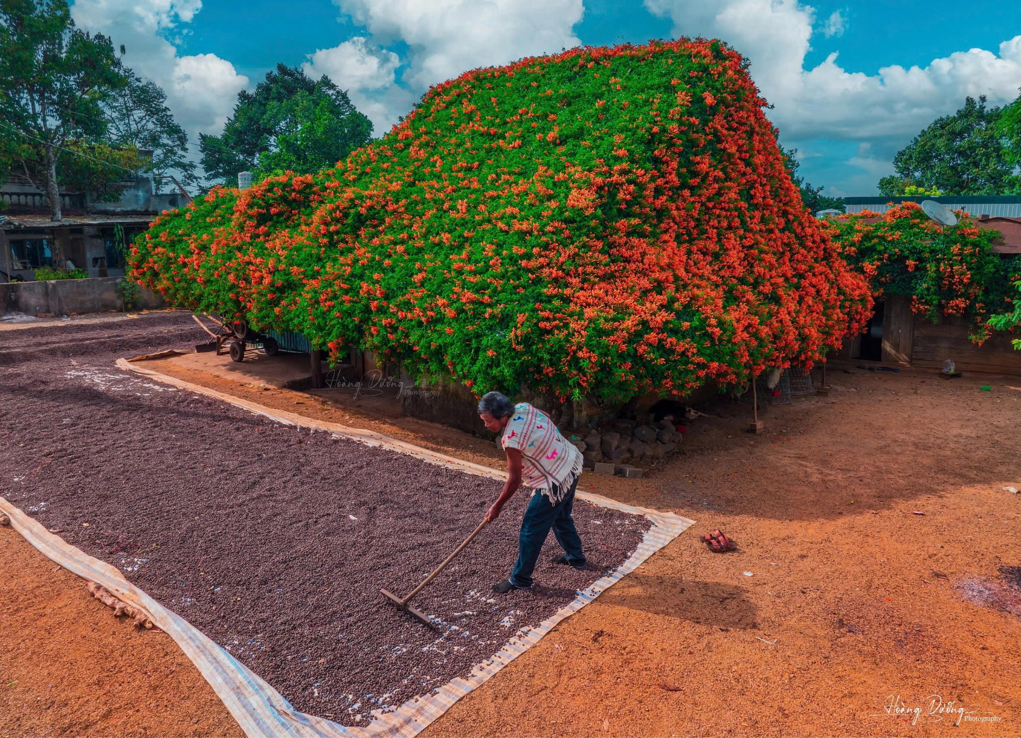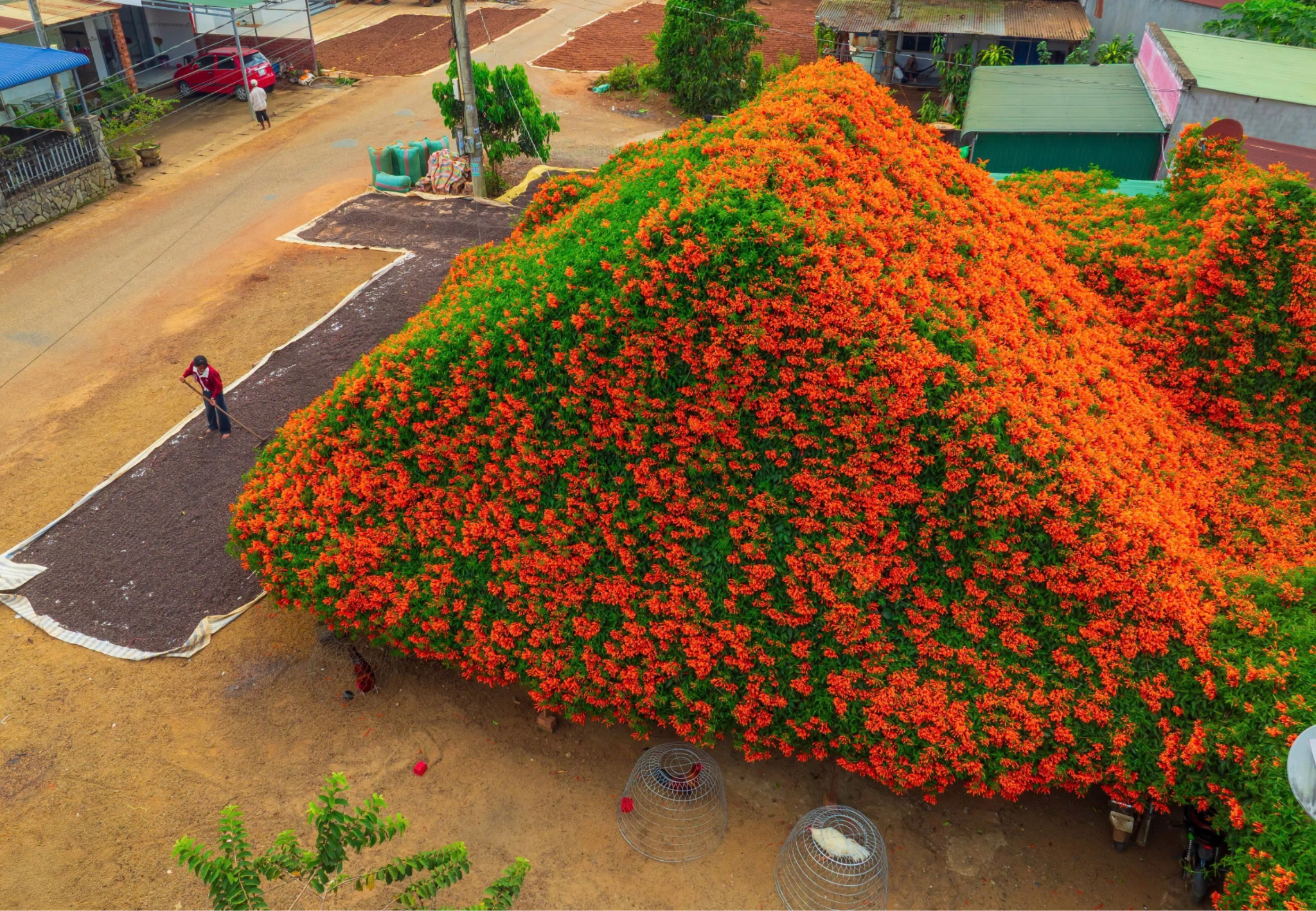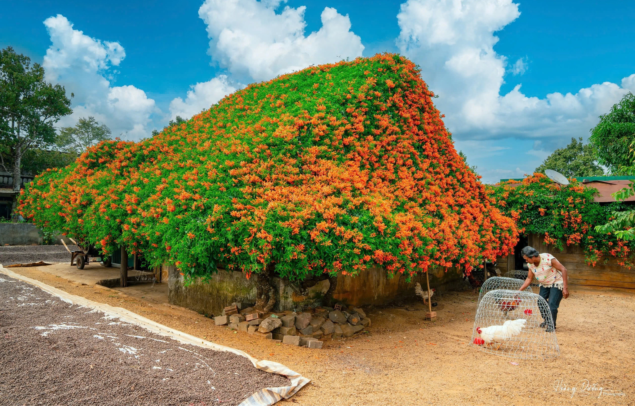 Khung cảnh bình yên trước hiên nhà, nơi nhịp sống sinh hoạt thường ngày vẫn diễn ra dưới tán hoa rực rỡ