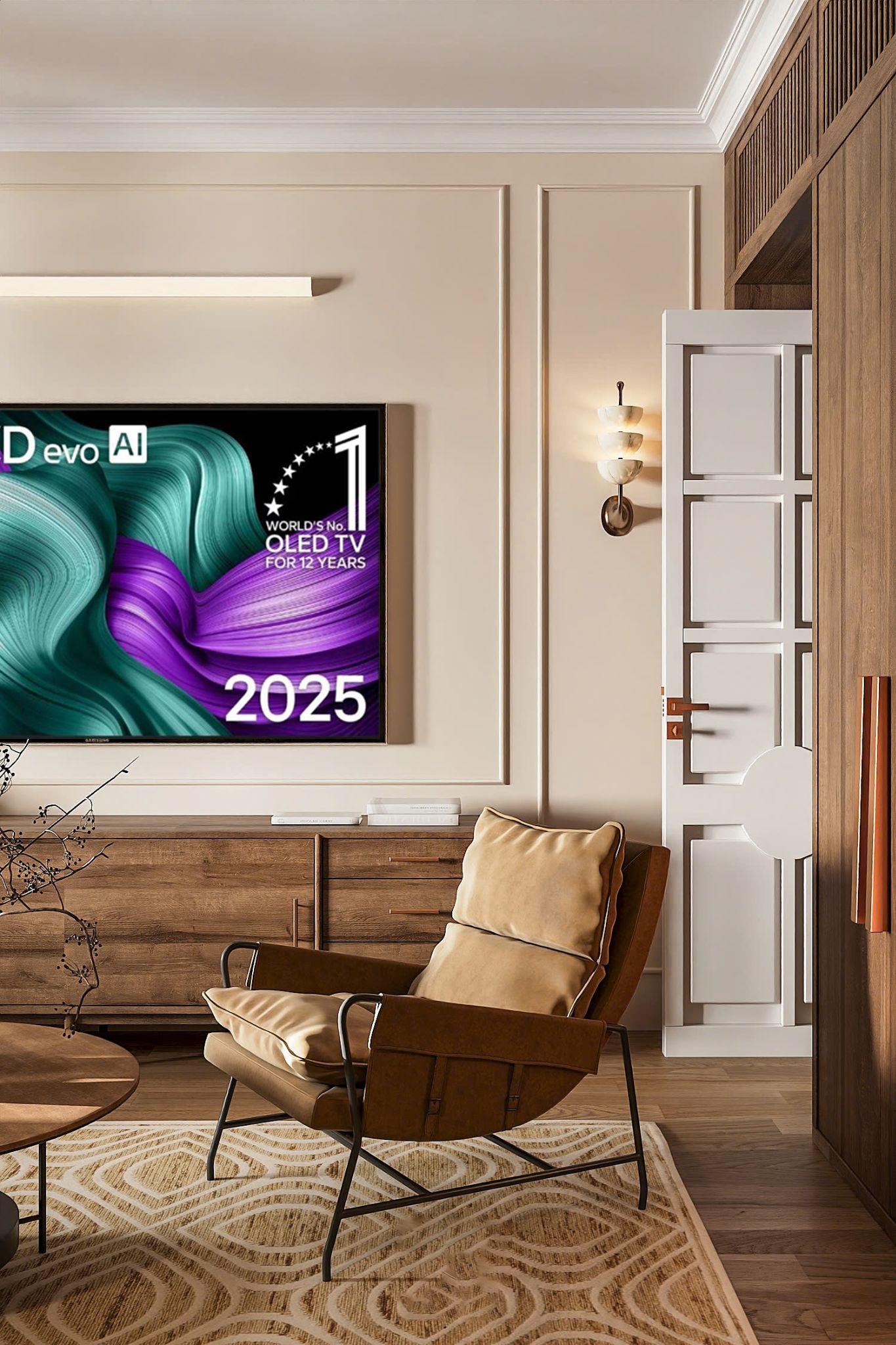 Không chỉ là một không gian sống đẹp, Hồng House còn là tổ ấm của cảm xúc, nơi mọi giác quan được chăm sóc một cách chỉn chu. Phòng khách nổi bật với TV LG OLED M5 siêu mỏng kết hợp loa thanh SG10, mang đến trải nghiệm xem phim, nghe nhạc sống động và tinh tế. Bên cạnh là LG PuriCare AeroFurniture như một chiếc bàn phụ nhỏ xinh, vừa có chức năng lọc khí, vừa đóng vai trò như món đồ nội thất hiện đại.