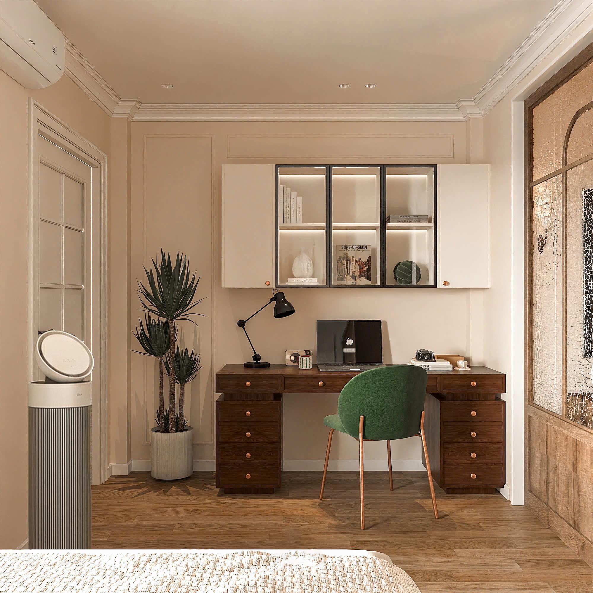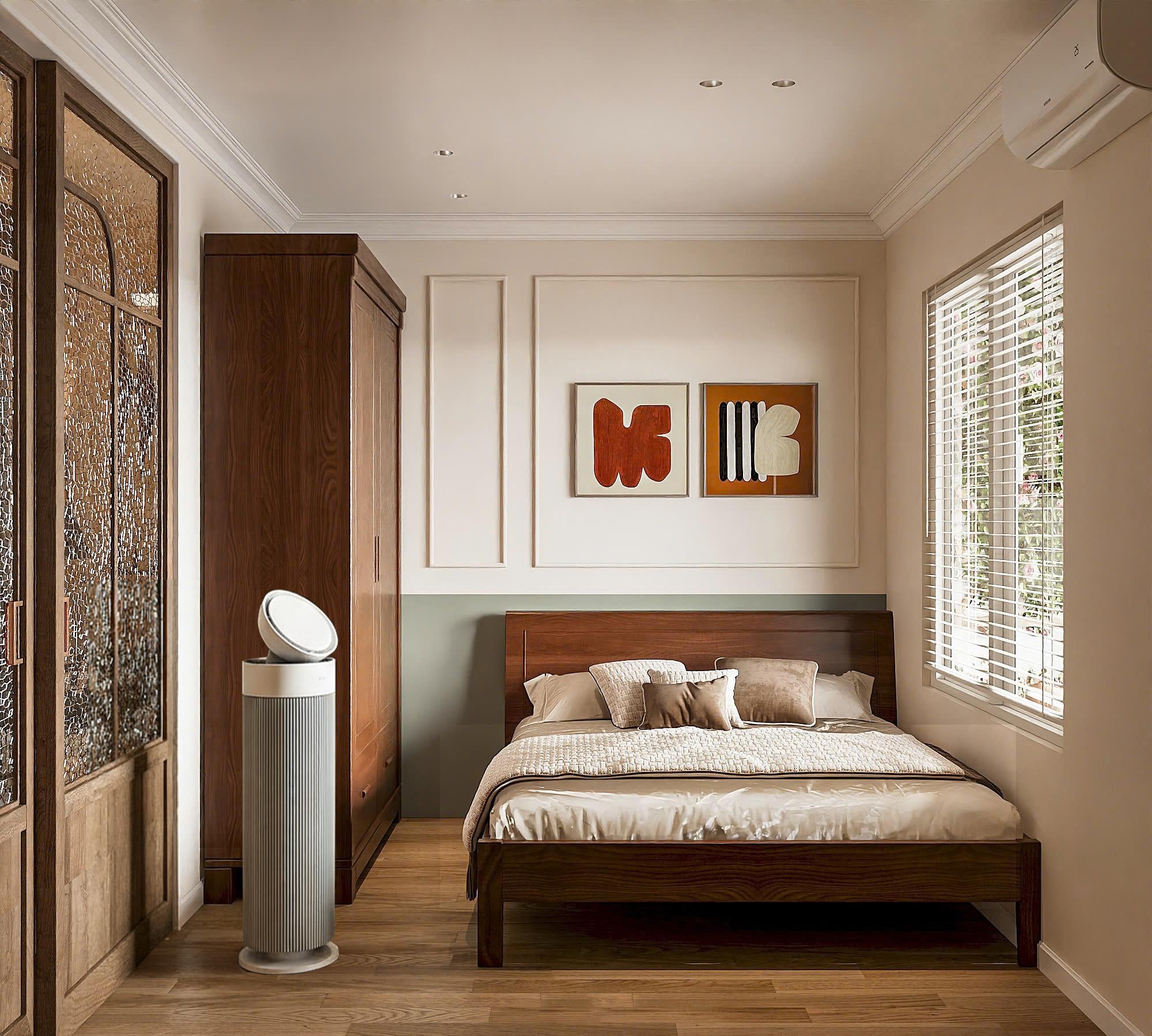 Ở những góc sinh hoạt khác, công nghệ vẫn hiện diện một cách tinh tế: máy lọc không khí LG PuriCare 360 Alpha PET có mặt ở phòng ngủ, phòng làm việc, không chỉ đảm bảo chất lượng không khí trong lành mà còn là điểm nhấn thẩm mỹ với thiết kế dạng trụ thanh thoát.