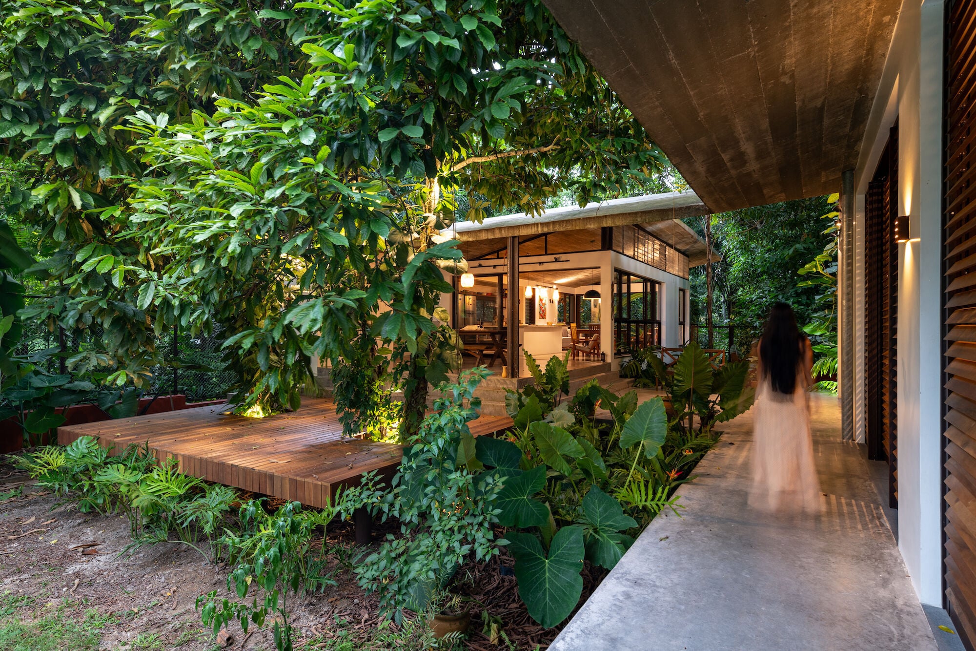 Lối đi lát gỗ men theo các khối nhà, giữ nguyên cây lớn và thảm thực vật hiện hữu. Kiến trúc được tổ chức để né cây thay vì chặt bỏ, giúp cảnh quan phát triển tự nhiên