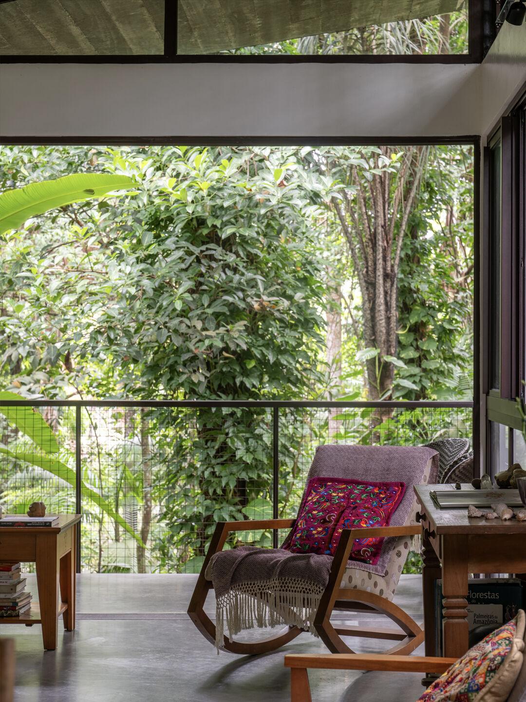 Một góc nghỉ ngơi yên tĩnh đặt sát cửa kính, hướng thẳng ra khu rừng phía trước. Không gian này được thiết kế để gia chủ có thể đọc sách, thư giãn và quan sát thiên nhiên