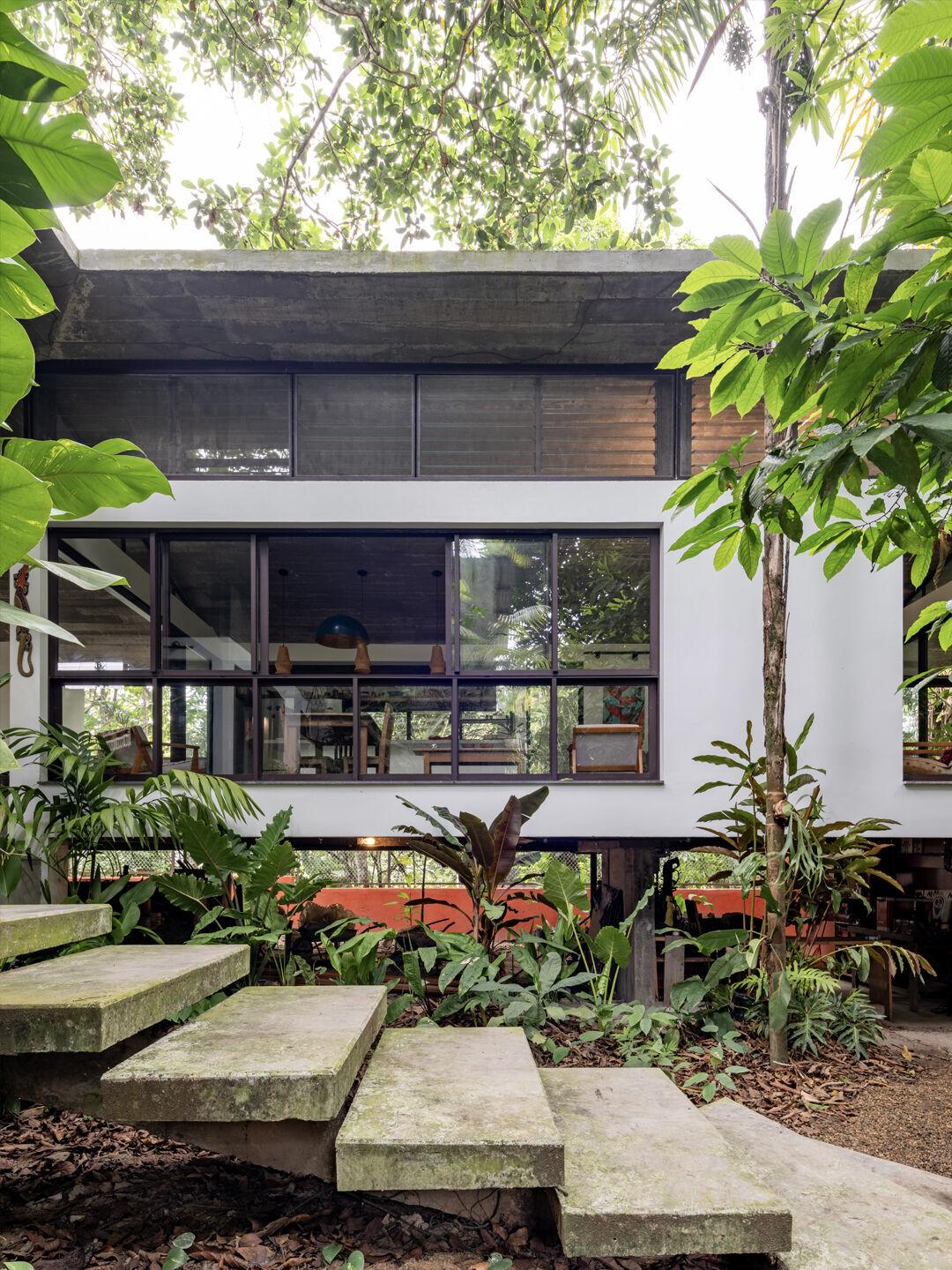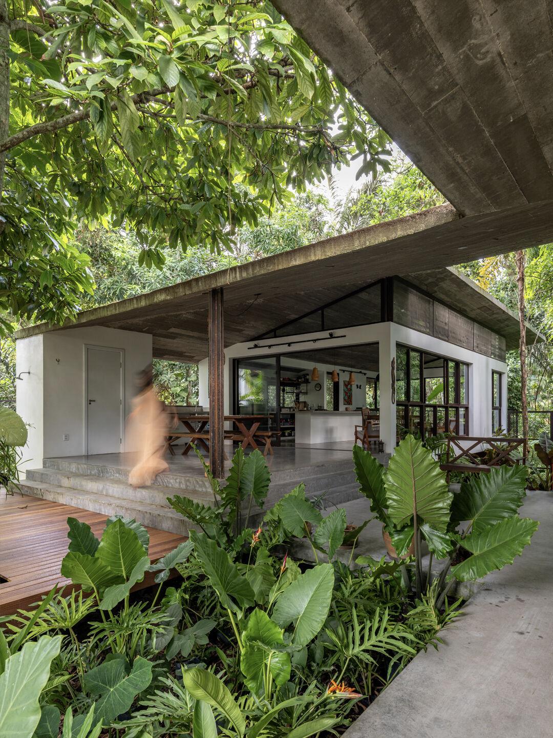 Lối tiếp cận vào ngôi nhà len giữa thảm cây xanh rậm rạp, với sàn gỗ và mái bê tông vươn dài che phủ. Kiến trúc gần như ẩn mình trong rừng, tạo cảm giác bước chậm lại ngay từ khoảnh khắc đầu tiên