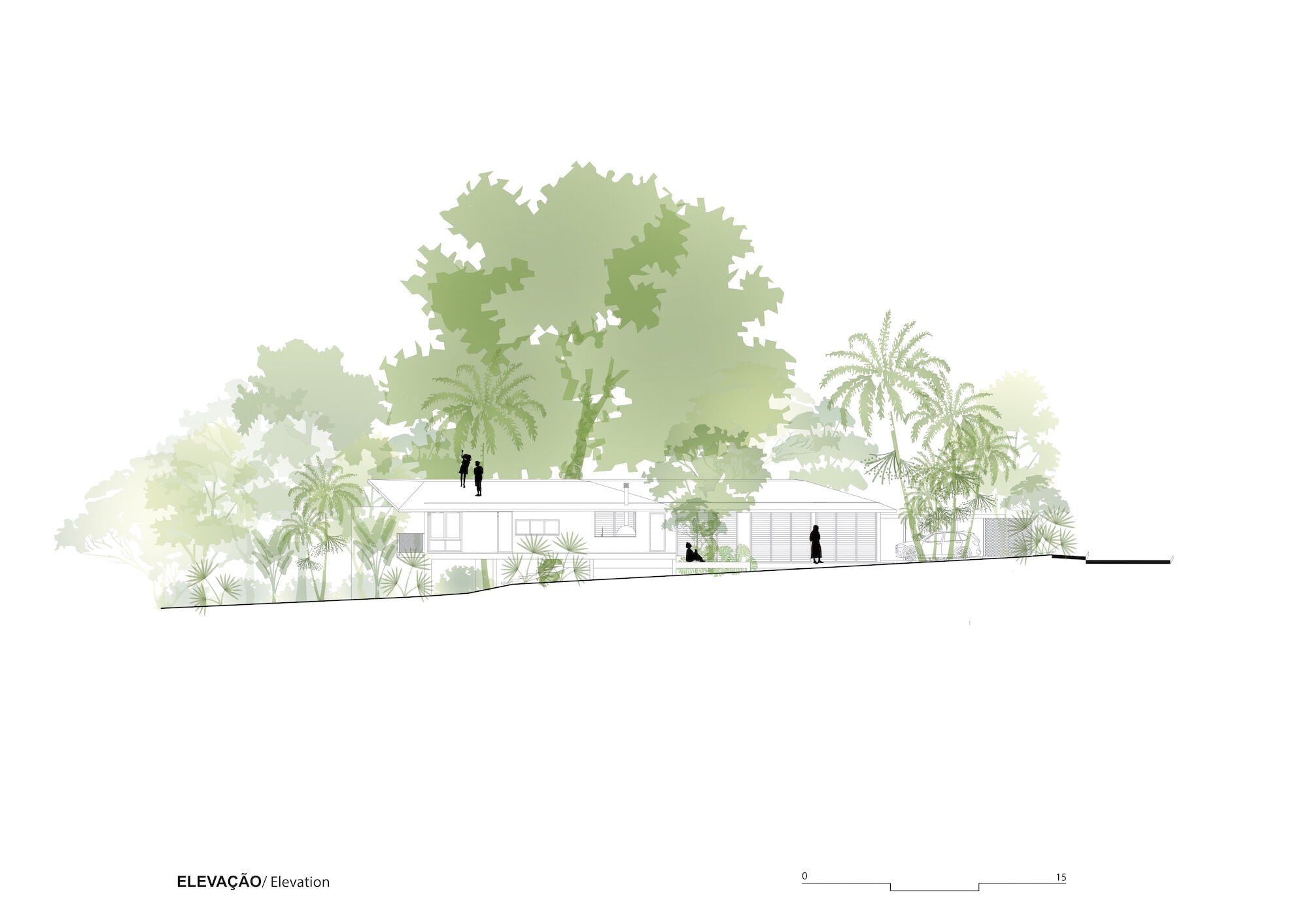 Mặt đứng cho thấy mái bê tông dốc lớn vươn dài, che phủ toàn bộ không gian sinh hoạt. Công trình có chiều cao thấp, hòa vào tán cây thay vì nổi bật giữa cảnh quan