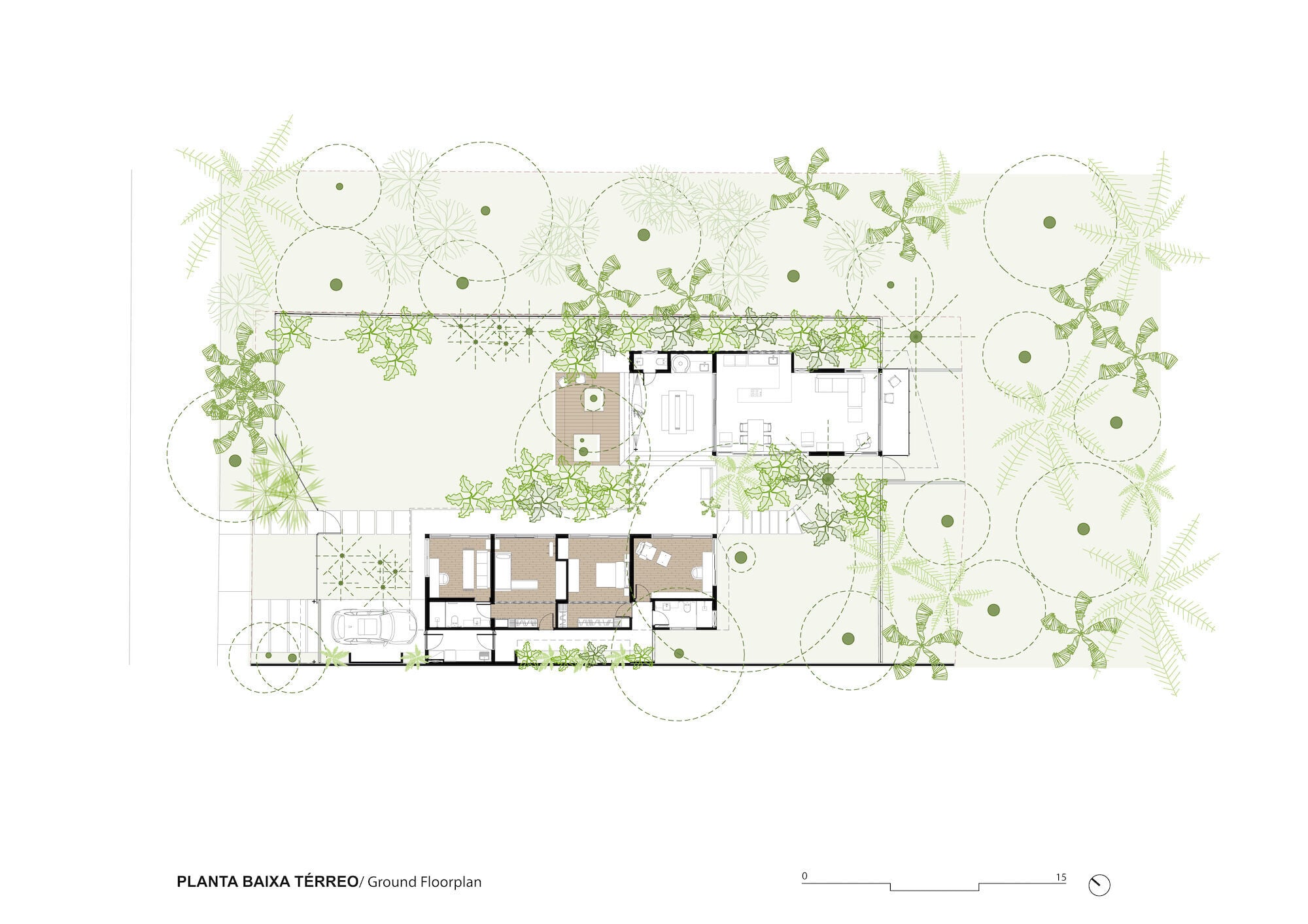 Một trong những điểm đặc biệt của Casa Cajuí nằm ở cách tổ chức mặt bằng theo từng lớp không gian, phù hợp với nhu cầu sinh hoạt và mức độ riêng tư khác nhau.